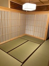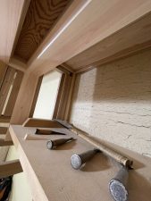 この日k池棟梁はお休みでしたが、刃物類は、小さいお子様は目の届かない安全な位置の棚に整列されていました。和室はイナゴ天井が施されました。形状が猿の形に似ている「猿棒」で無垢材(杉)の天井板を支えています。