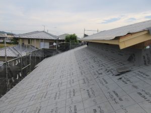 屋根の化粧板が張られたところにルーフィングを敷き、流水テープ施工まで進んだところです。