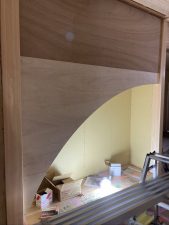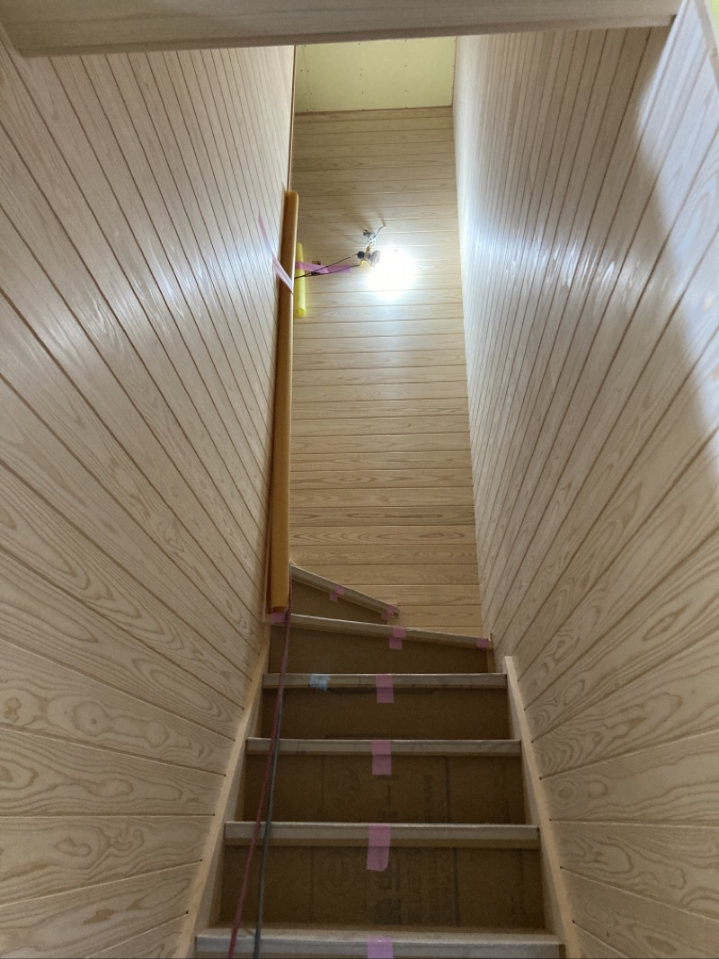 k大工さんは階段室壁の羽目板張りをしています。階段下は空いたスペースに飾り棚があり、階段なりに垂れ壁を斜めに下げています。