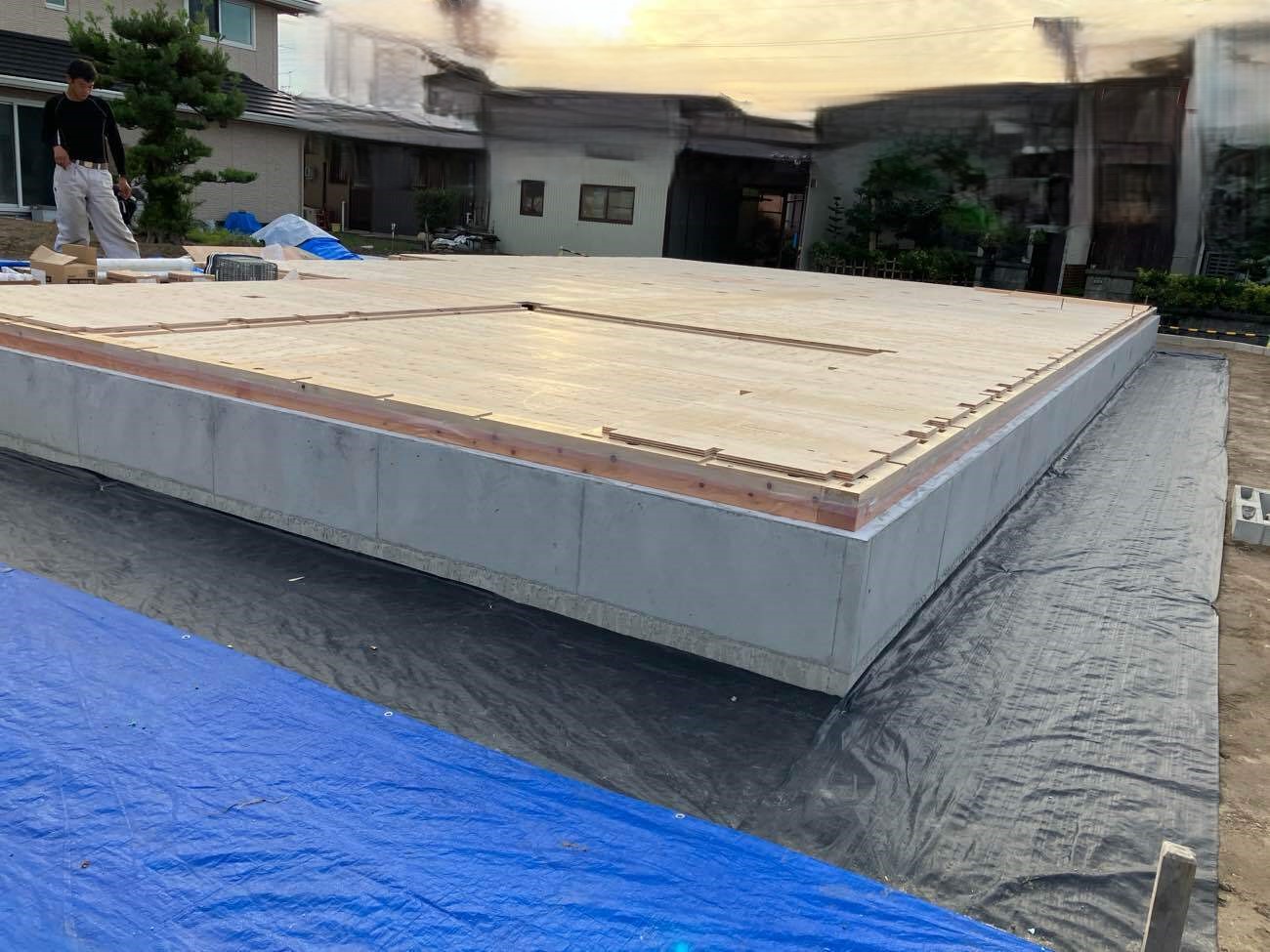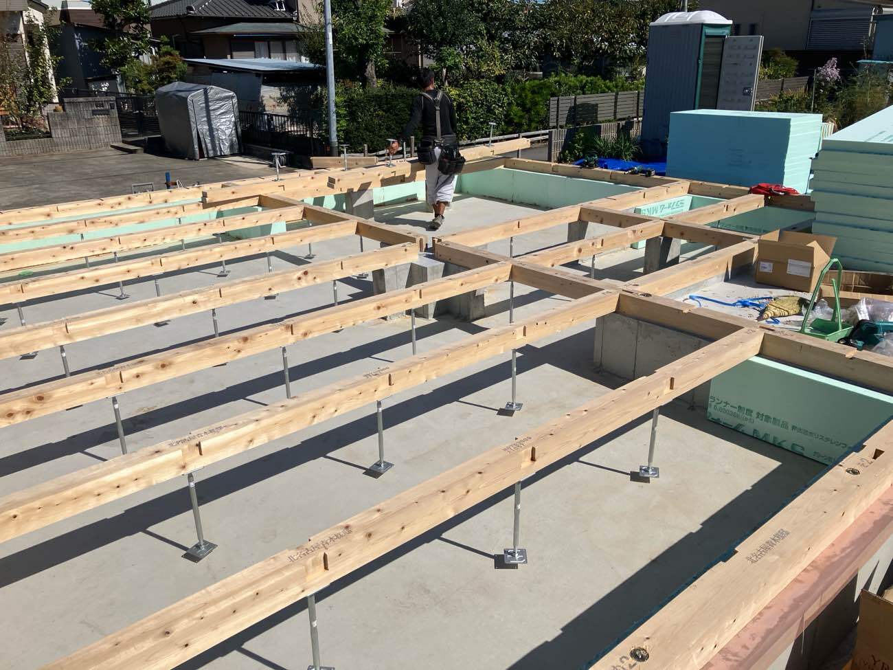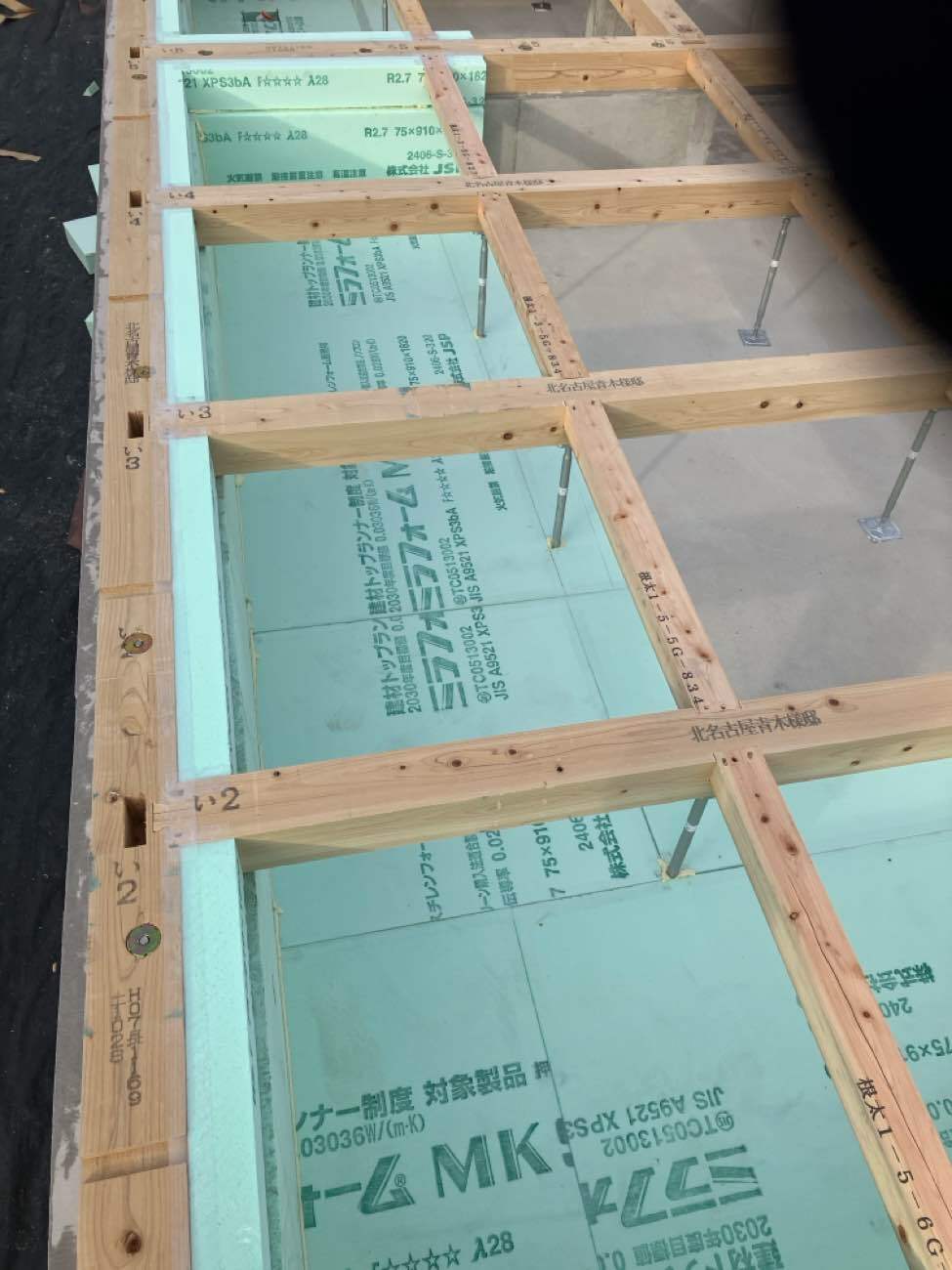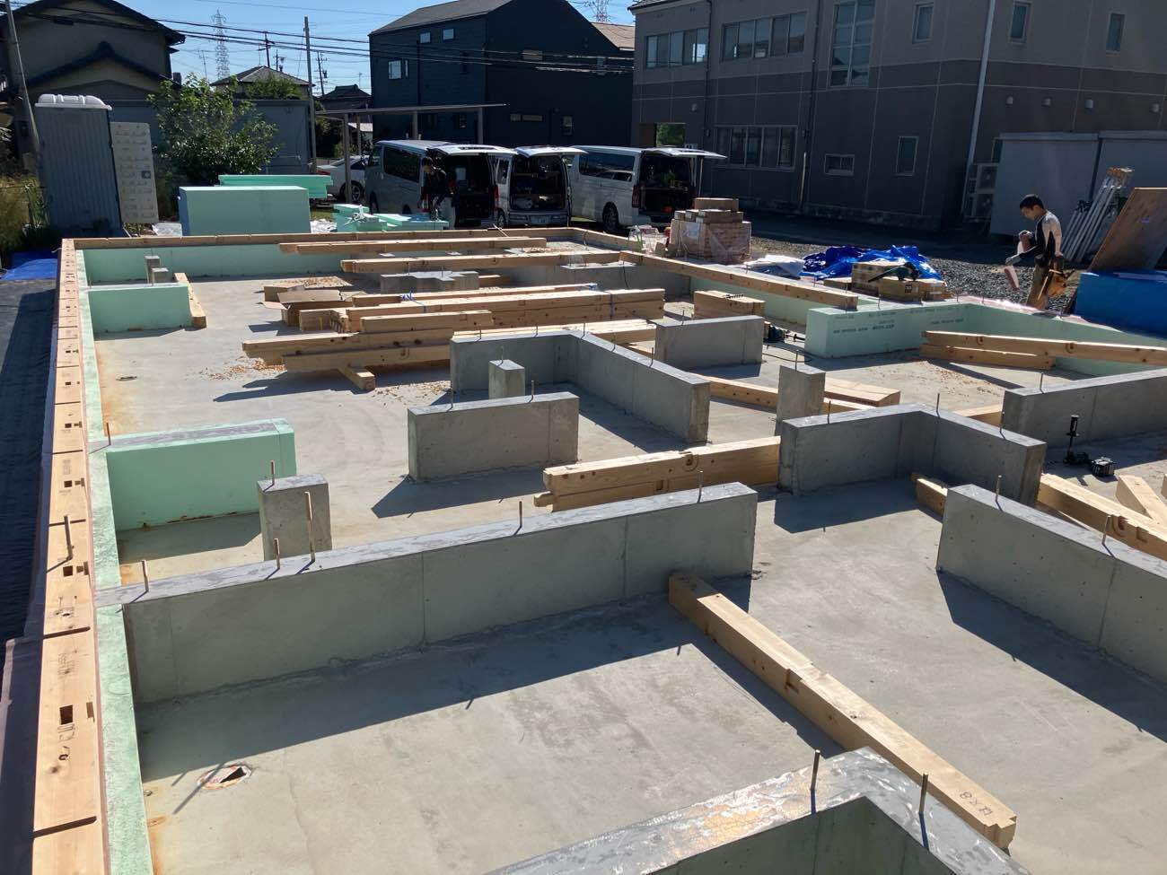 h典棟梁率いる若手大工陣で土台伏せが行われました。10月なのに9月並みの暑い日が続いているとは言われつつも、作業しやすい良い季節です👍基礎内断熱のスカート断熱もこの土台伏せの際に敷いていきます。