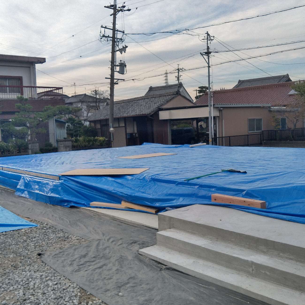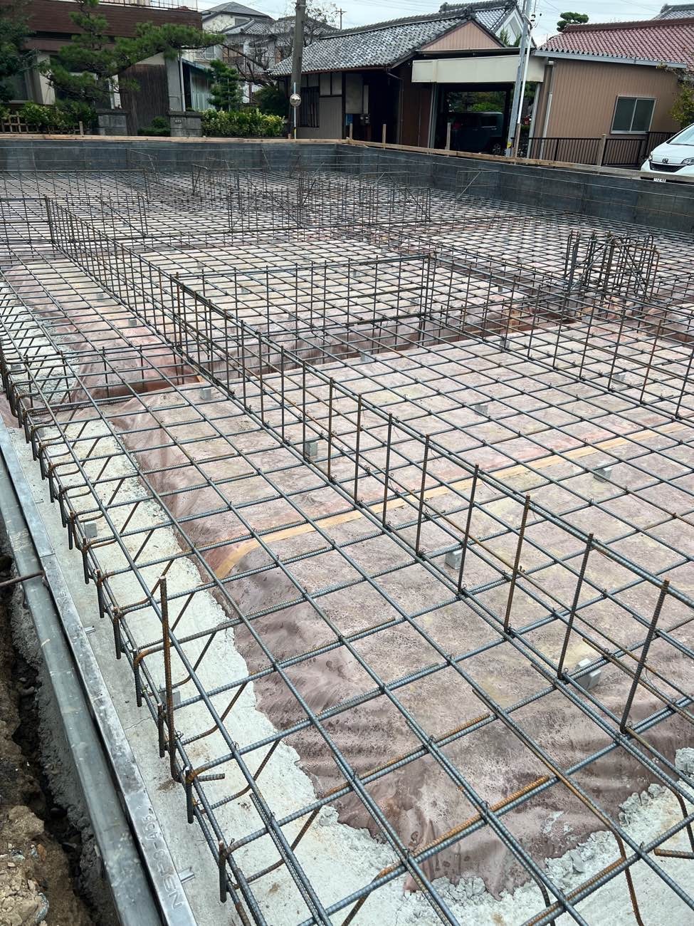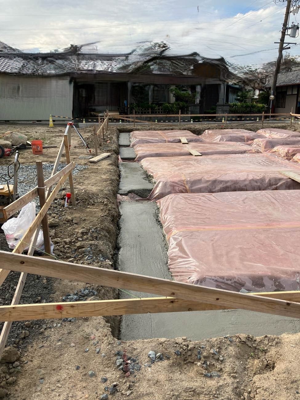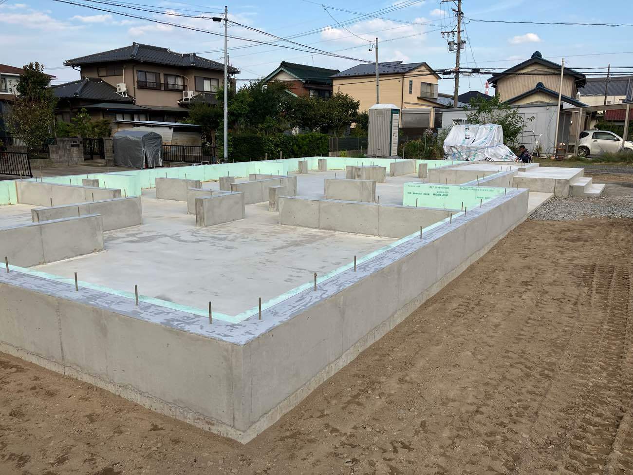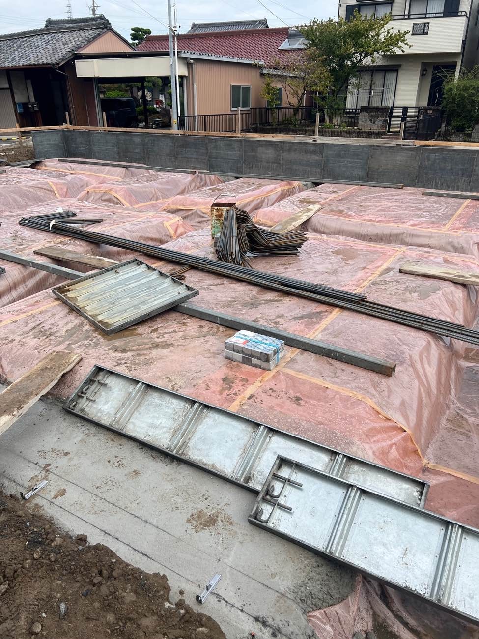 h典棟梁率いる若手大工陣で土台伏せが行われました。10月なのに9月並みの暑い日が続いているとは言われつつも、作業しやすい良い季節です👍基礎内断熱のスカート断熱もこの土台伏せの際に敷いていきます。