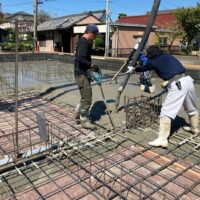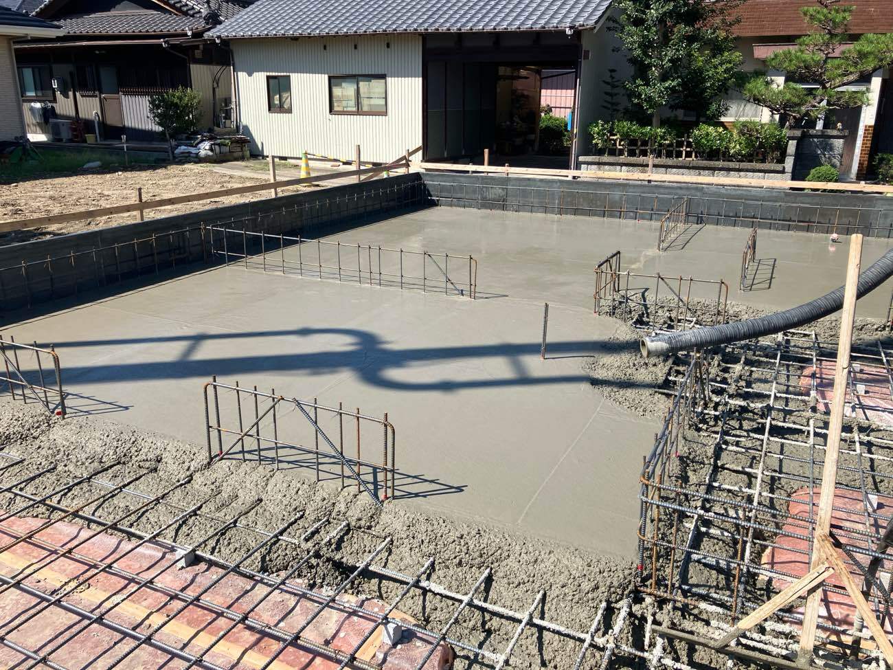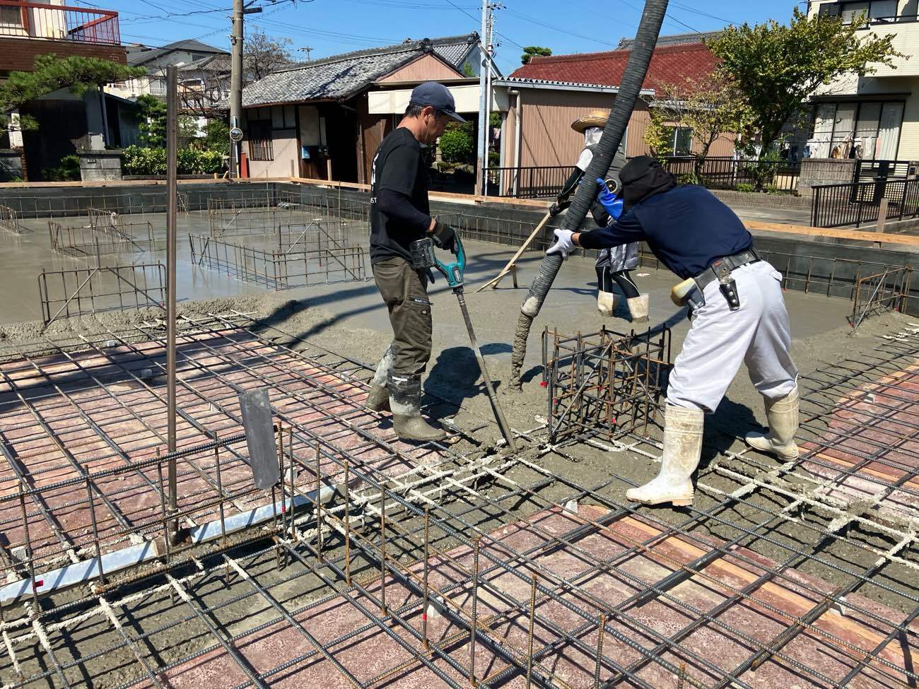 1日に基礎底盤のコンクリートを打設。10月と言うのに30度を超す暑さの中、基礎部隊のt広さん達が打設作業を行っている様子です。