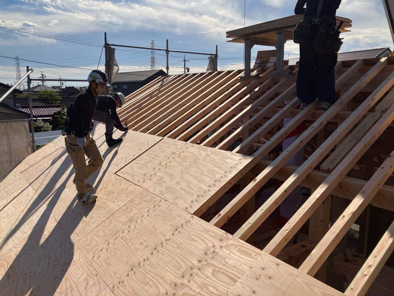 先週の建て方2日目の様子です。山の斜面の様な急勾配💦今回は5.5寸。太陽光パネルに光が当たる角度は30度程が望ましいと言われているので、効率的に発電できそうです👍