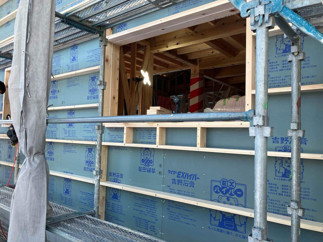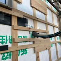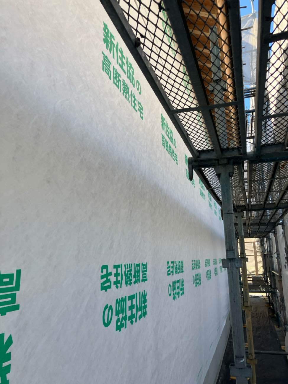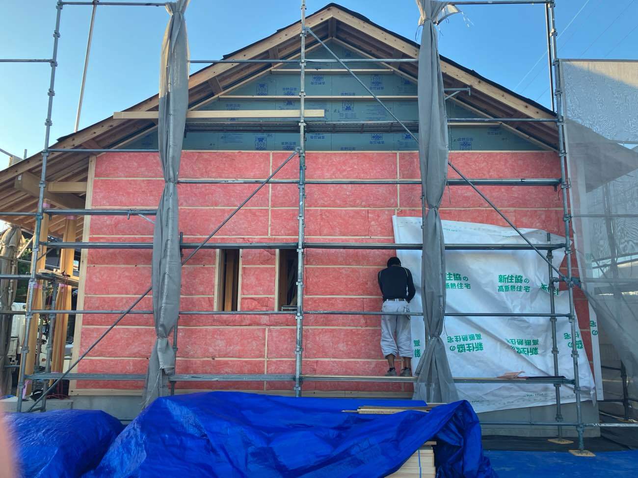 付加断熱の施工が終わり、透湿防水シートも張り終えました。通気工法の為、この後通気胴縁を取り付けていきます。通気層(空気層)を設けると、外装からの熱を直接伝えず、壁体内の湿気を排出し結露を防ぎ、万が一外装材から浸入した雨水を排出する事ができるので、建物の耐久性能も高まります👍