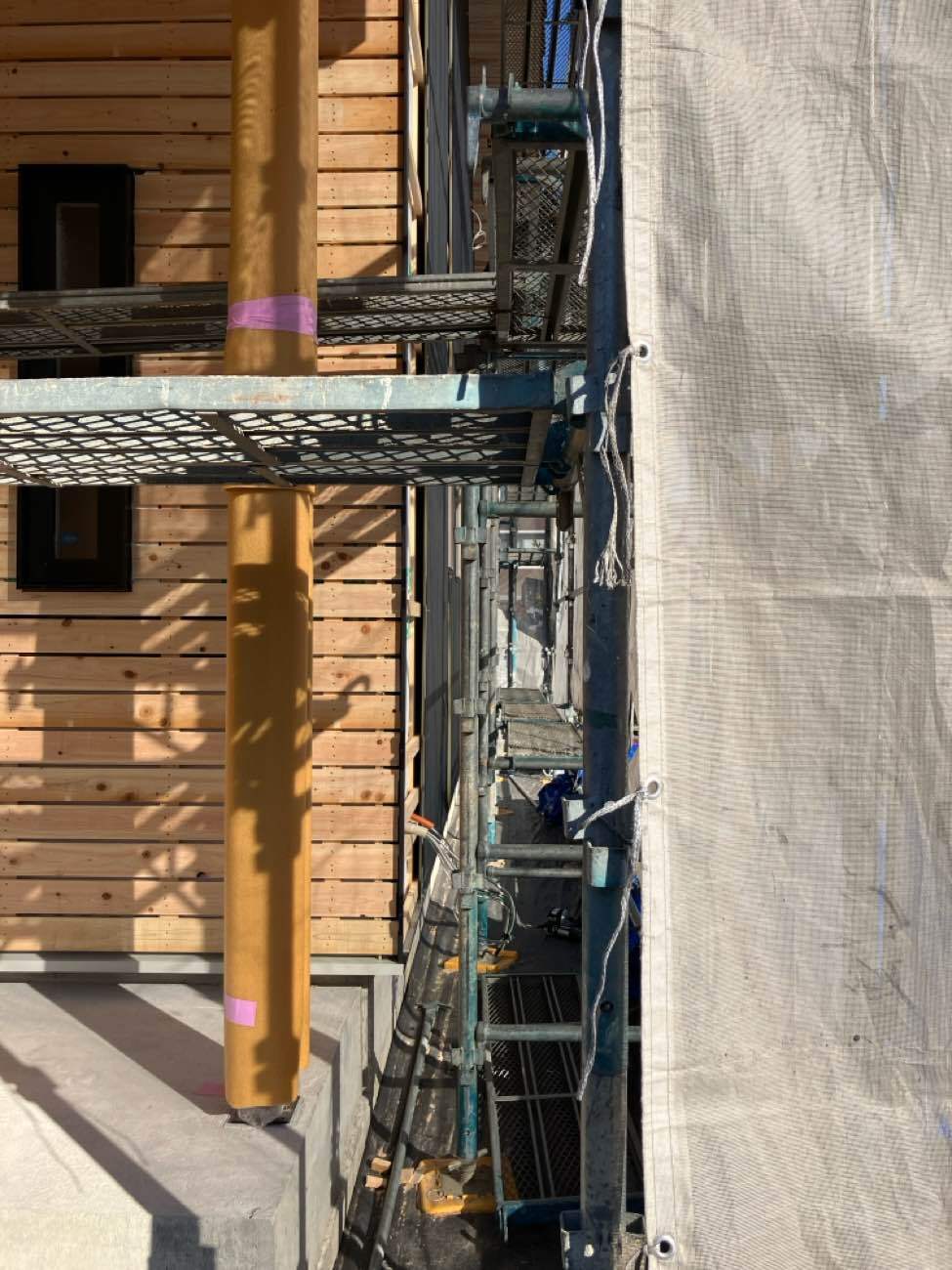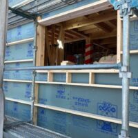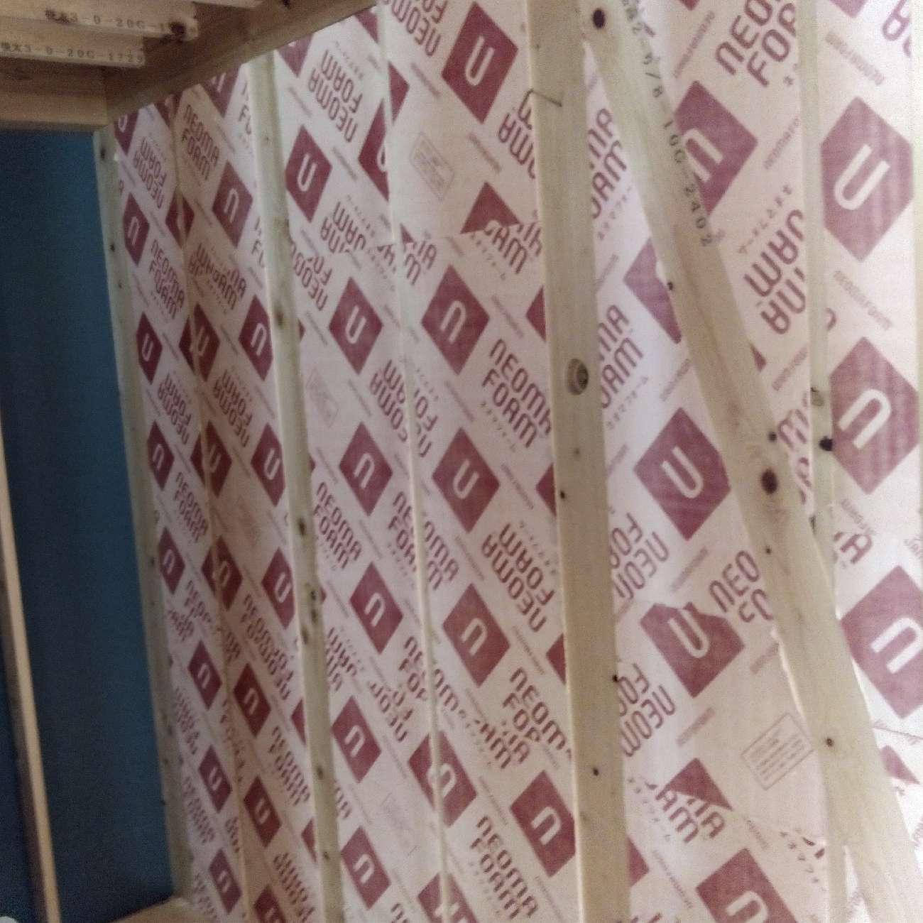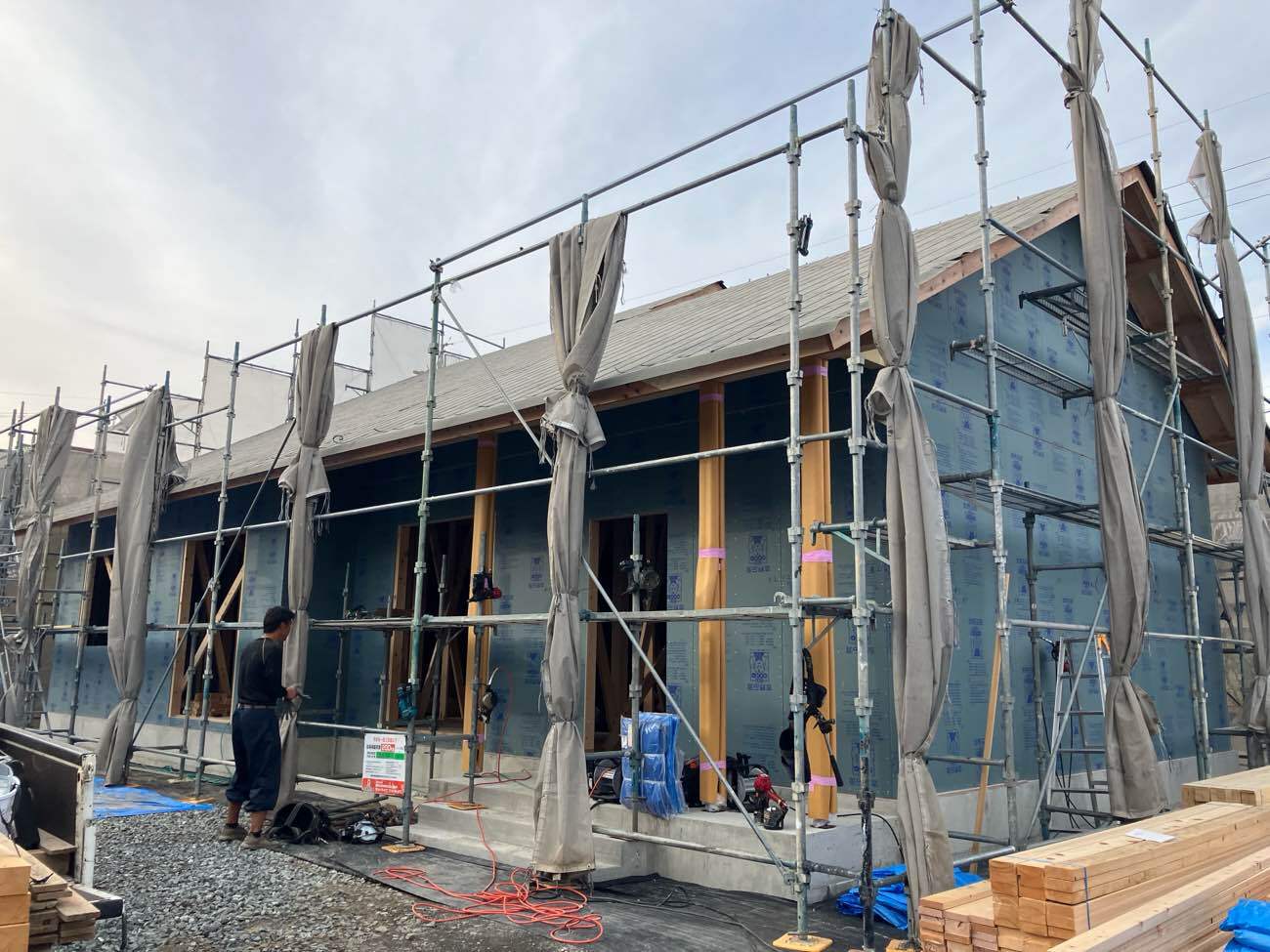 付加断熱の施工が終わり、透湿防水シートも張り終えました。通気工法の為、この後通気胴縁を取り付けていきます。通気層(空気層)を設けると、外装からの熱を直接伝えず、壁体内の湿気を排出し結露を防ぎ、万が一外装材から浸入した雨水を排出する事ができるので、建物の耐久性能も高まります👍