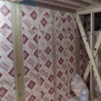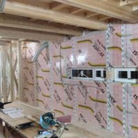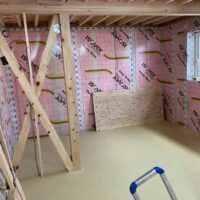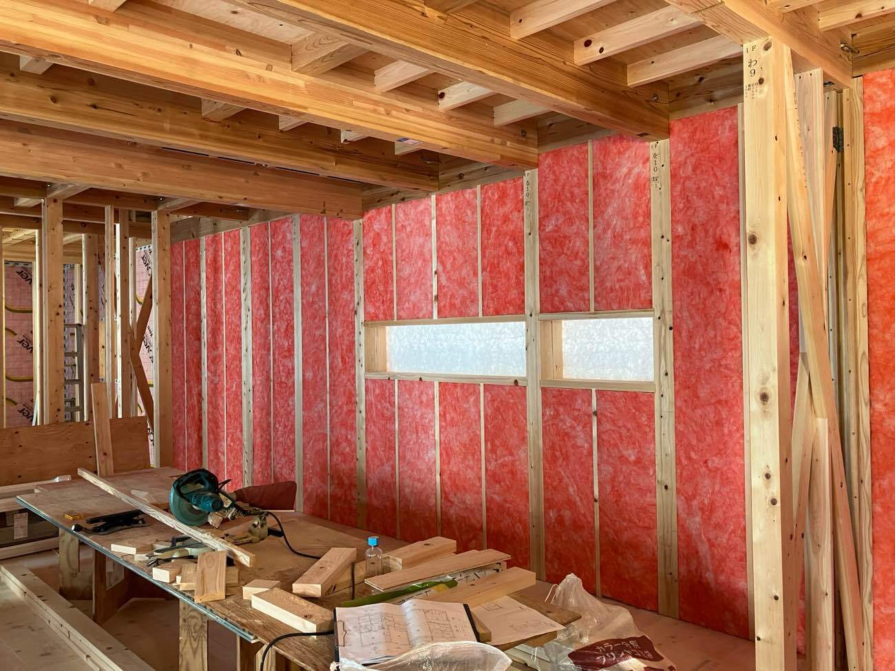 内部は、中間検査が終わり、断熱材を入れています。全体の充填断熱と付加断熱はグラスウールですが、小屋裏と内壁が接する場所には、厚みを抑えても性能を確保できるネオマフォームを採用しています。