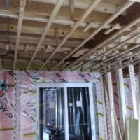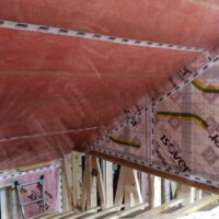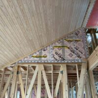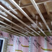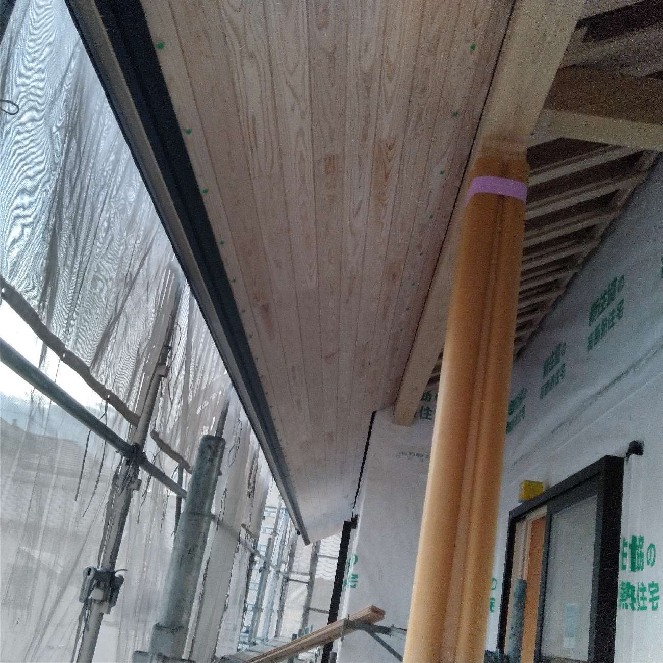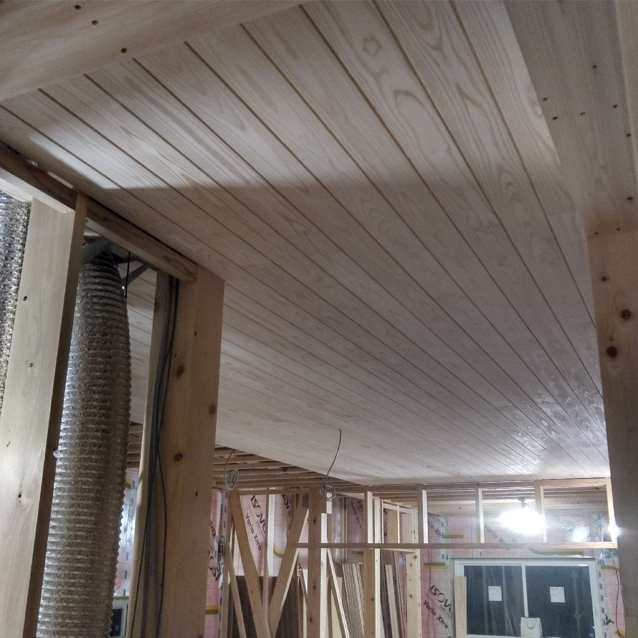 内部は勾配天井部分の断熱材も入れ終え、軒裏の羽目板を張っています。