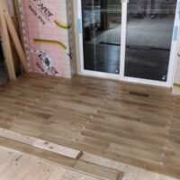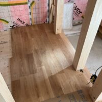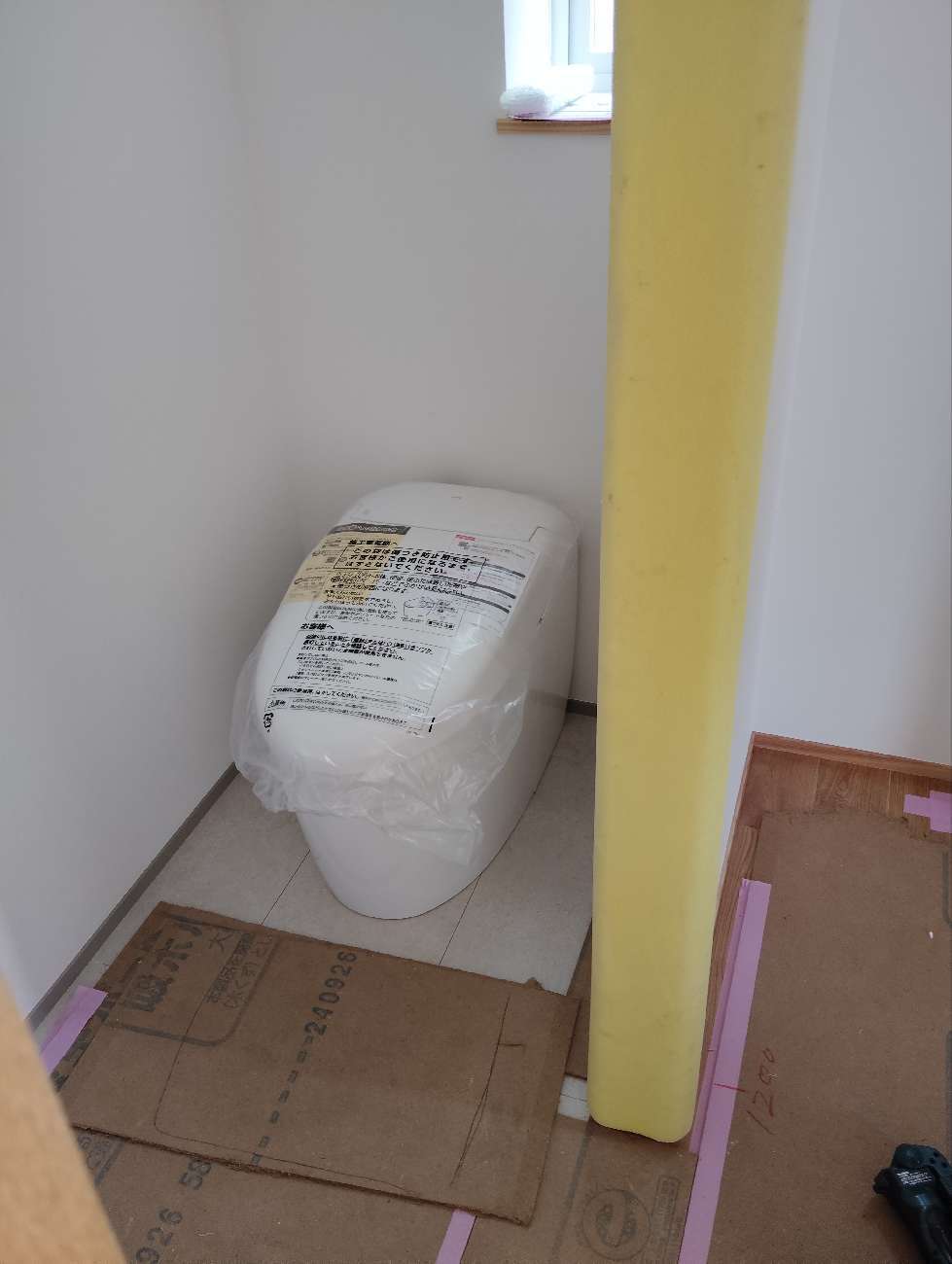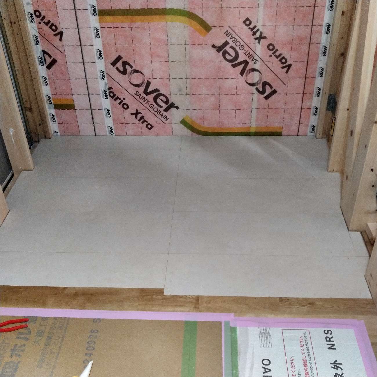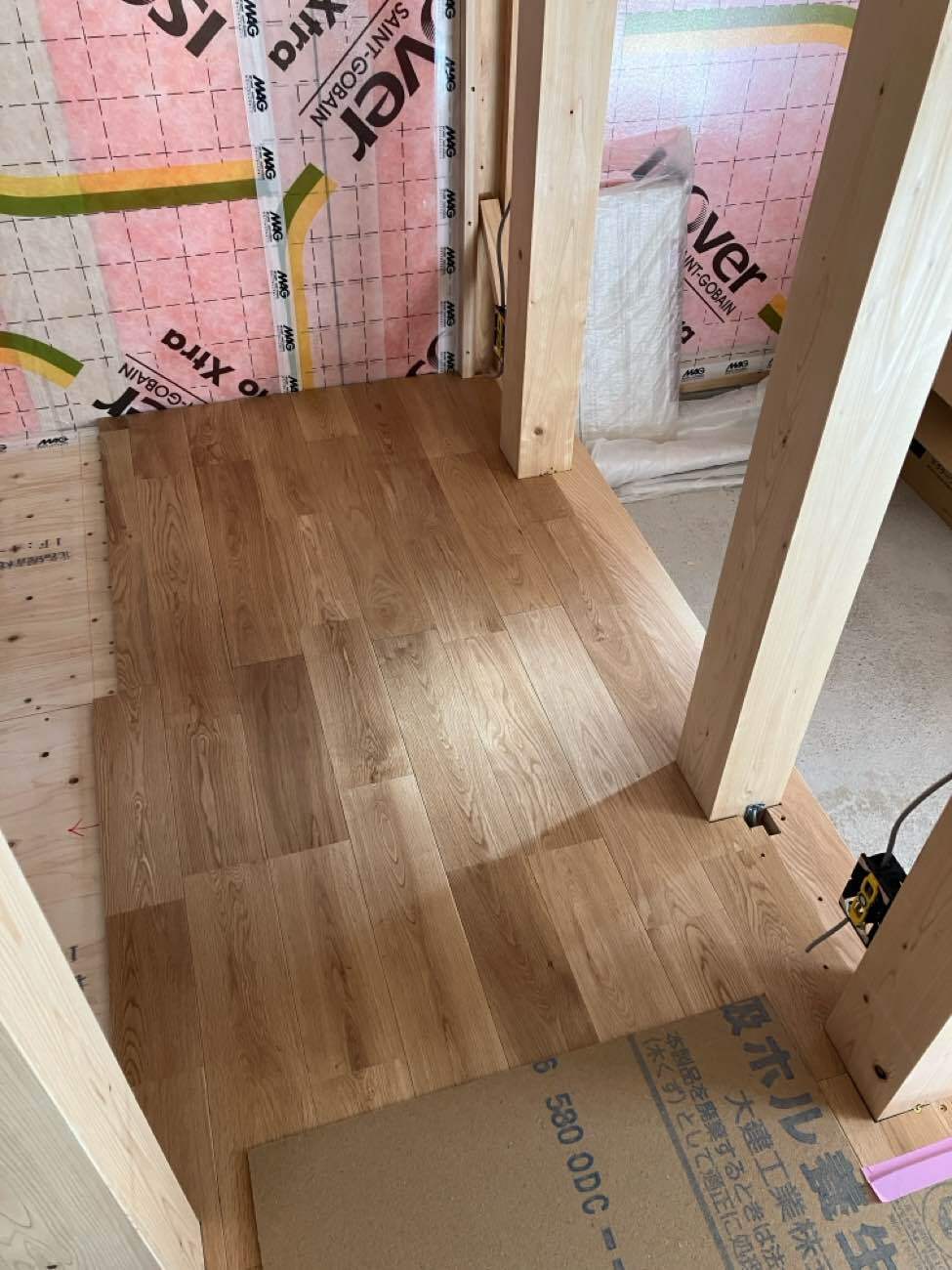 水廻りの床材を張り終えた様子です。ジョイントの目地が、便器の中央にならない様に割り付けたり、細かなところにも配慮して張っています👍