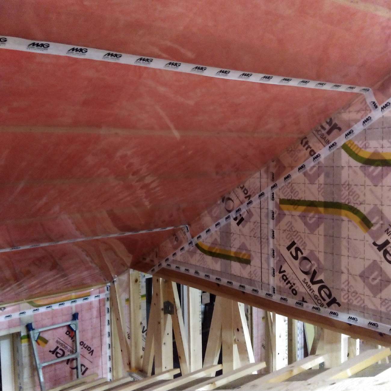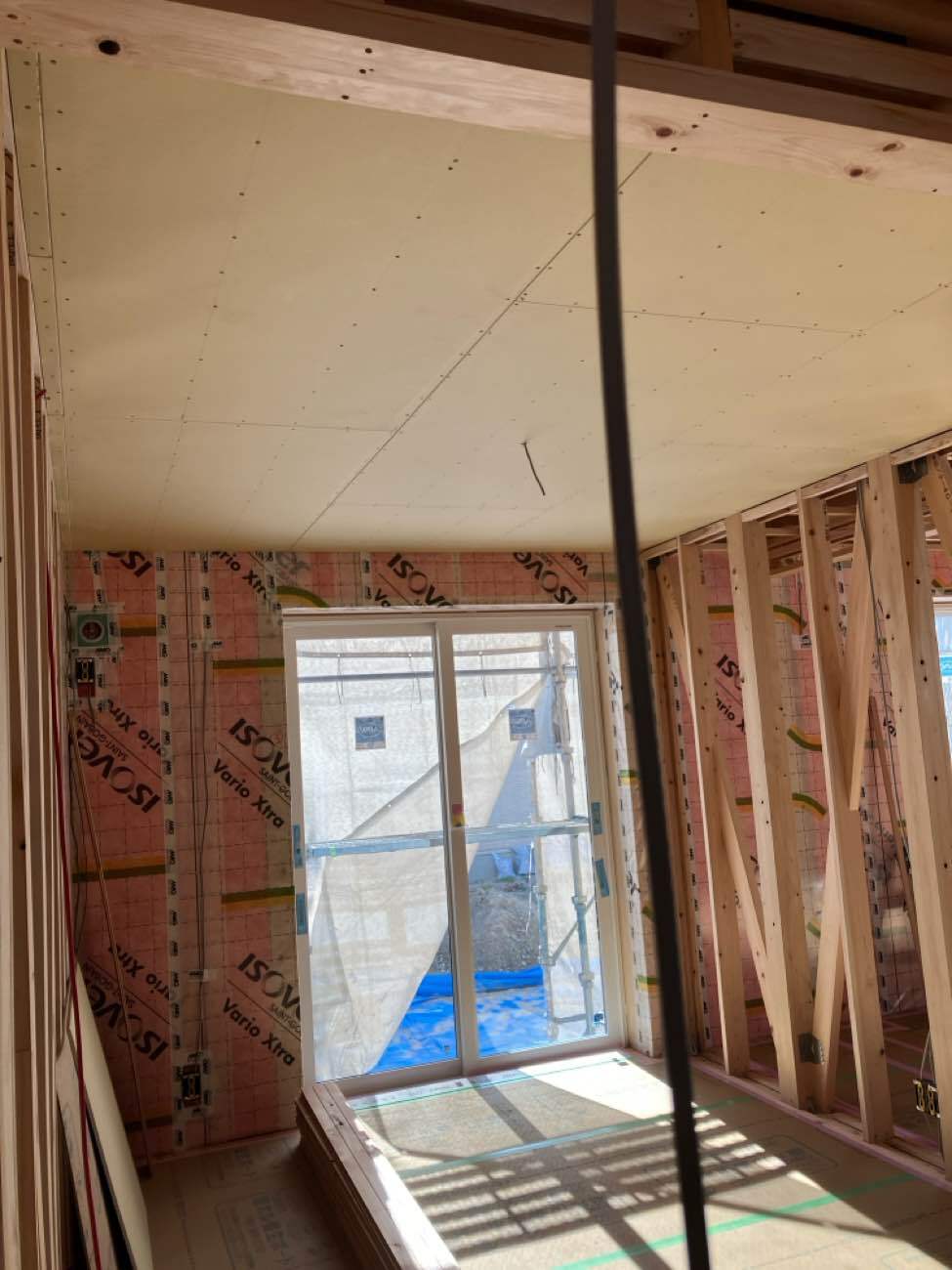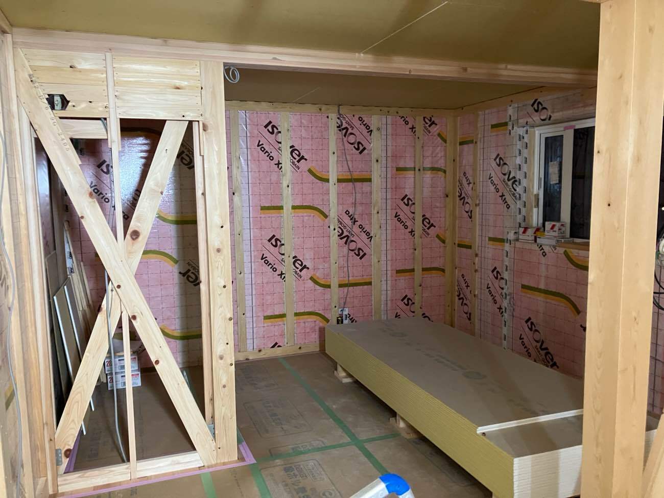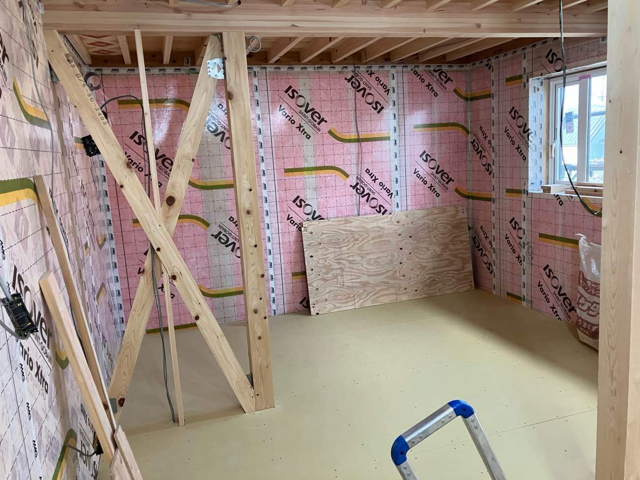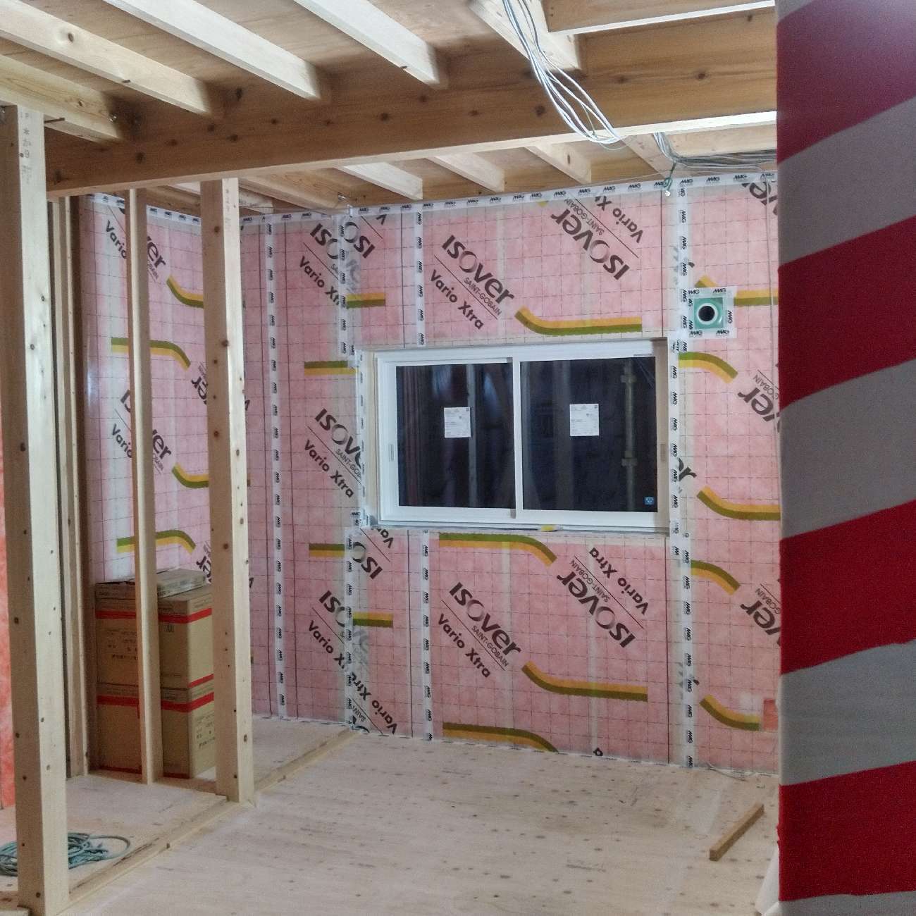 内部も、充填断熱を柱と間柱の間に入れ、可変性調湿気密シートを張っています。きれいにぴっちり、きれいで気持ちがいい👍h典棟梁📸アングルもいい感じ。ありがとうございます!