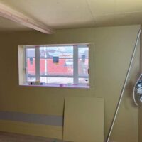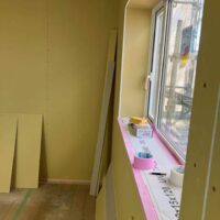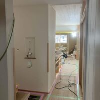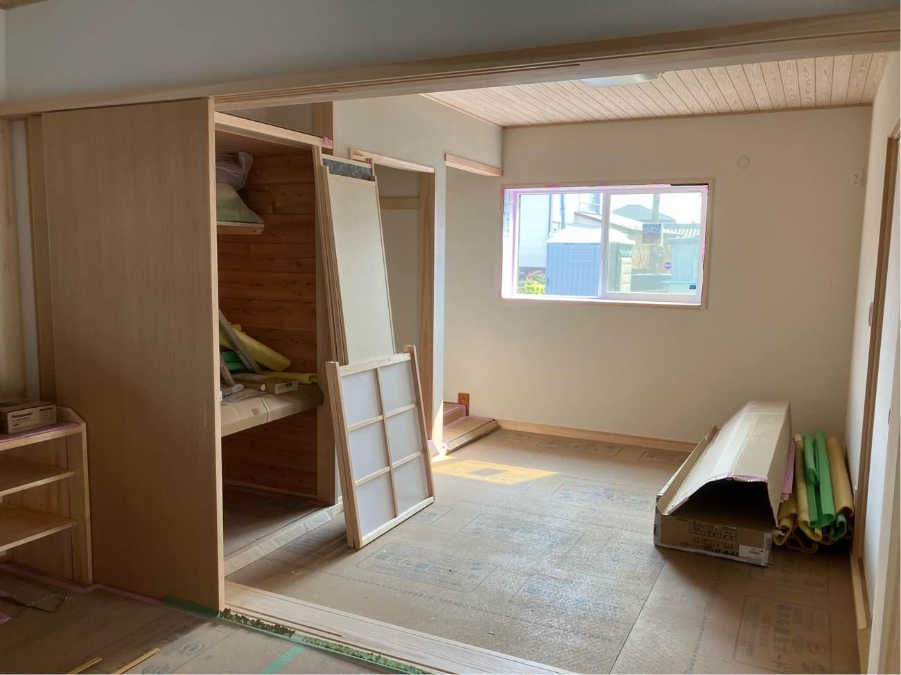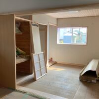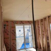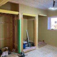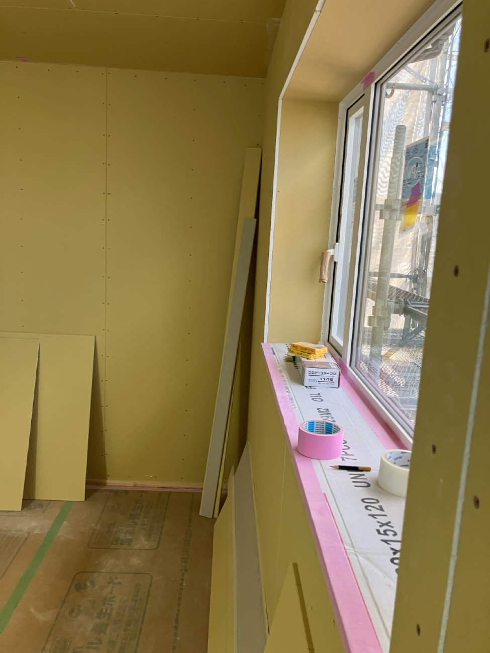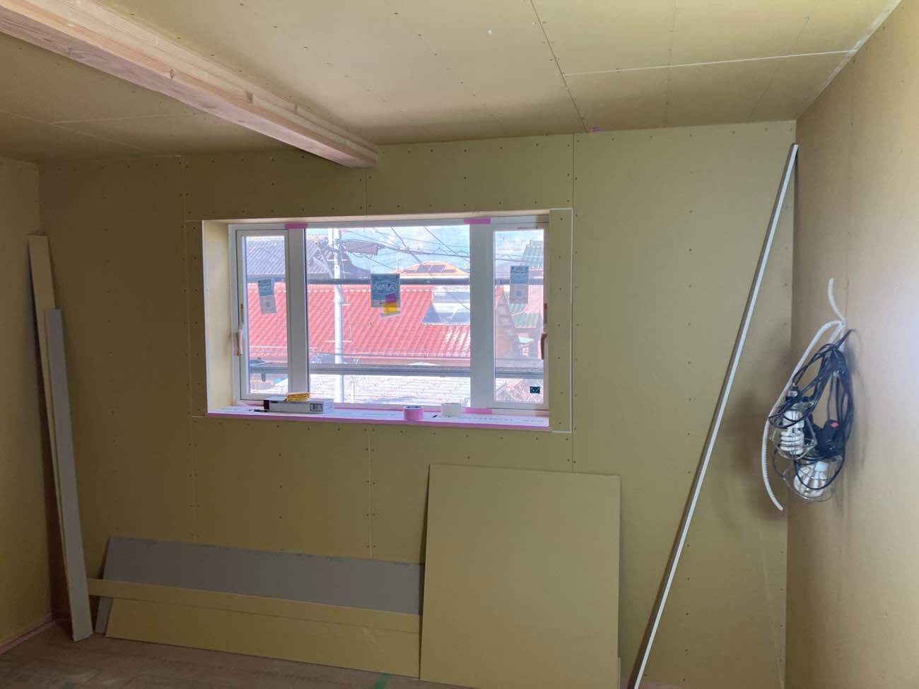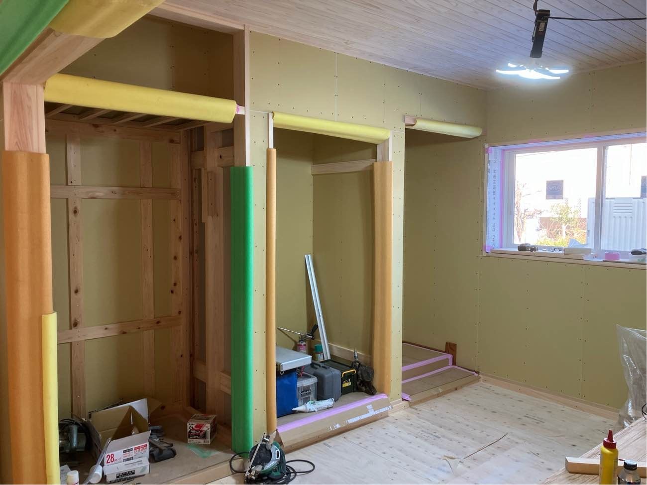 工場で加工した建具枠等も取り付けられ、造作工事の終わりが見えてきています。仕上げの下地プラスターボードを張り始めました。