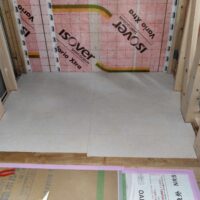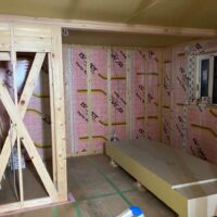 内部は1階はフローリング張り、2階は床下地と天井のプラスターボードを張っています。2階の床下地にプラスターボードを張る事で、1階への一定の音域に対して遮音効果があります。