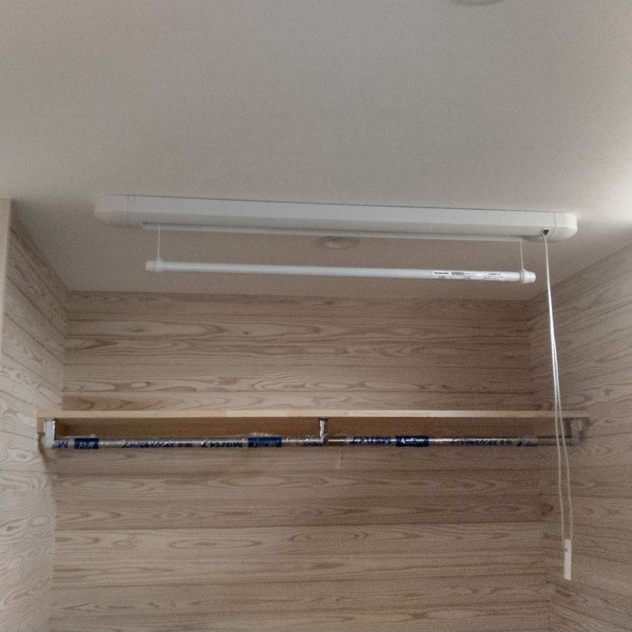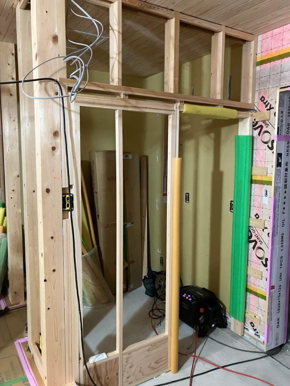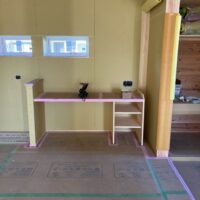 脱衣室のカウンター収納と洗濯物を干すスペースハンガーパイプ、キッチン横のデスクなども、棟梁達による造作です👍今は、木と似た色のプラスターボードや養生が引いてあるので映えませんが、仕上げ工事が終わると存在感が出てきます。