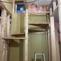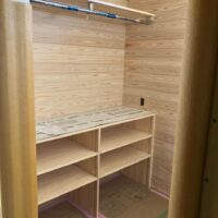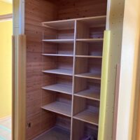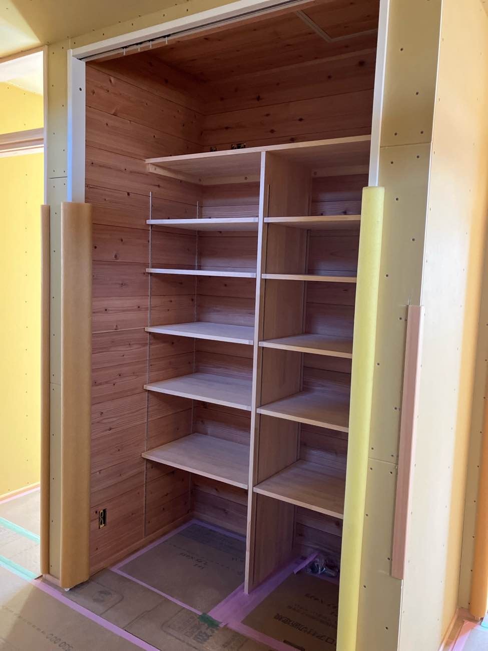 収納部分の棚板も取り付けられて、h典棟梁とk池大棟梁の造作工事が完了しました。