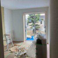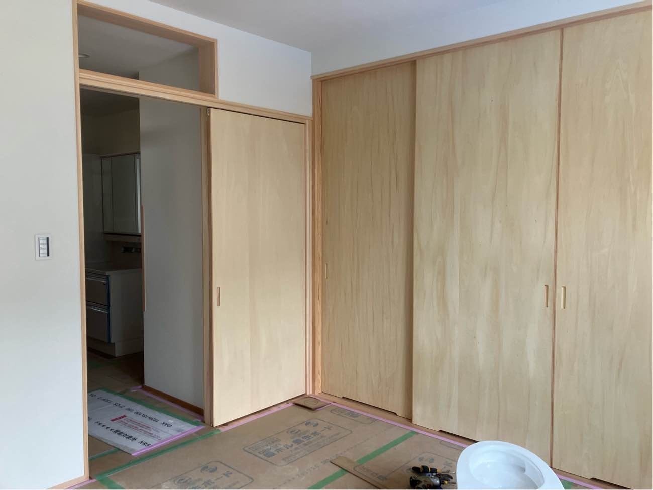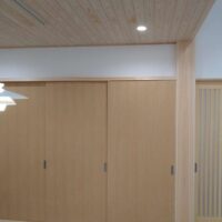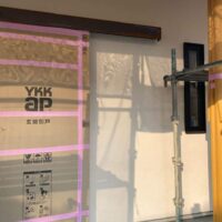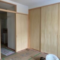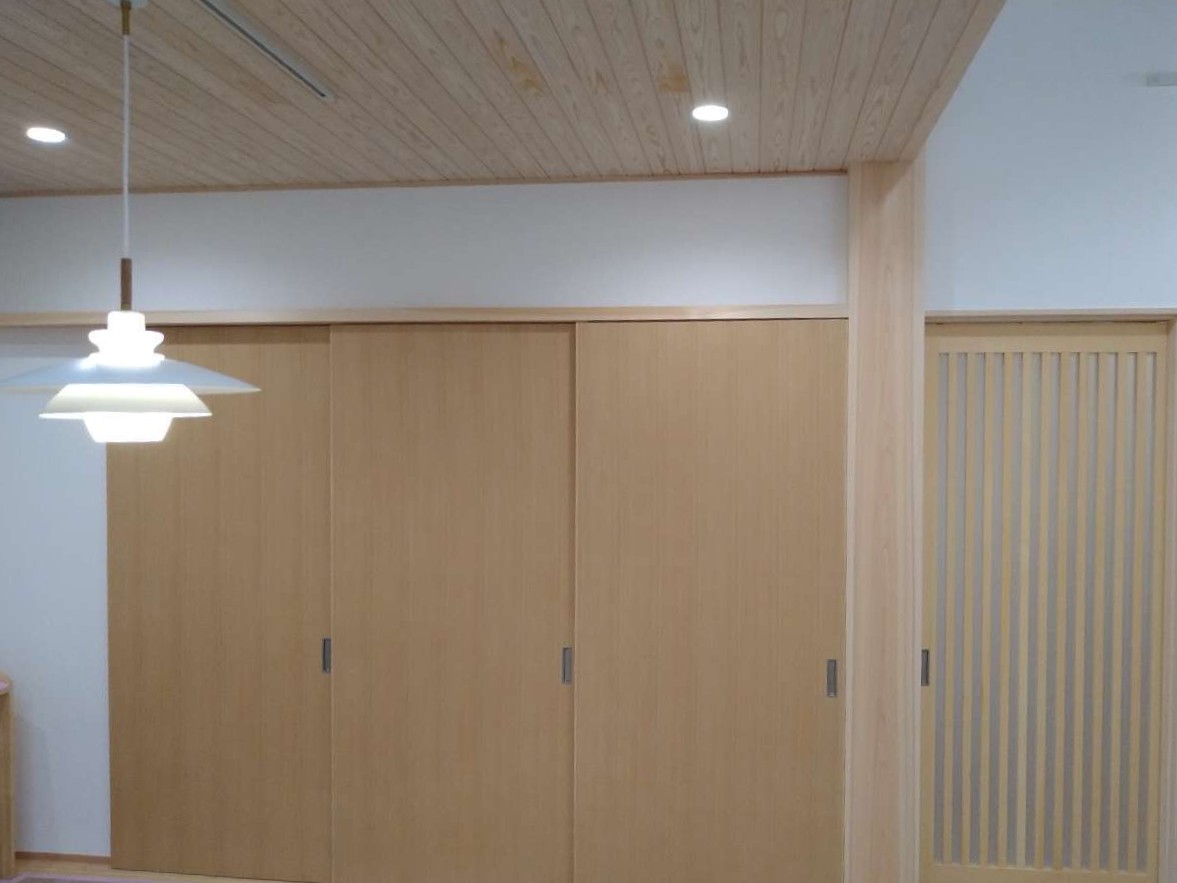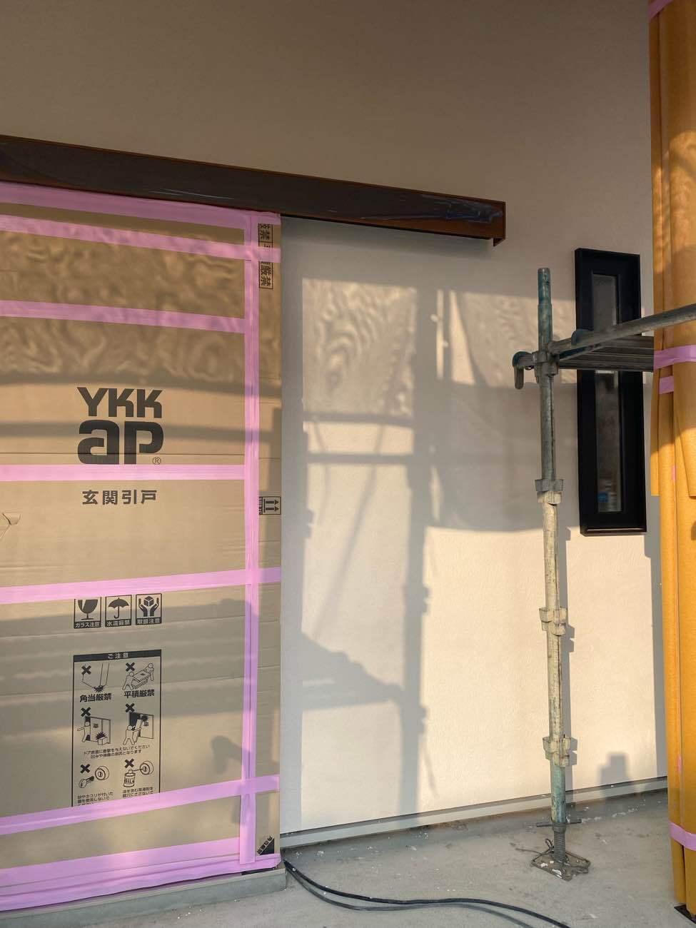 f井建具さんが、建具を納めに来ました。照明器具も取り付けられています。どんな仕上がりか楽しみです。