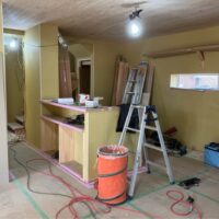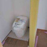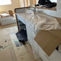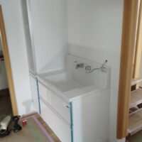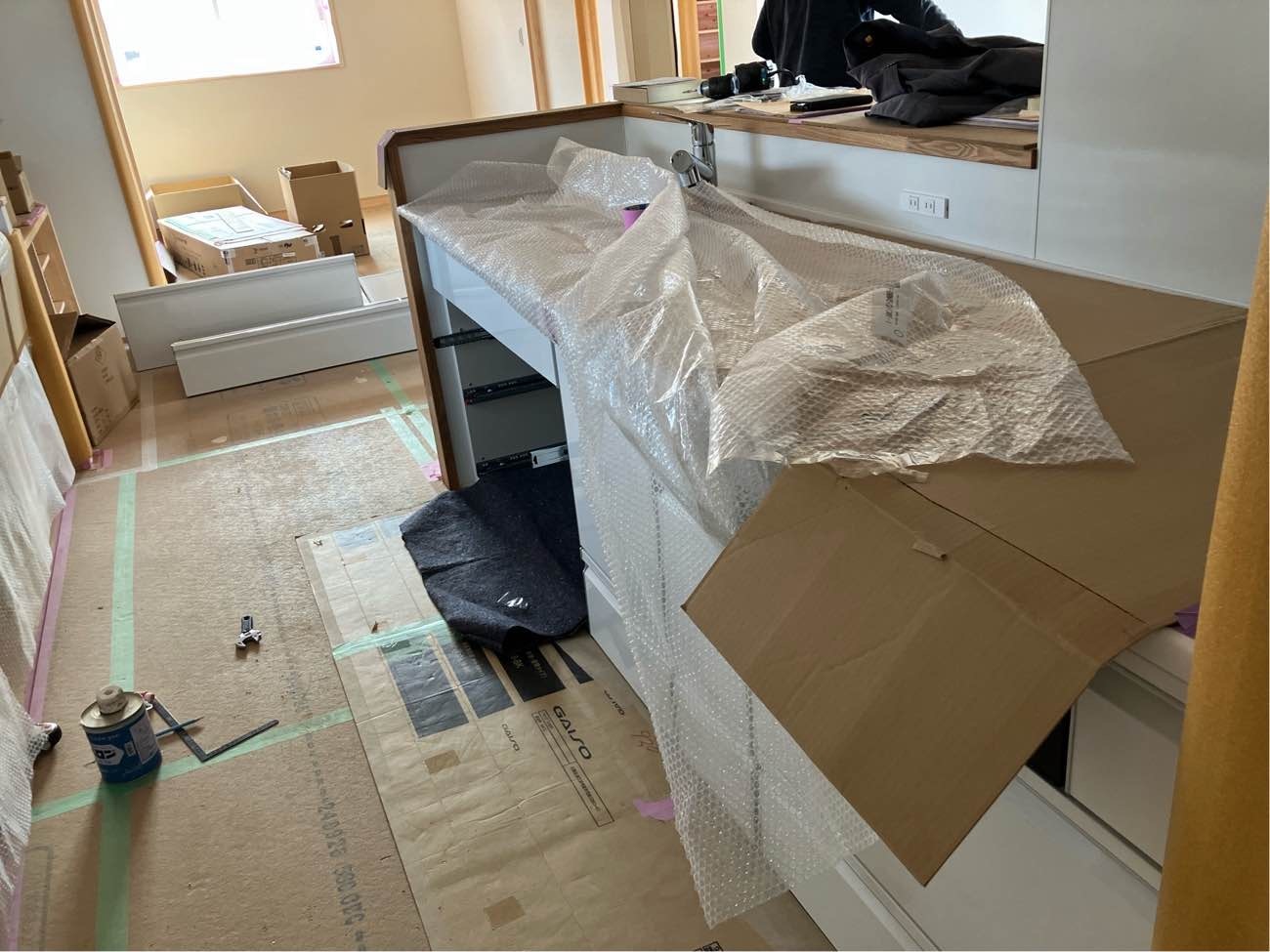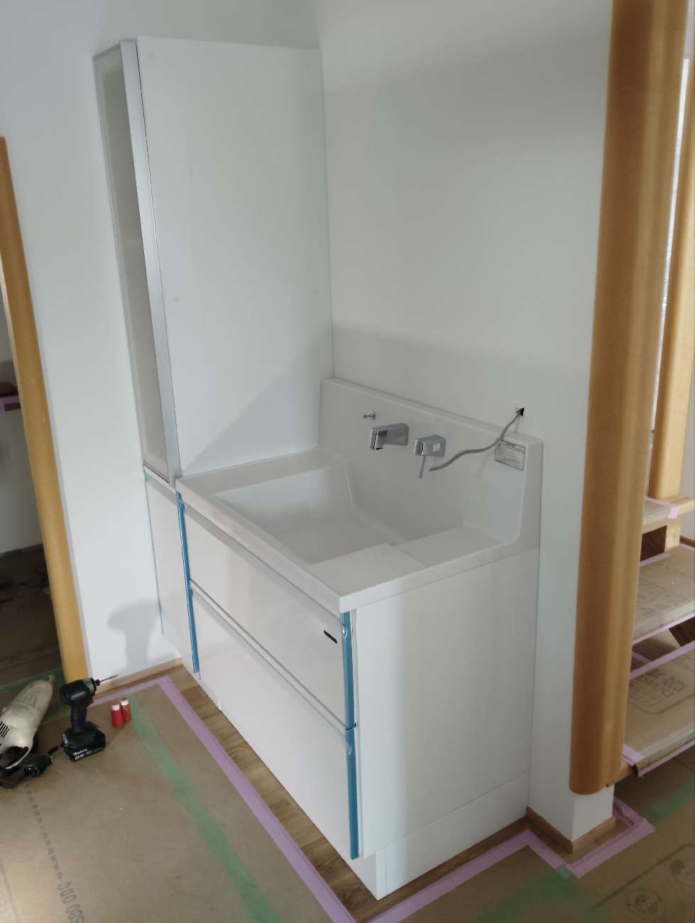 仕上げ工事を終えて、Jサービスさんが洗面化粧台やトイレを設置。T社さんのキッチンも設置されました。いよいよ、完成間近です!