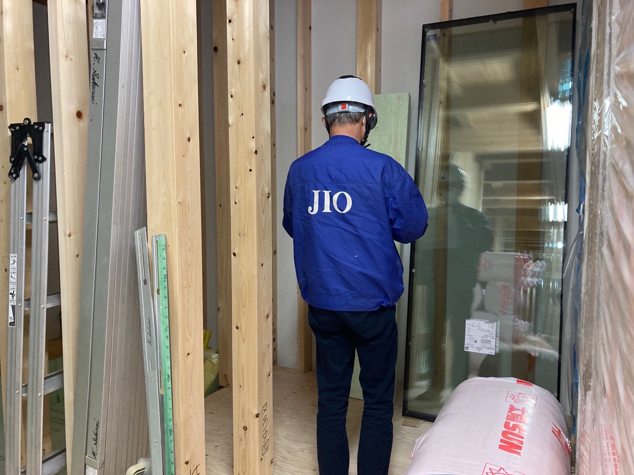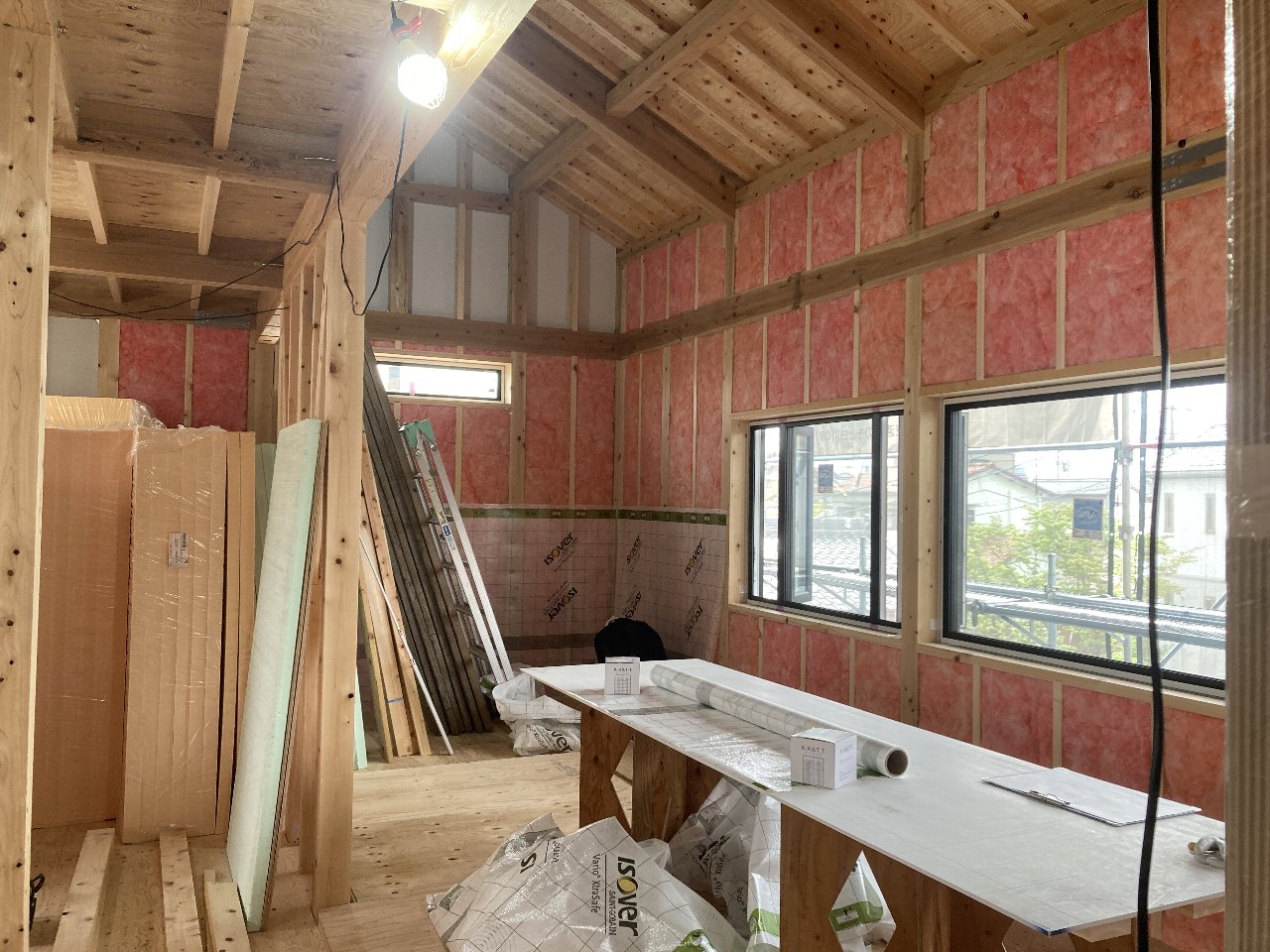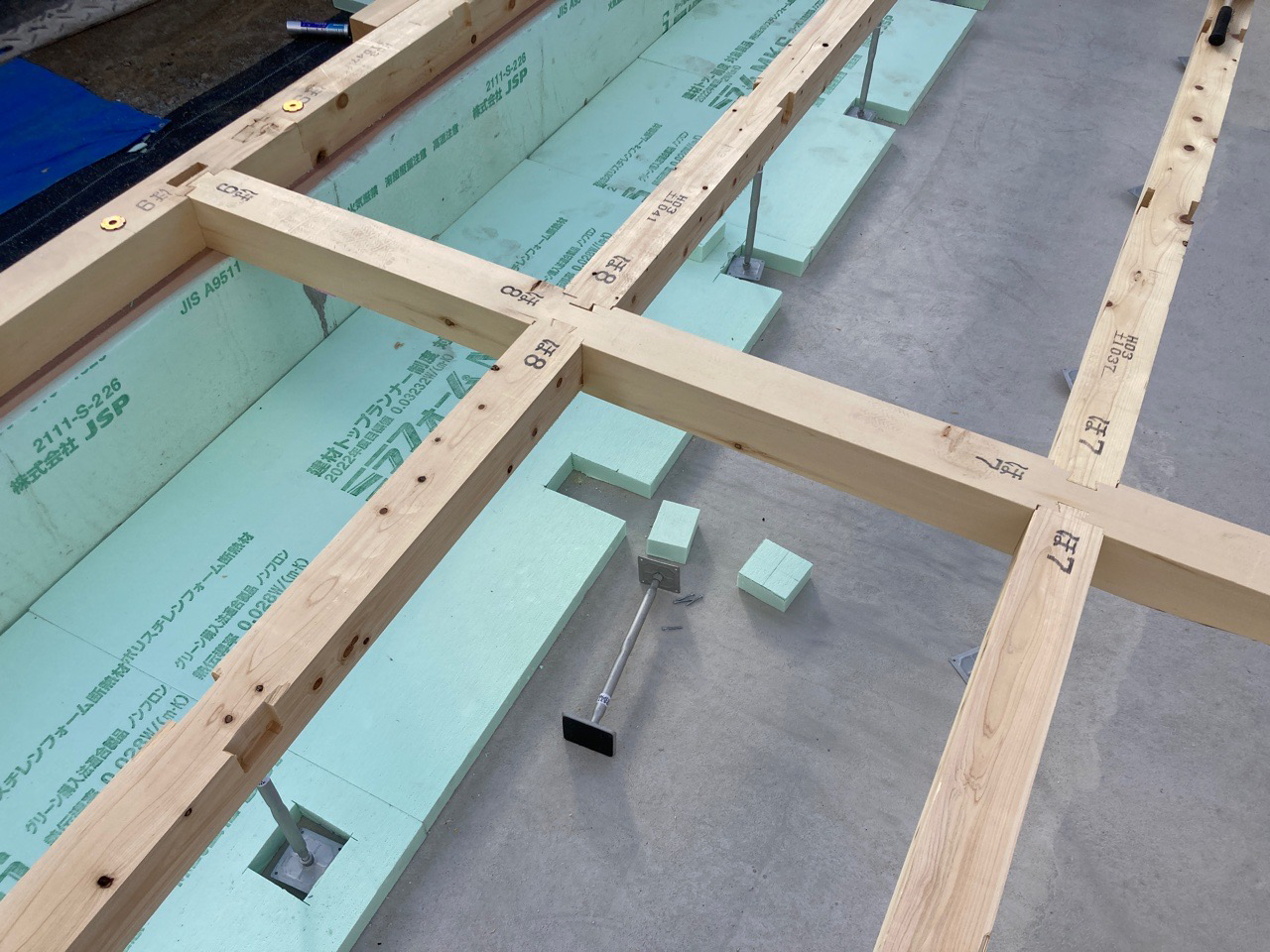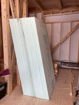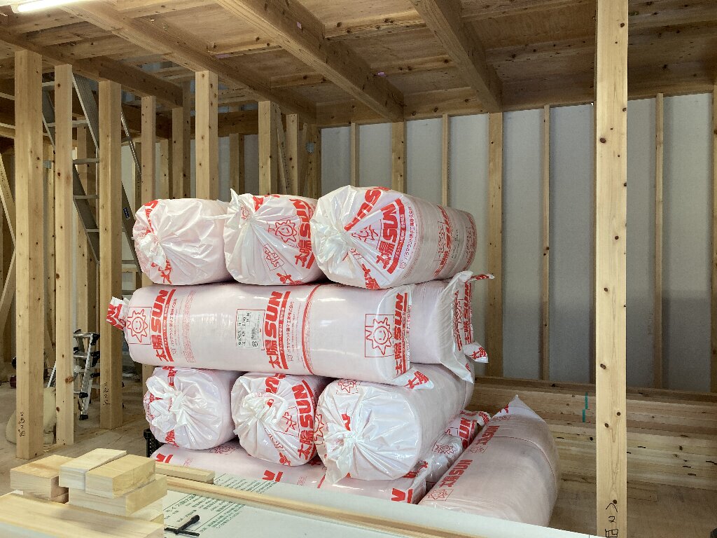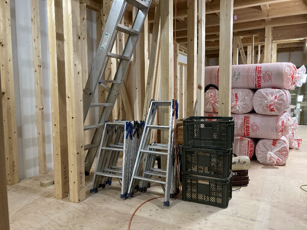 部は、接合金物が取り付けられ、断熱材が搬入されています。グラスウールは付加断熱用。押出法ポリエチレンフォームは、桁部分の断熱補強用です。