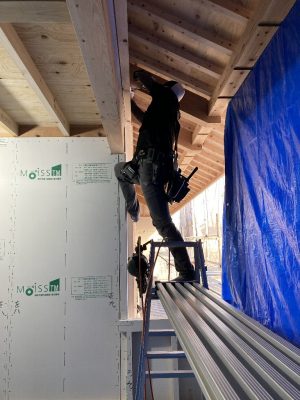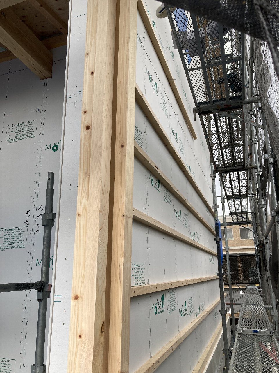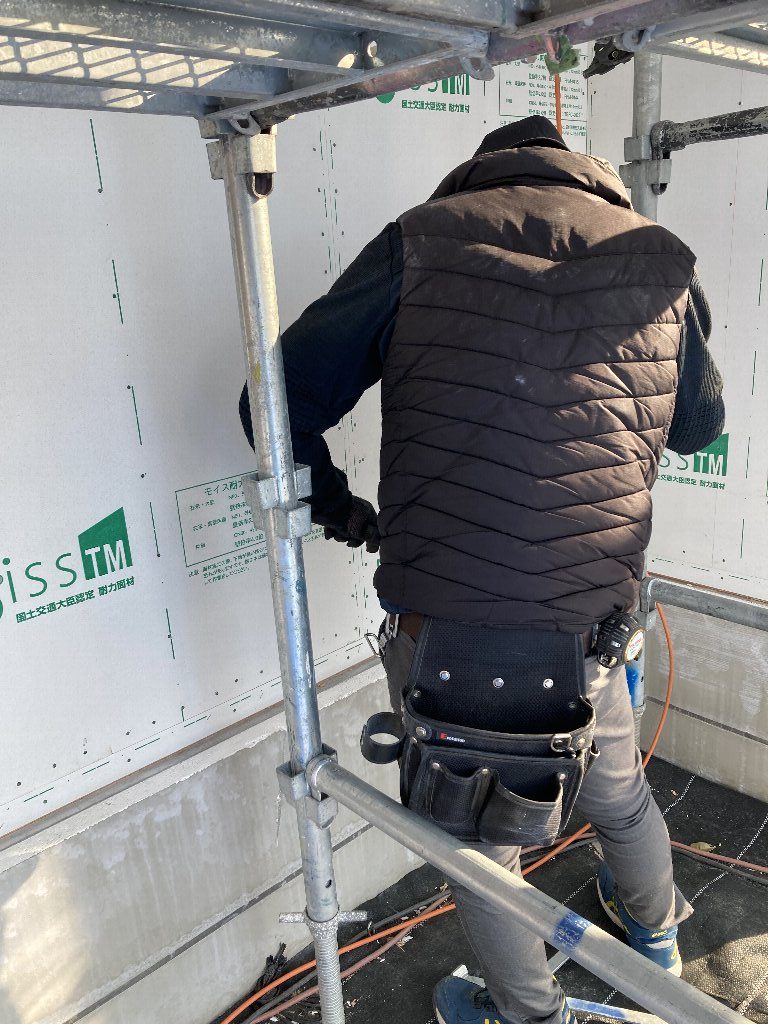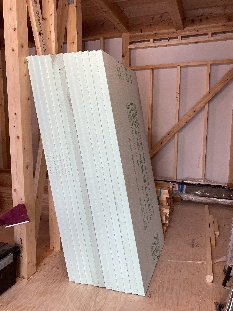 今日は、付加断熱55㎜の下地を取り付けています。長いビスで取り付けていくので、技術と結構力も要ります💦