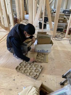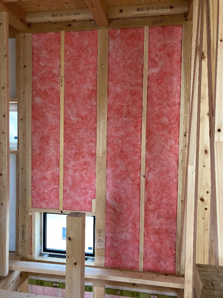 s井棟梁は、1階南面の外部付加断熱を入れています。グラスウールの施工ピカ一☆のs井棟梁。ポンポン、スースーてな感じで、スマートに施工していきます👍(オノマトペで表現してみました。)