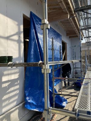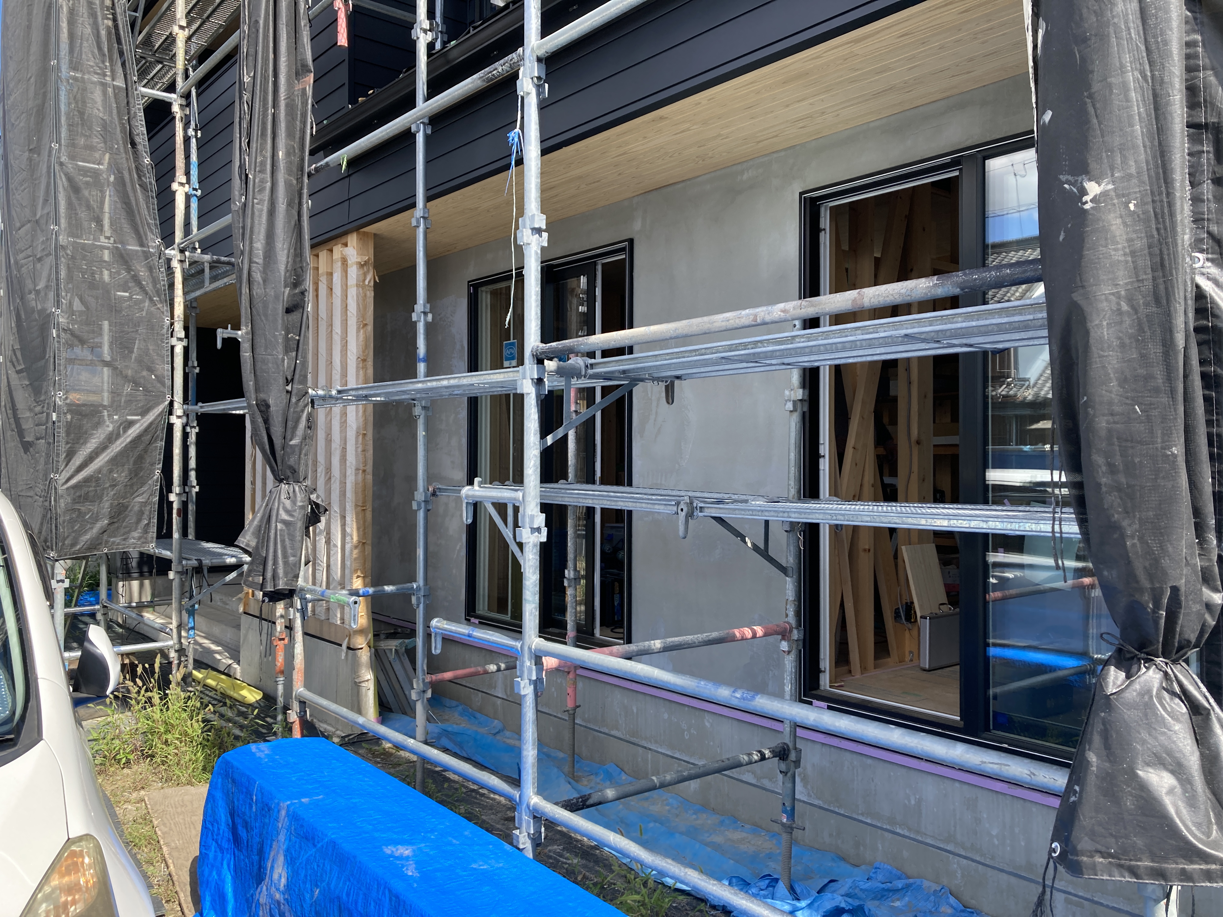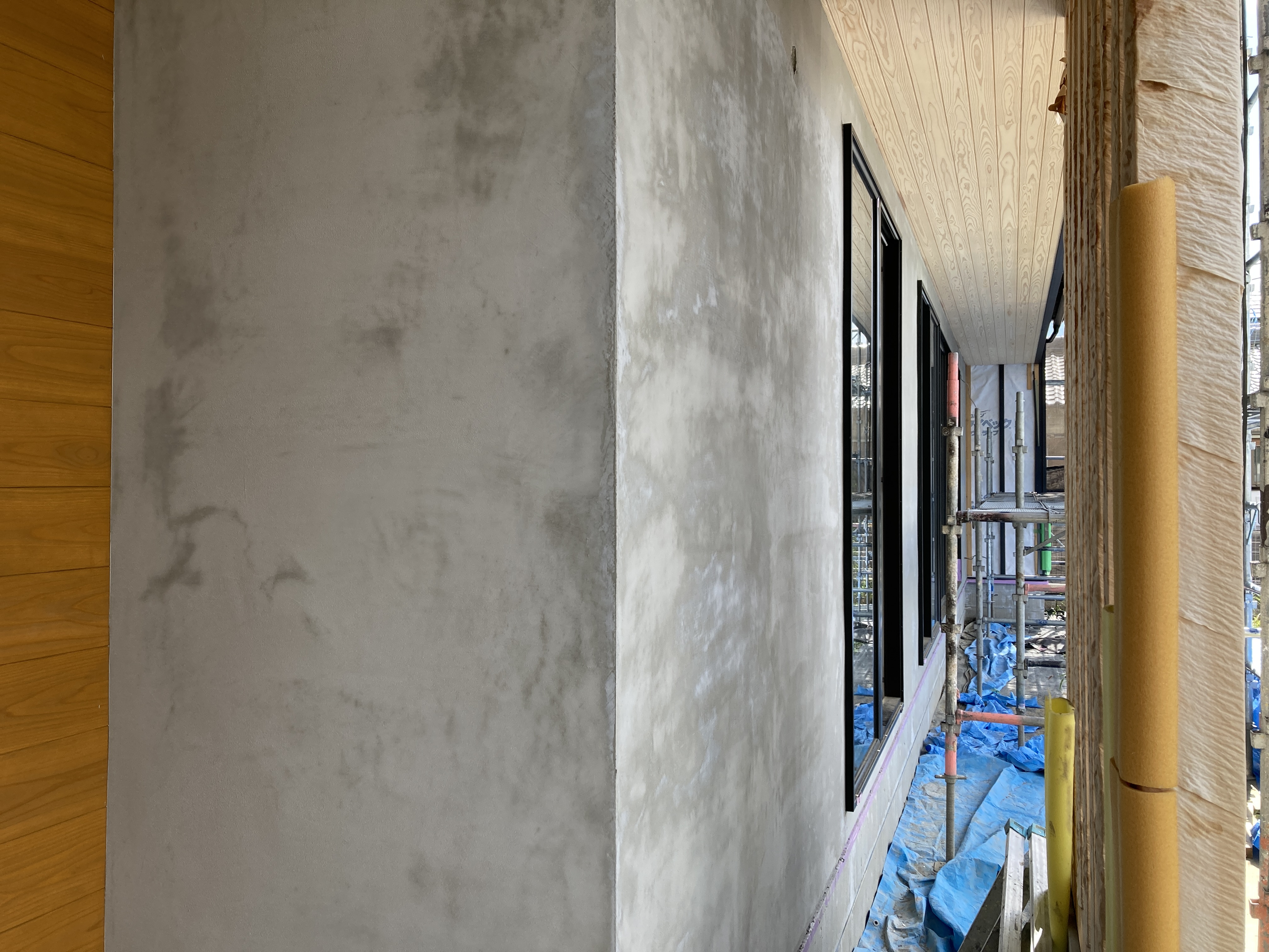 昨日の様子です。外壁の残りジョリパッド塗り部分の施工が始まりました。防水シート、メタルラス張り、モルタル下地まで終わっています。