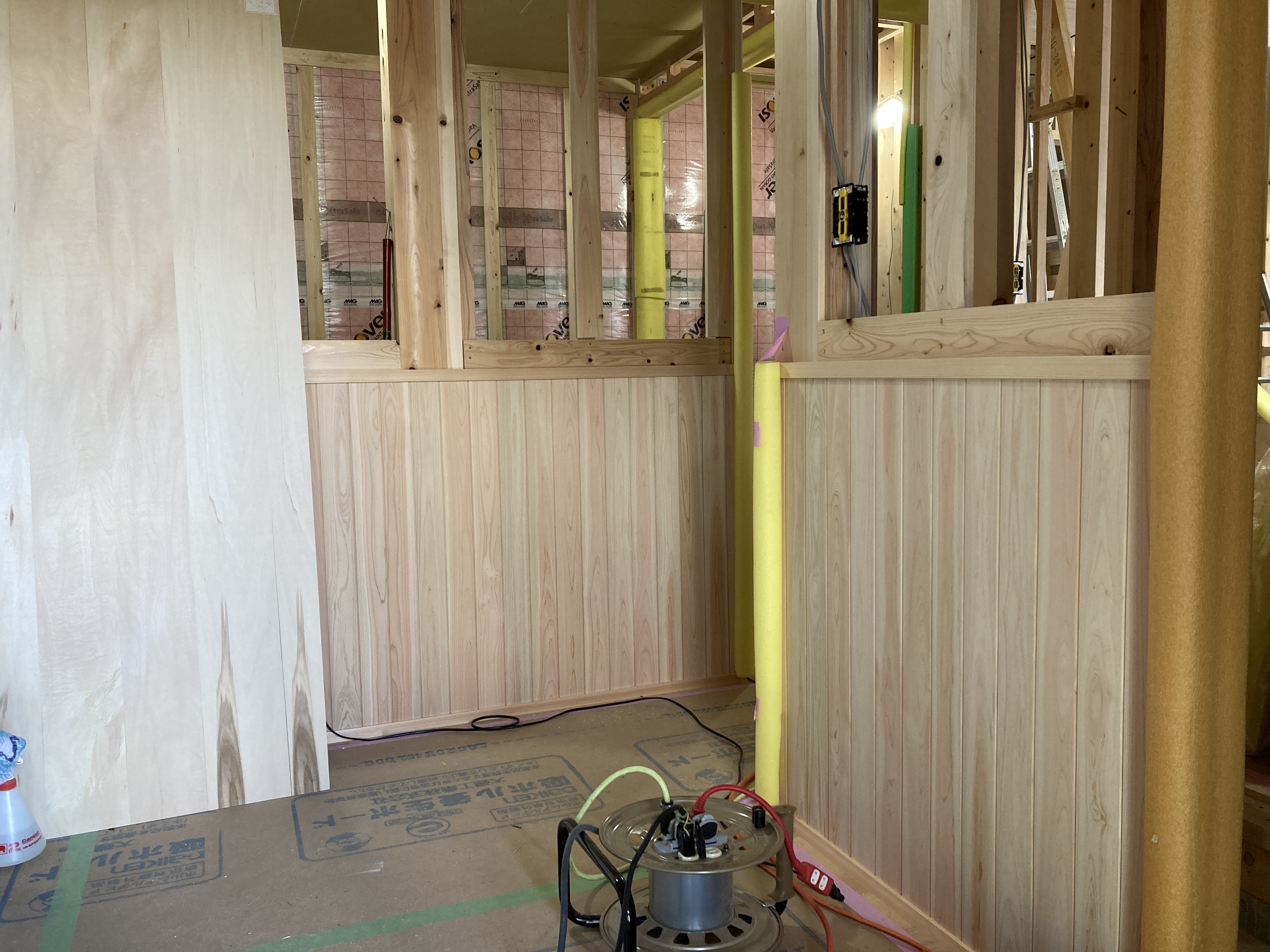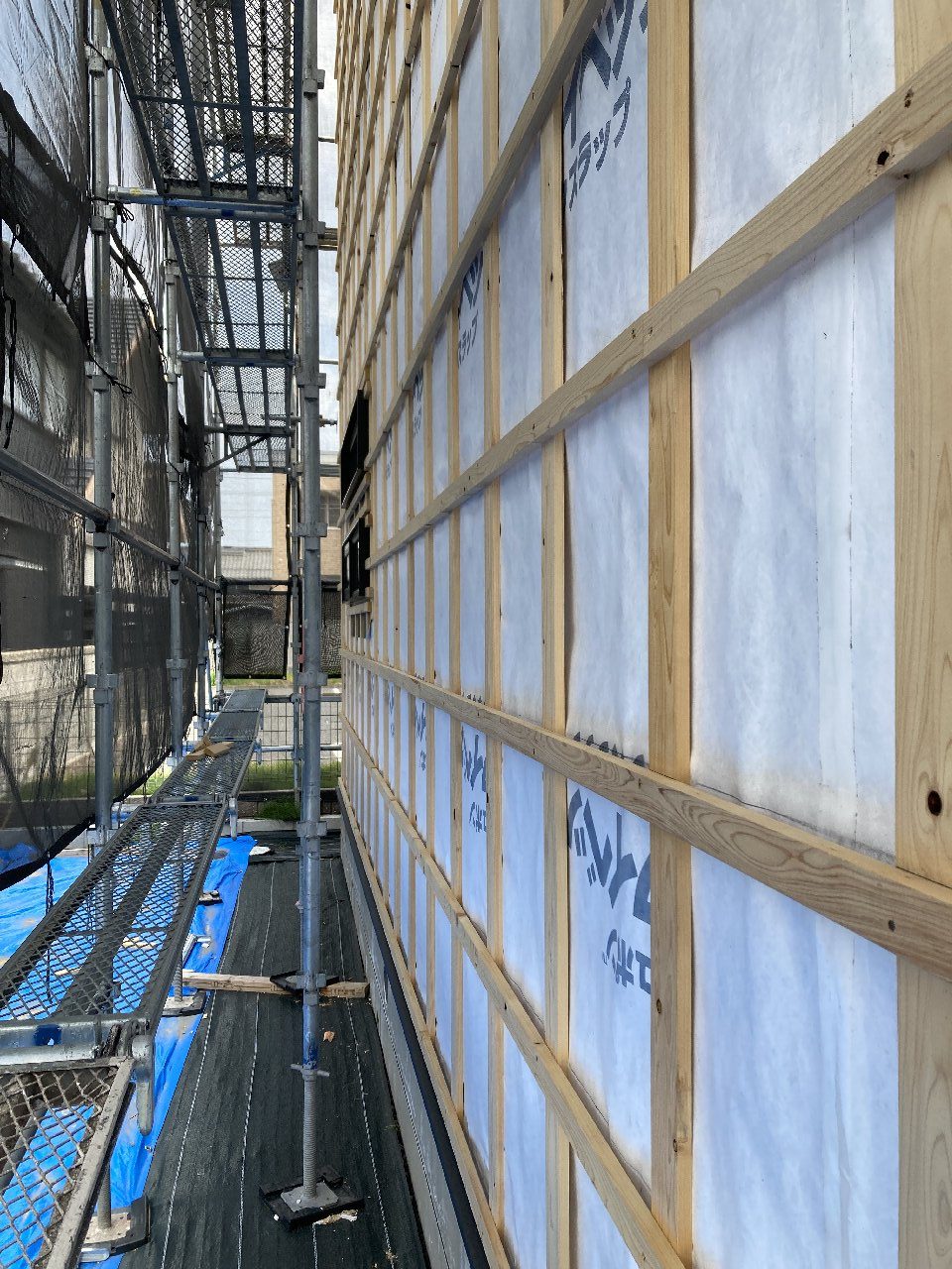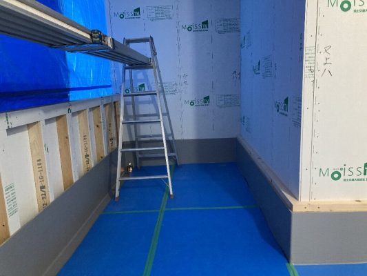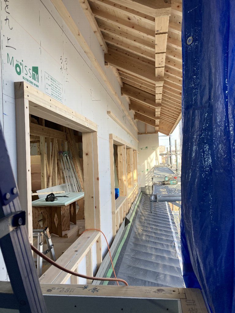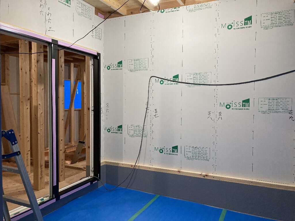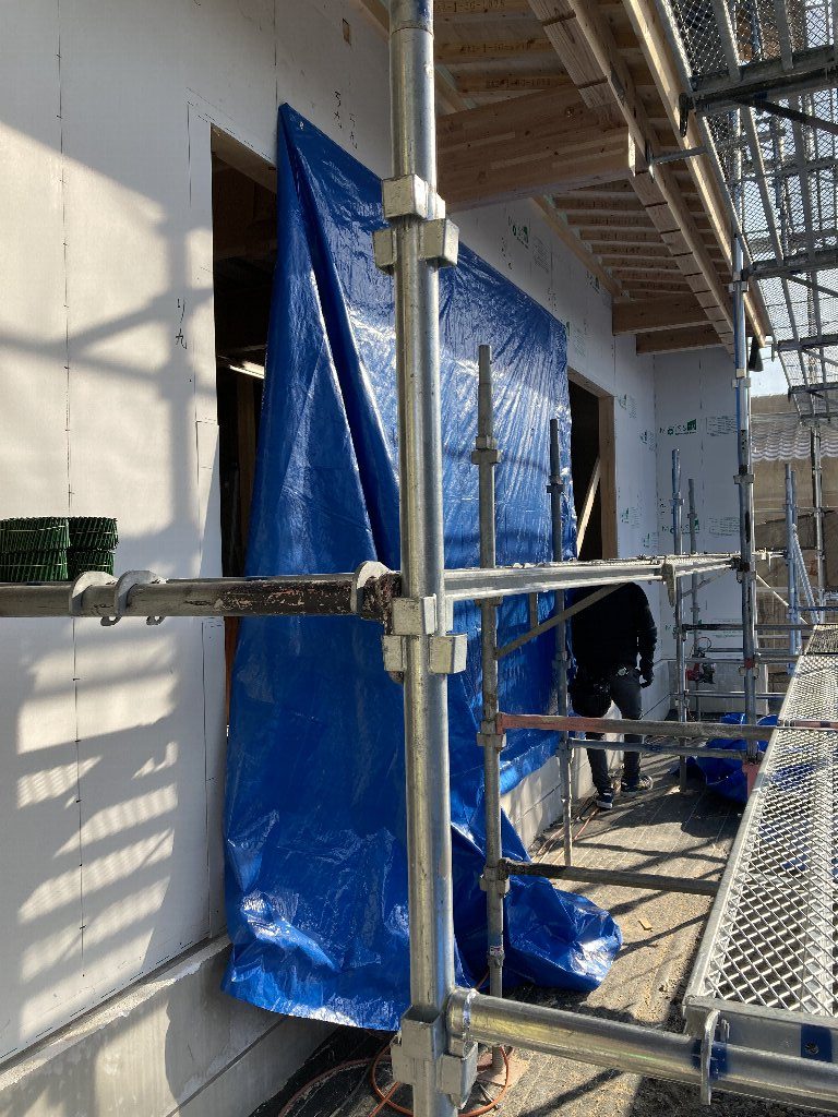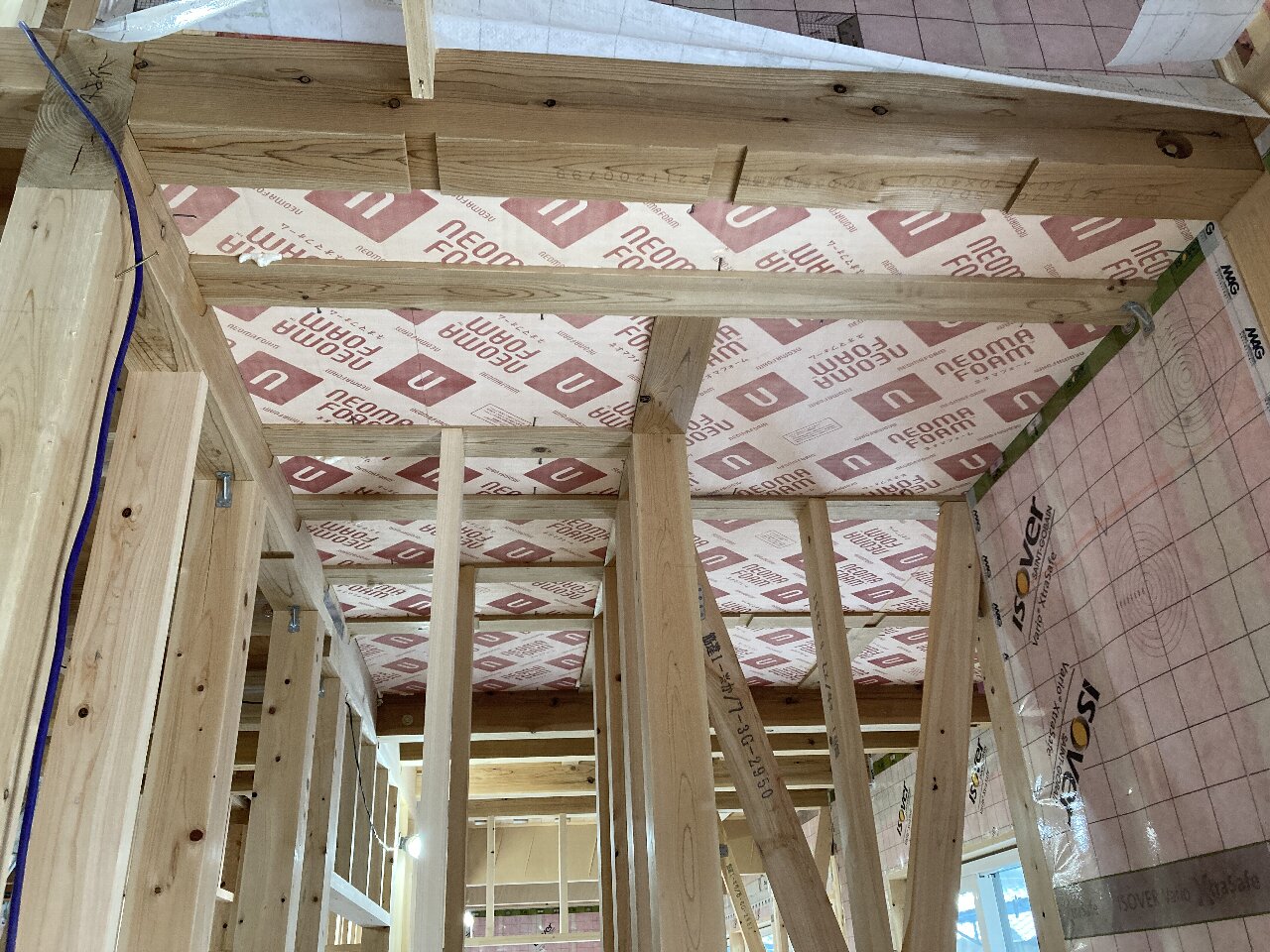 今日は、昨日の雨で湿気が多いので、以前に貼った1階のシートがシワシワしています。n様も現場に来られた時の天候によってシートのパリッと加減が違いますので、是非見てみてください👍