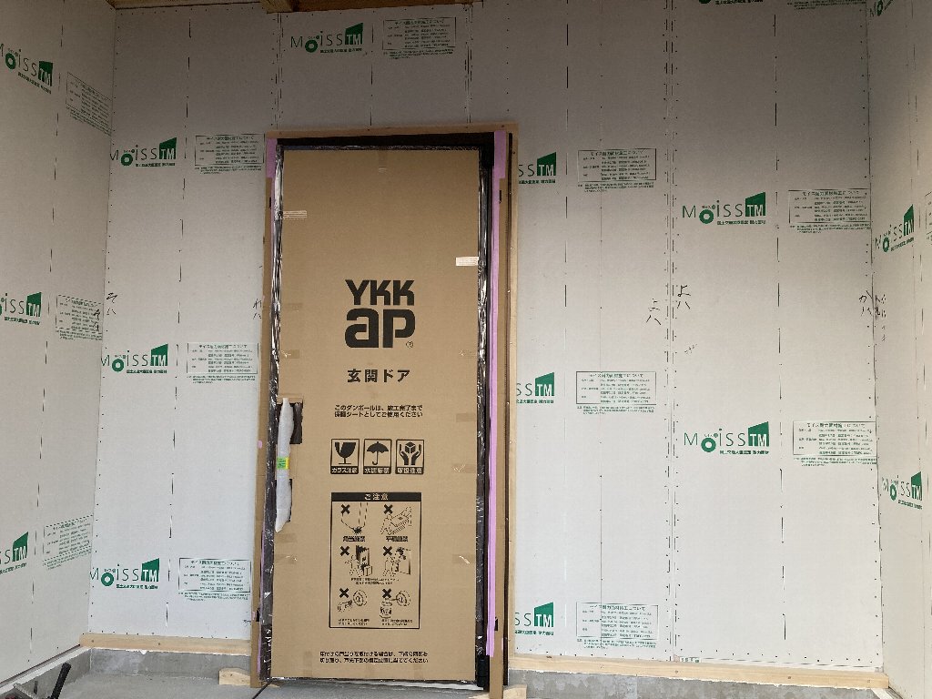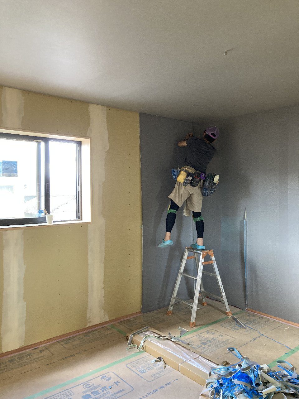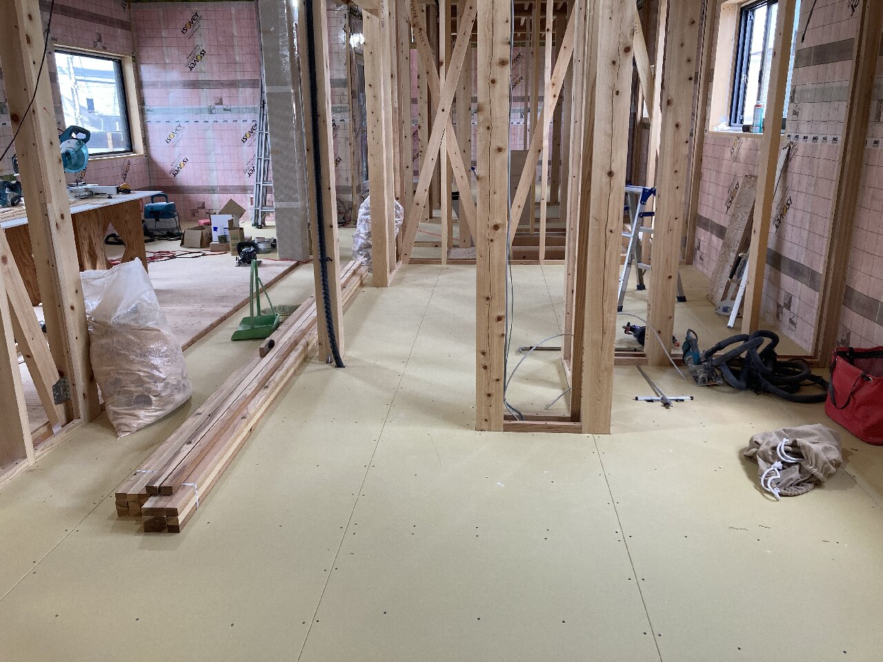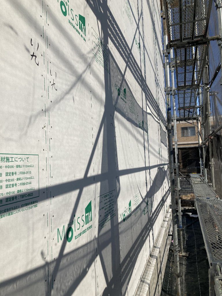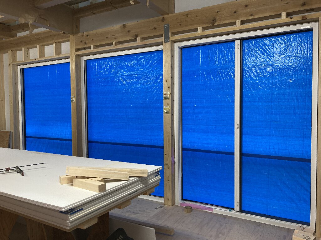 今日は、昨日の雨で湿気が多いので、以前に貼った1階のシートがシワシワしています。n様も現場に来られた時の天候によってシートのパリッと加減が違いますので、是非見てみてください👍