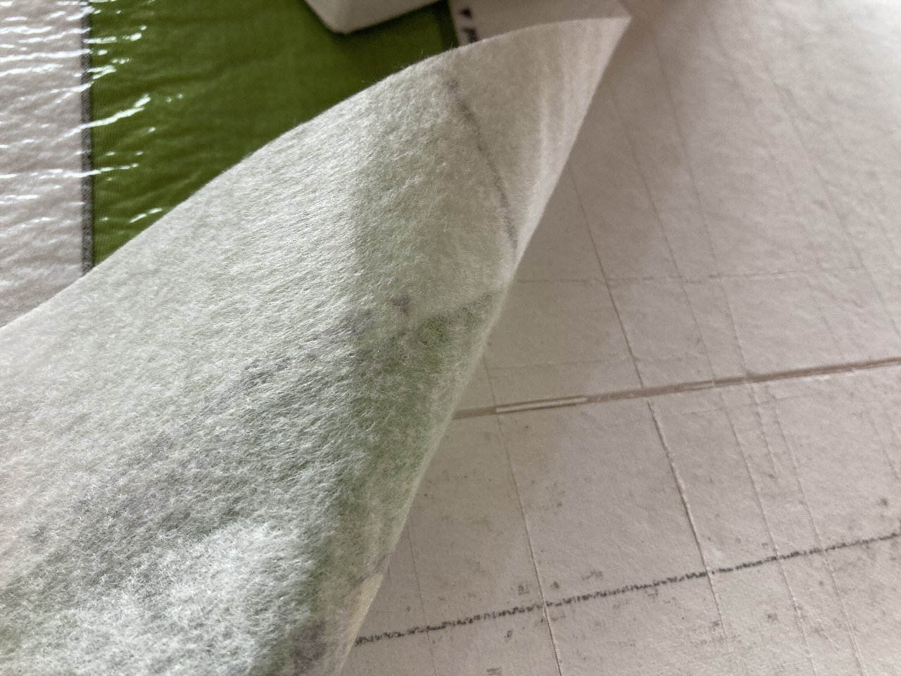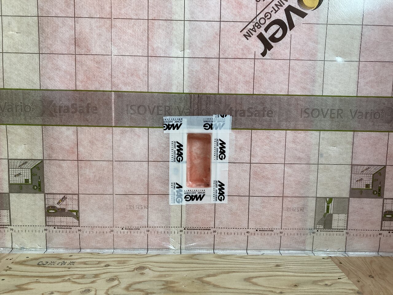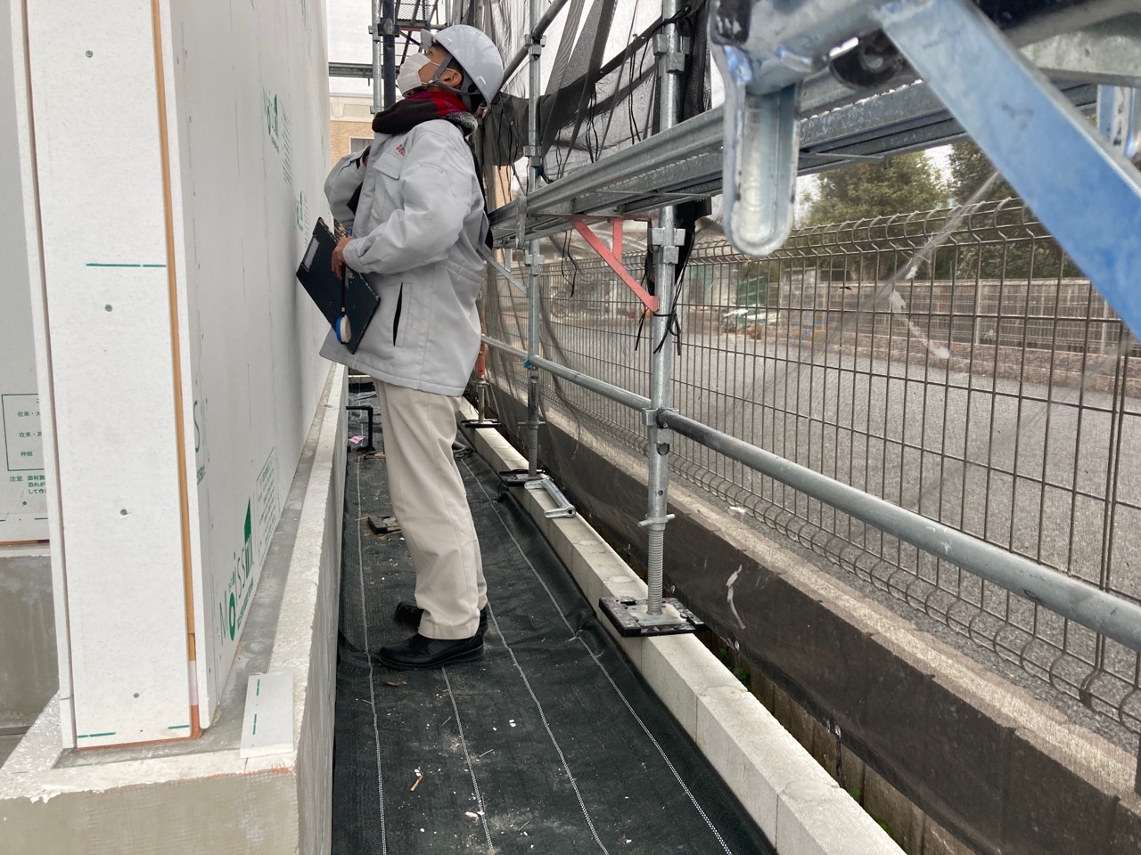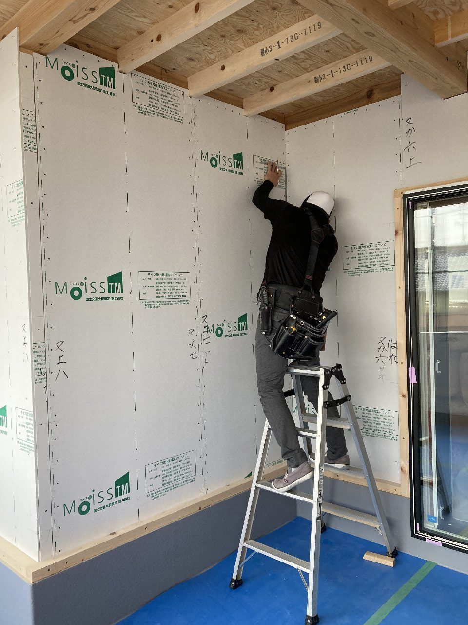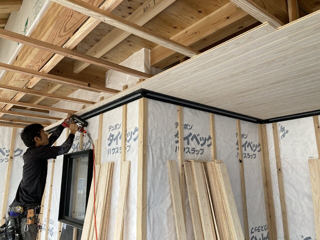 今日は、昨日の雨で湿気が多いので、以前に貼った1階のシートがシワシワしています。n様も現場に来られた時の天候によってシートのパリッと加減が違いますので、是非見てみてください👍