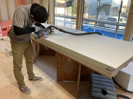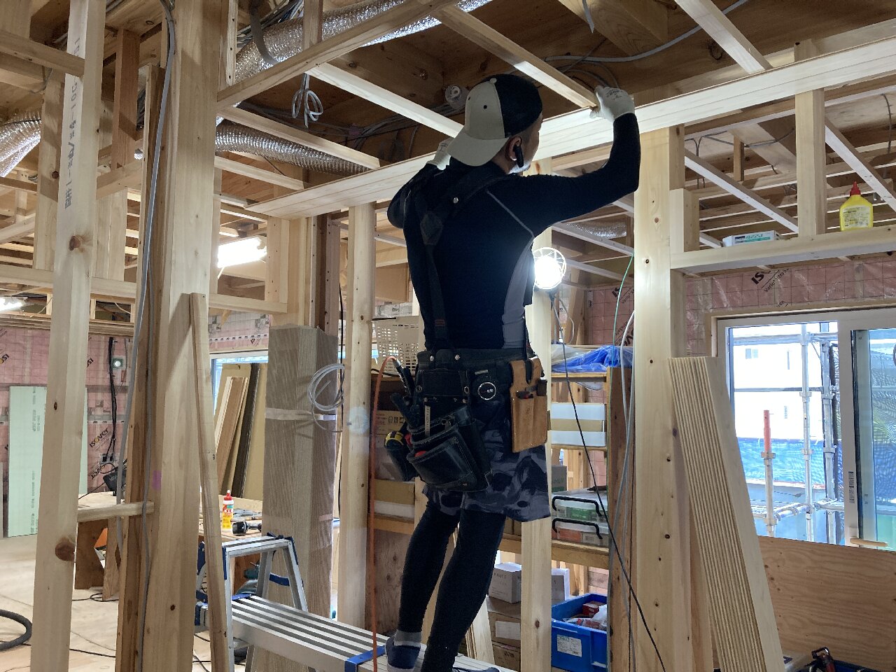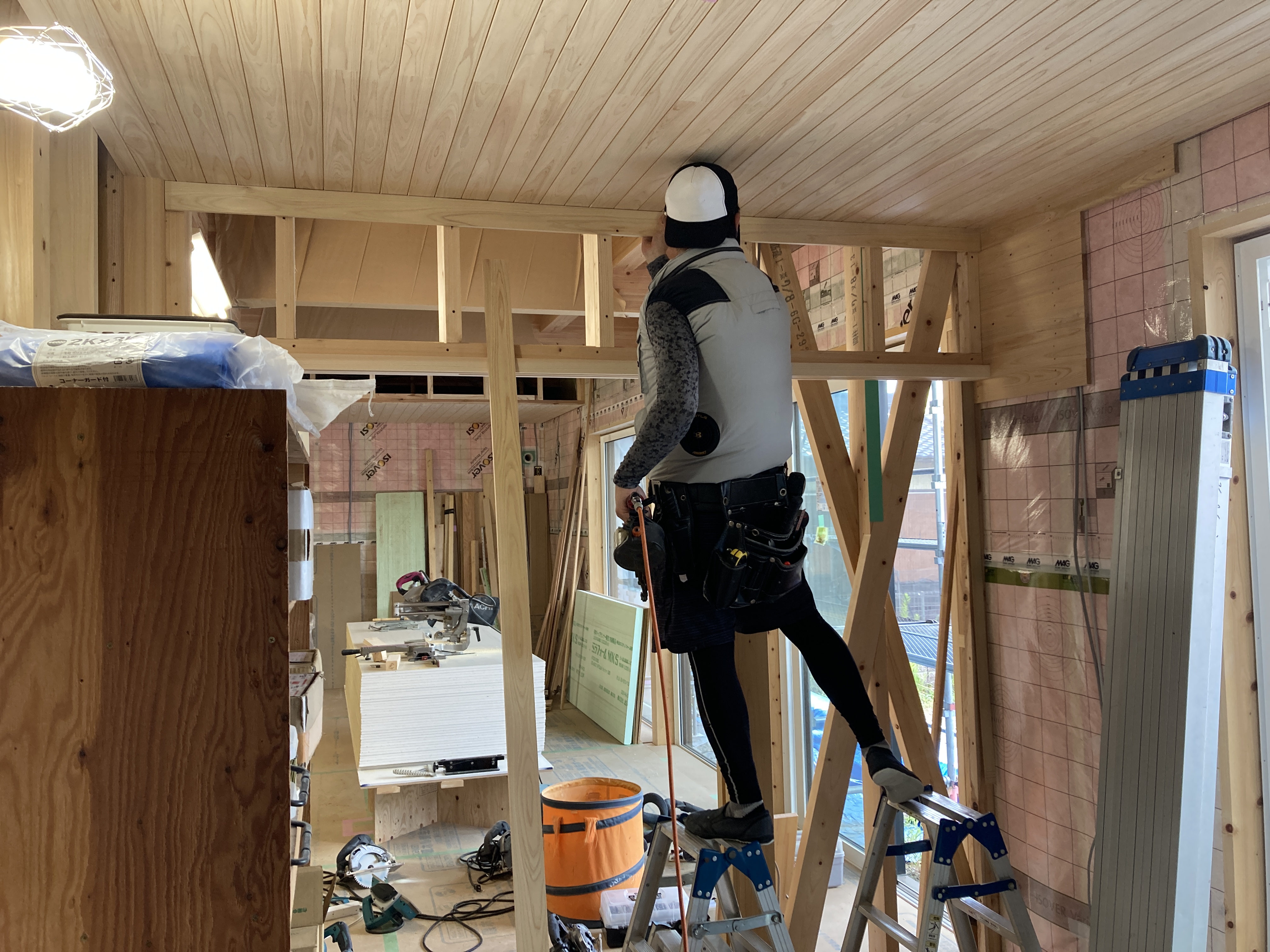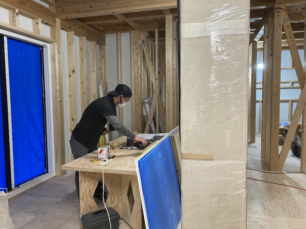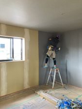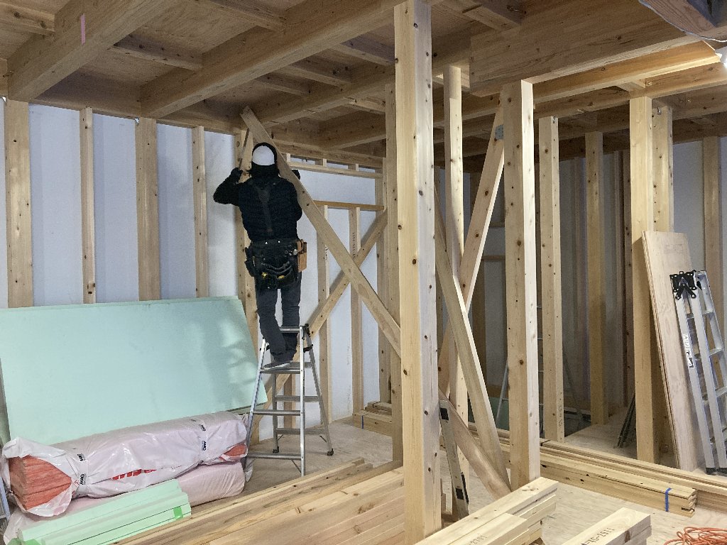 今日はご主人のお母様と、奥様、お子さんのsちゃんも見学にみえました。お母様は、息子さんの家が出来上がるのがとても嬉しいご様子で、ハシゴで2階にも上がられて現場を楽しそうに見てみえました👍h谷君は、プラスターボード張りなど壁の施工を行っています。