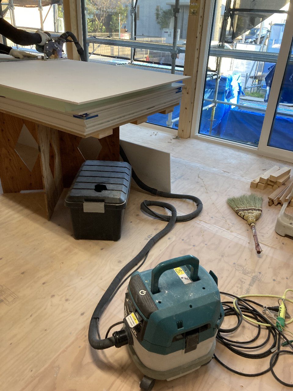 s井棟梁、今日は外壁下地の面材を張っています。面を合わせるため、耐力壁ではないのですが、耐力壁用の面材を使用しています。耐力壁に使われるだけあって硬いので、サイディング用の刃でカット中。あれ?それにしては、埃が舞っていなくてきれいな室内~丸鋸に掃除機が付いています👍これはいいですね。掃除機付きの専用丸鋸、ちょっぴりお値段しそうですが、キレイ好きs井棟梁には欠かせない道具のようです~