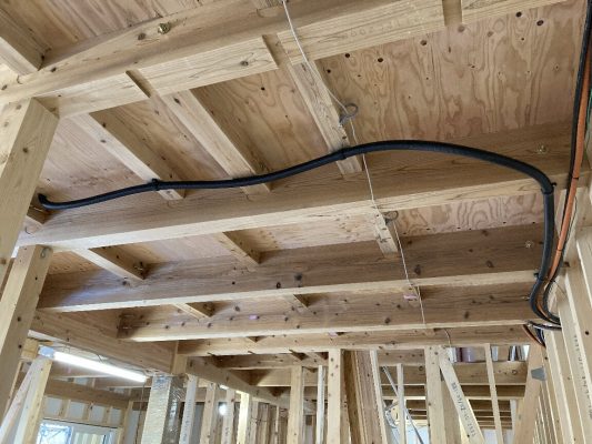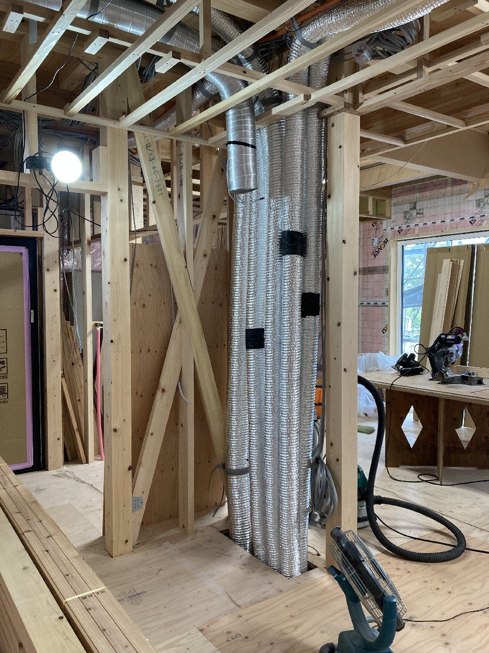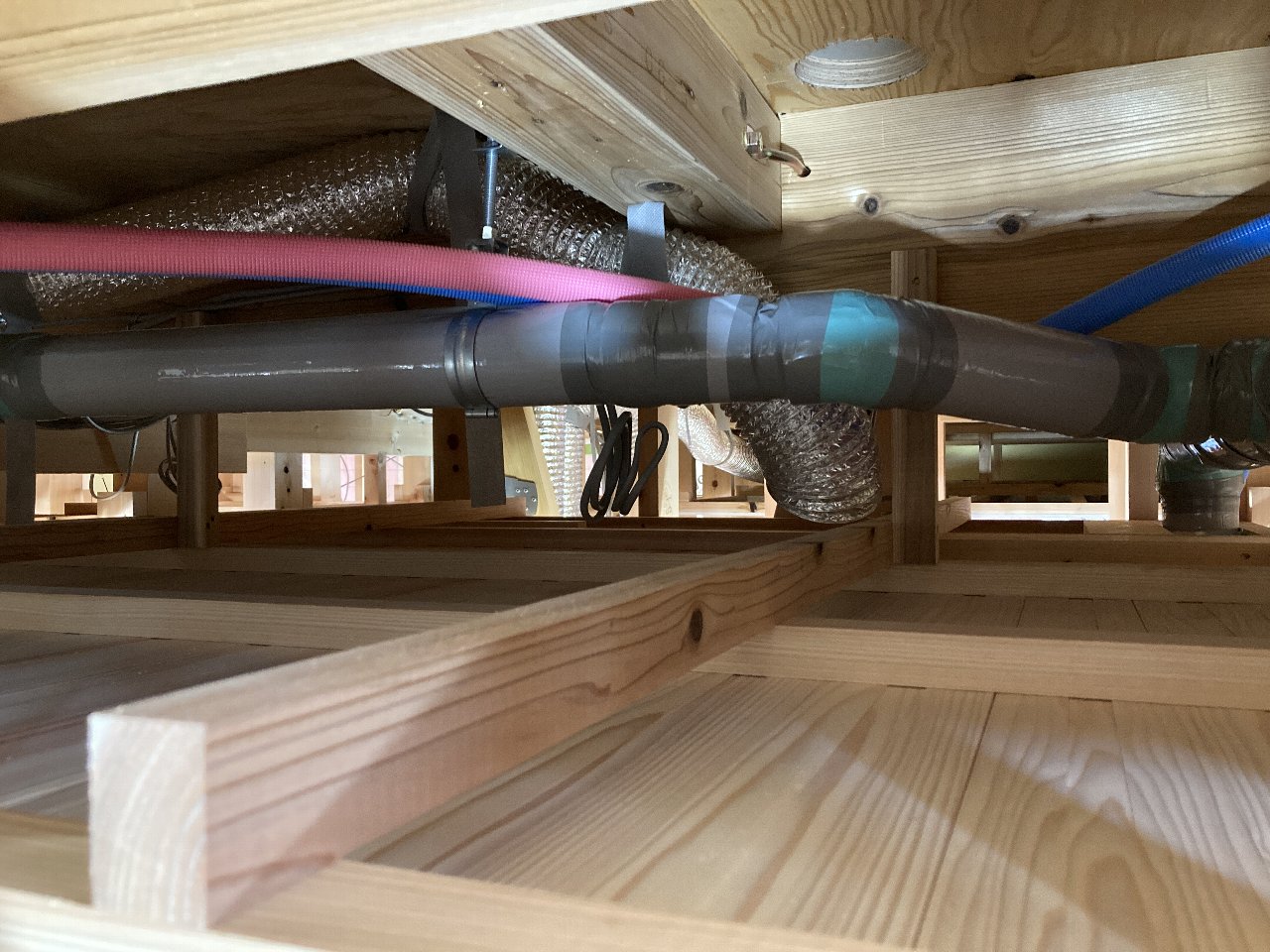 2階は、天井を張り終えています。今日はh谷川君は加工をしにいっています。昨日、f井電気のh場さんが、澄家(床下熱交換機付換気扇)のダクト配管をしに来ました。床下に本体があるので、2階への配管用として、1階にダクトスペースが必要になります。それにしてもこの配管!h場さん、がんばりました👍