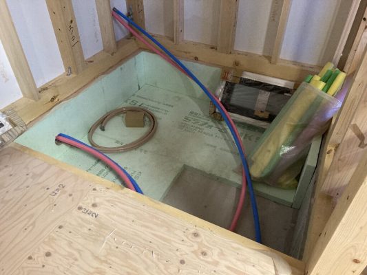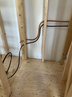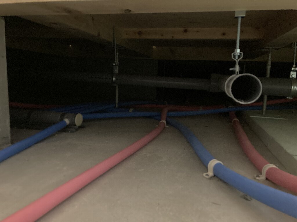 8日にs間燃料さんが、ユニットバス設置前に給水給湯排水の配管工事を行いました。給水のさや管ヘッダー工法は、従来の配管と比べて継ぎ手が少なく、地震などの振動にも影響されないので、漏水が起きにくい工法です。