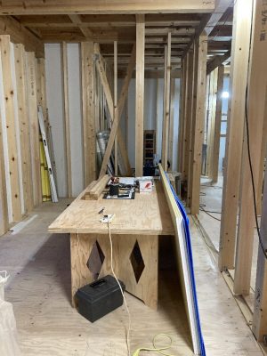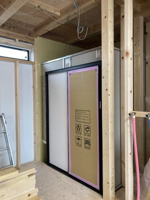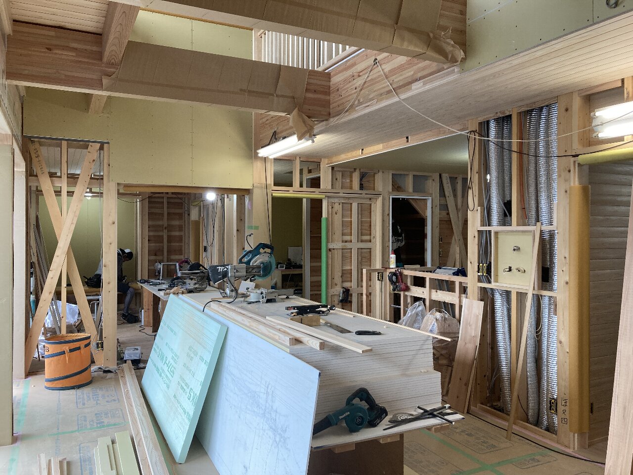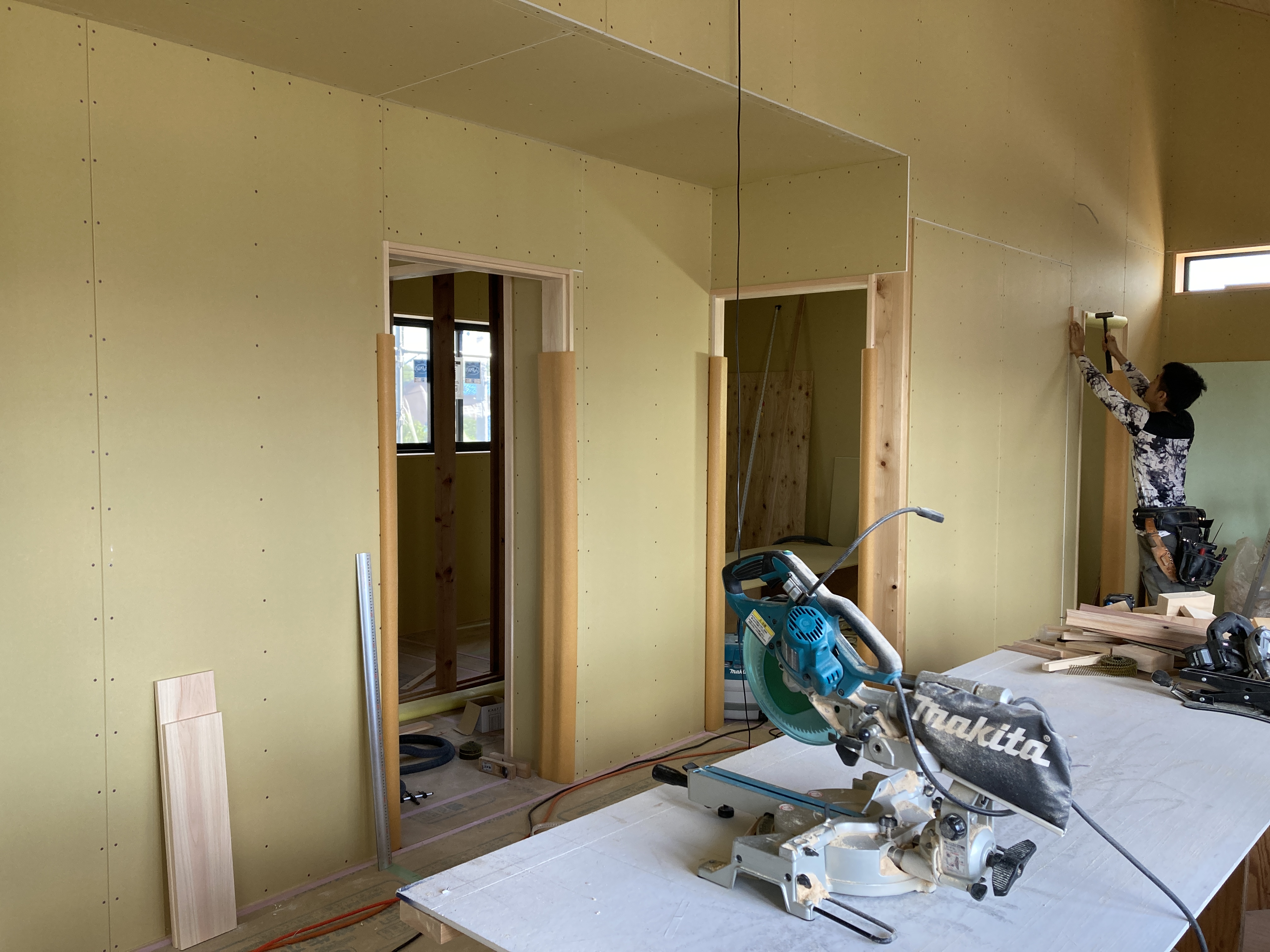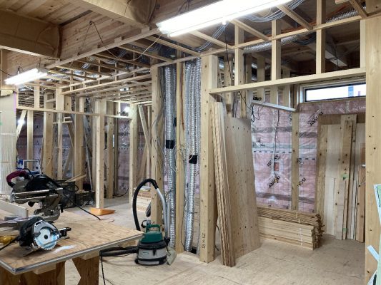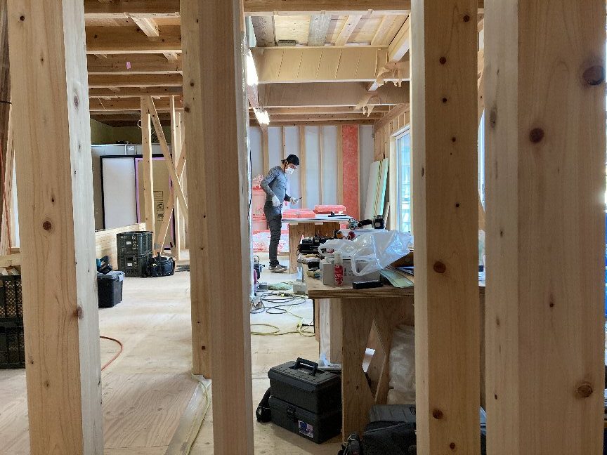 現在、内部建具が納まる部分に下地を取付ています。これから大きな空間が部屋ごとに仕切られていきます。