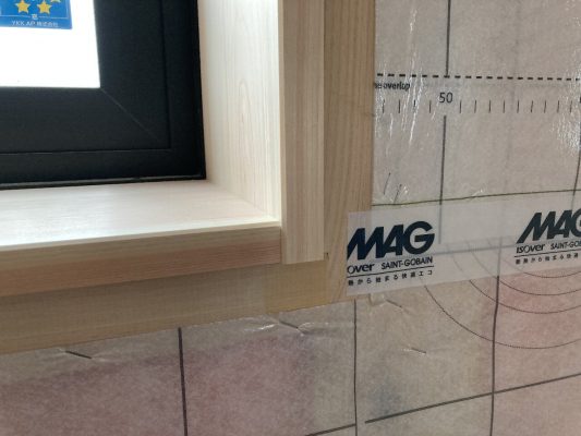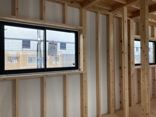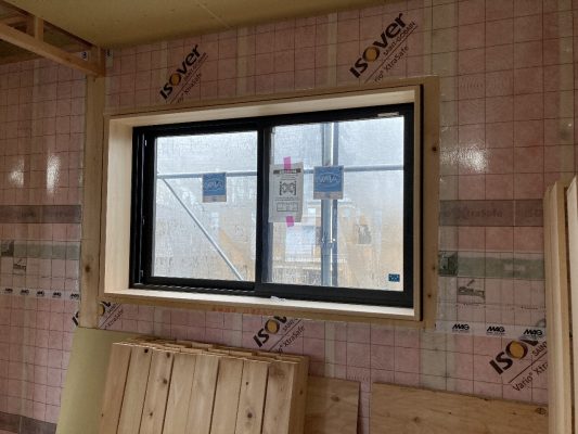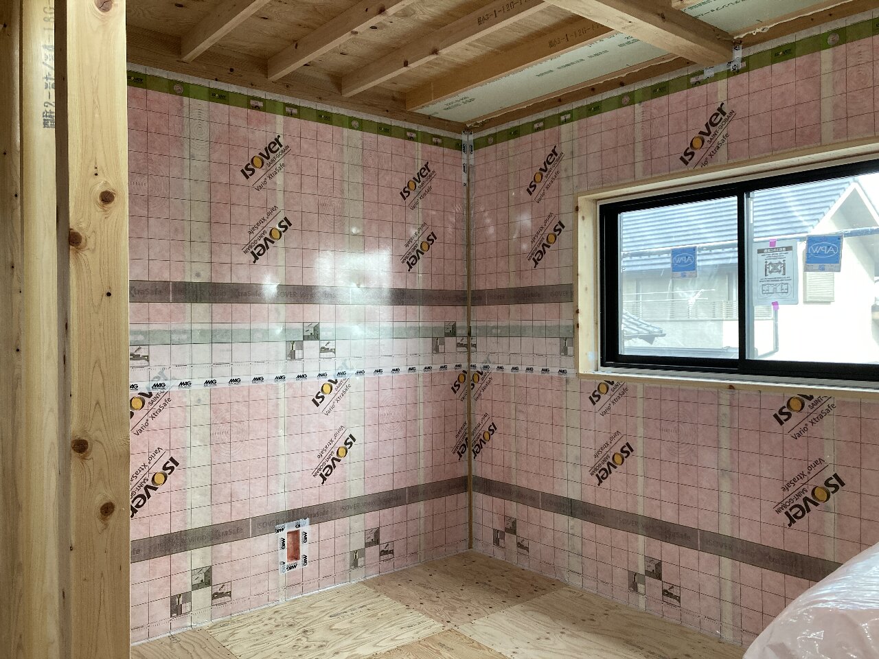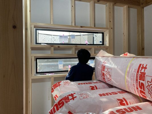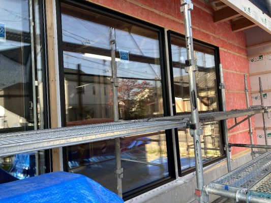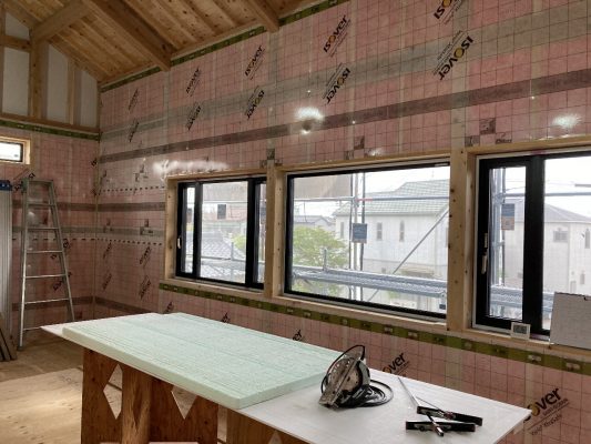 2階南面は、サッシ取付が取り付けられ、付加断熱55㎜のグラスウール、その上に透湿・防水シートが張られました。