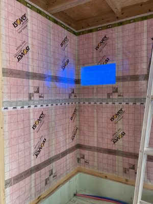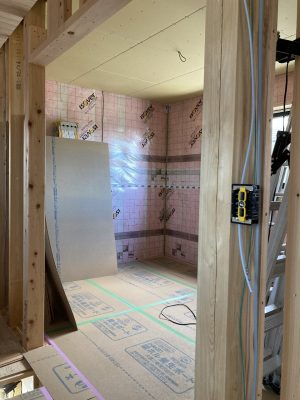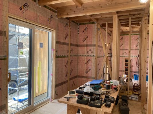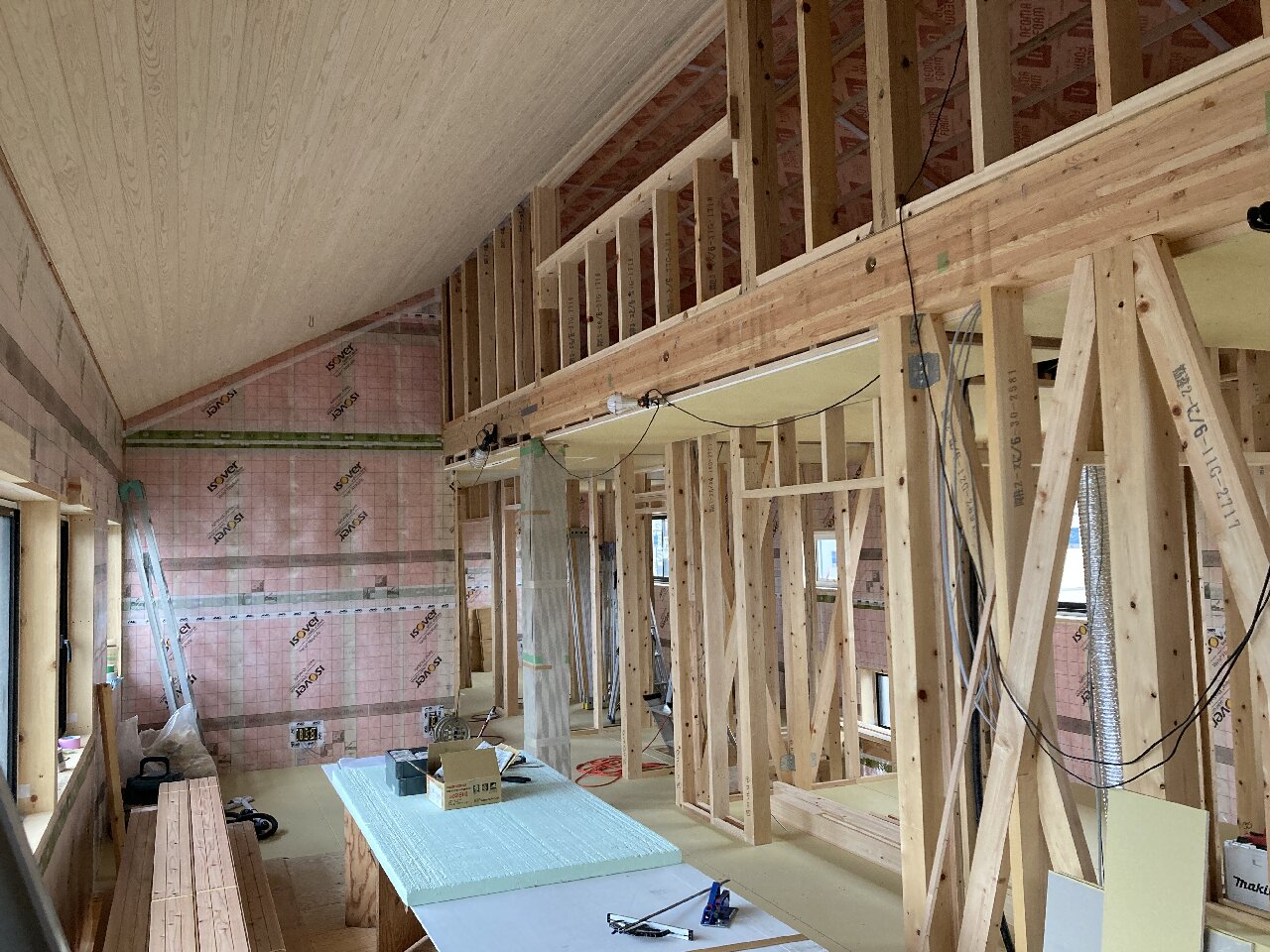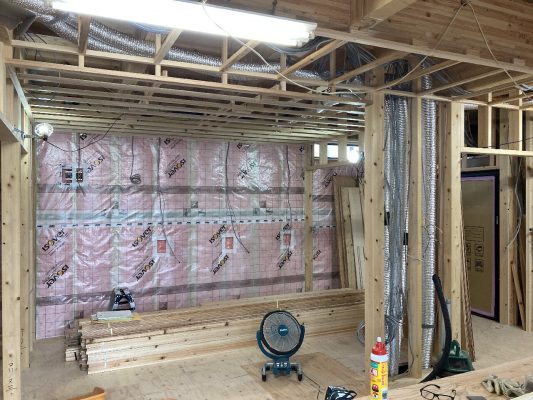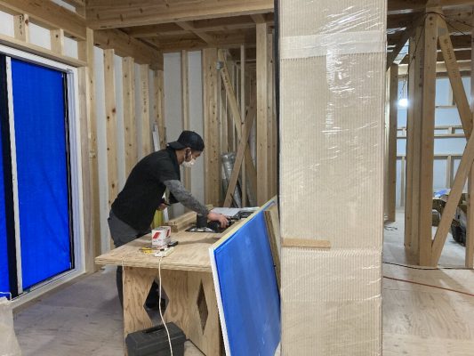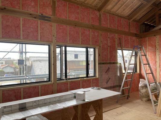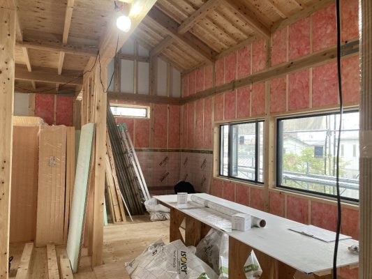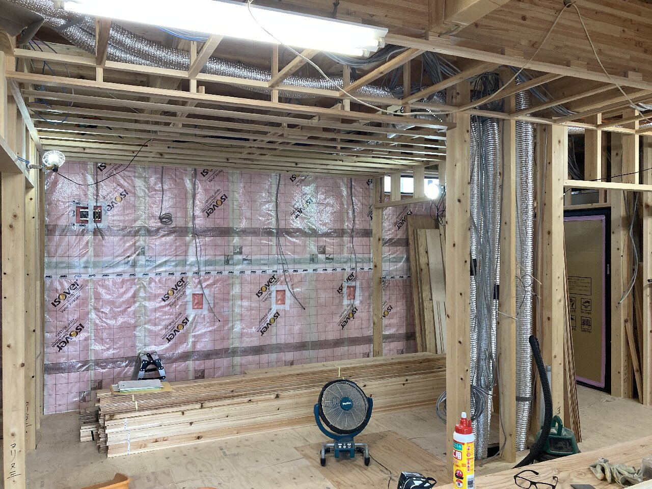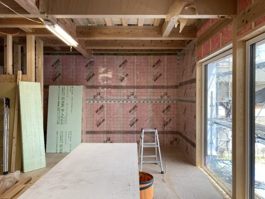 外部の付加断熱入れが終わり、内部から柱と間柱間に入れる充填断熱工事をしています。1階は完了し、気密シートも張り終えています。