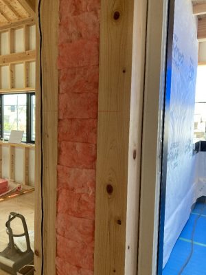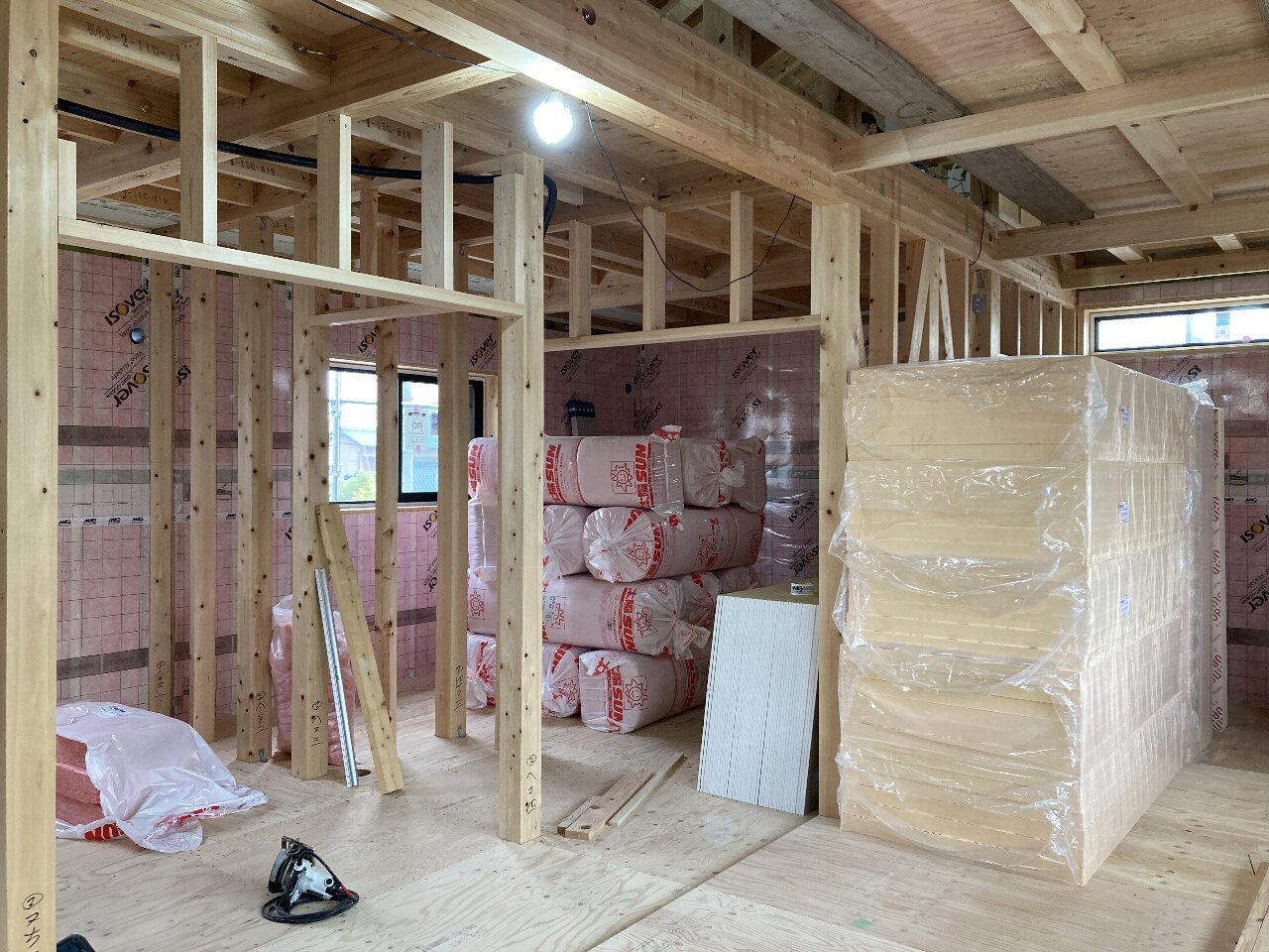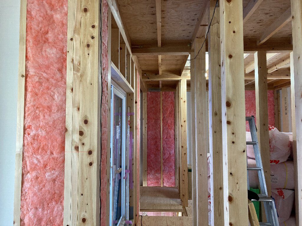2階の断熱材を入れている最中ですが、おや?まだらな入れ方。s井棟梁気分次第で入れてるのかしら?と思っていたら、伸びがついたところ(木造住宅の尺間寸法から+αした柱の間が大きい部分)から入れているそうです。なぜかと言うと、断熱材の幅が決まっていて、この部分は既製品の寸法がぴったり合わない部分で、断熱材をカットしないといけない為、ちょっと手間がかかるのです。「面倒で嫌なところを先に片付けたい!」と、こちらから進めているのだそう👍合点がいきました。