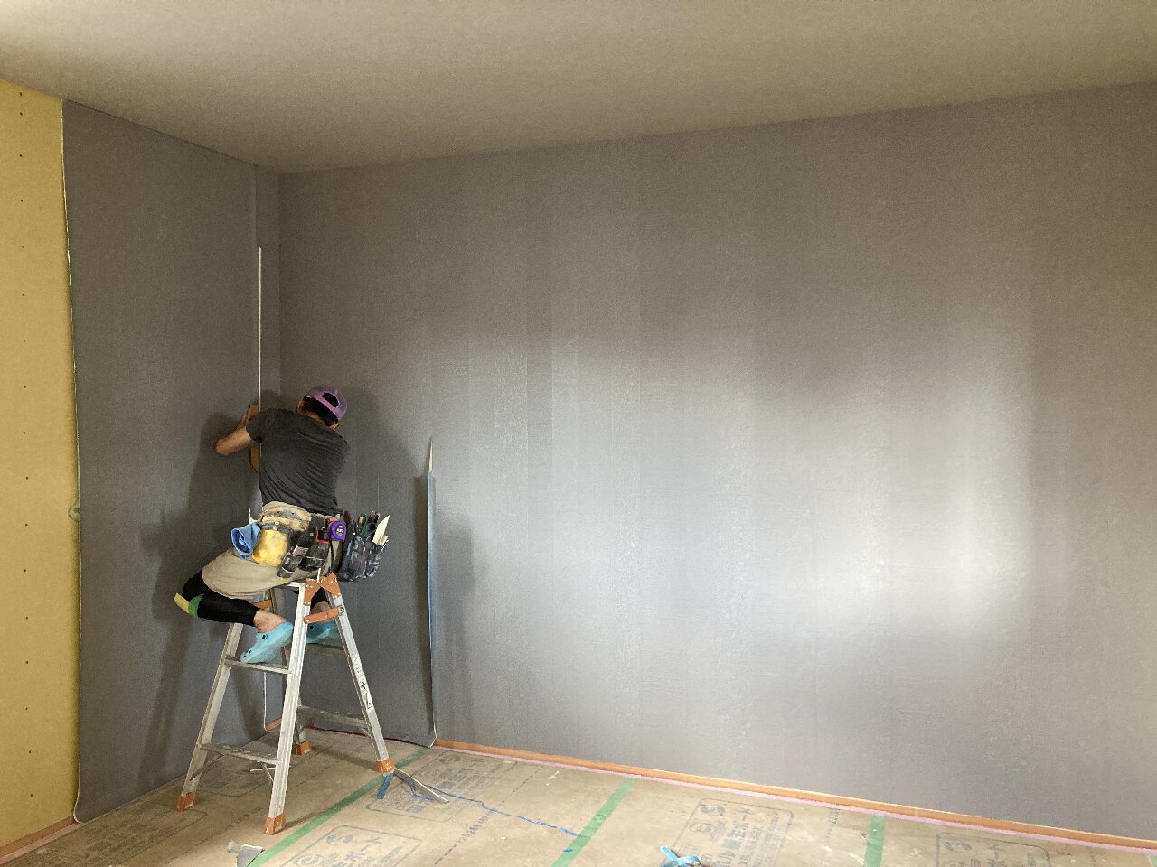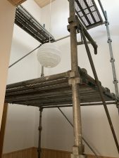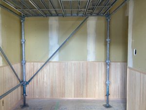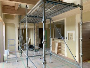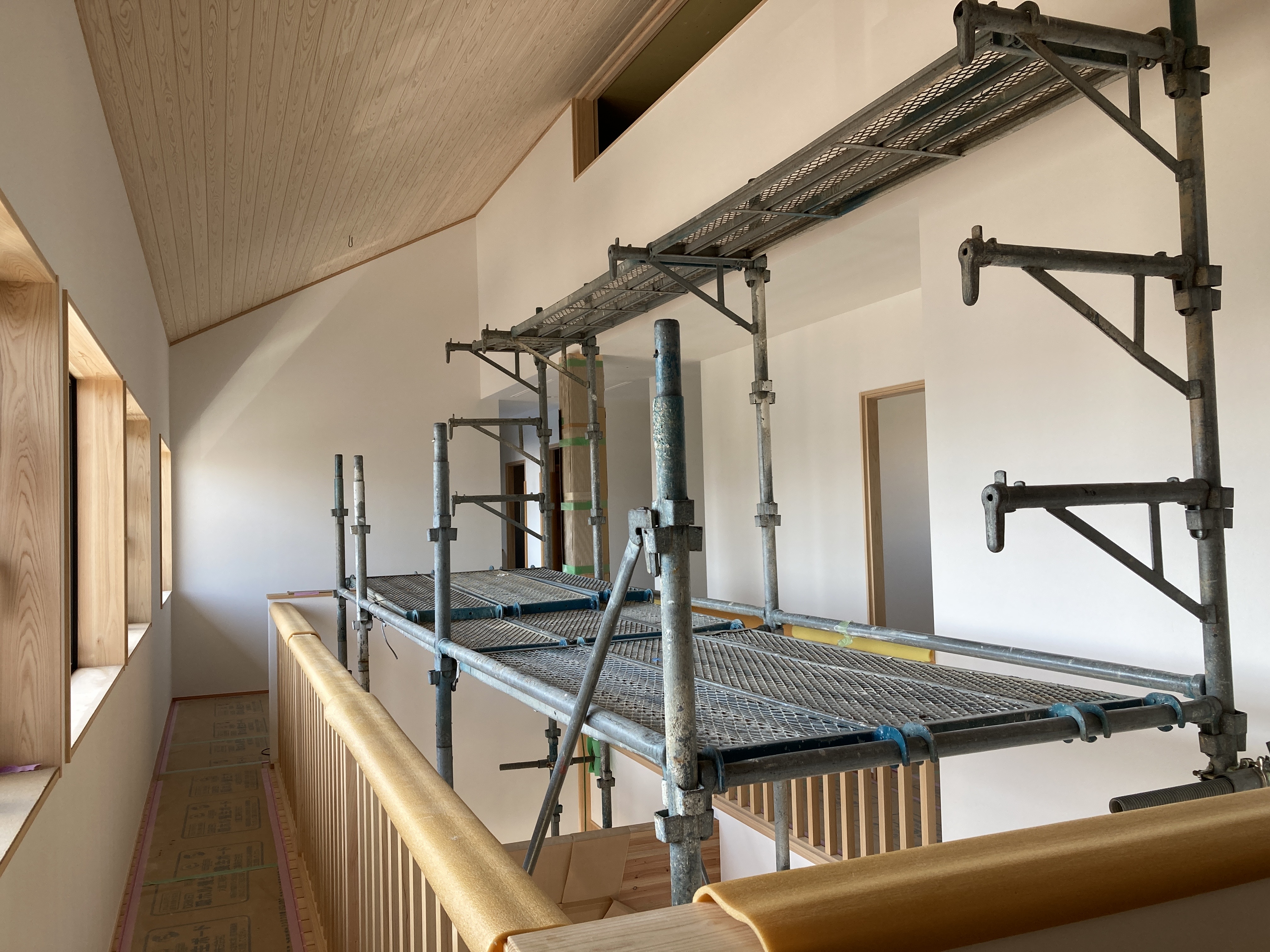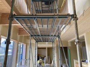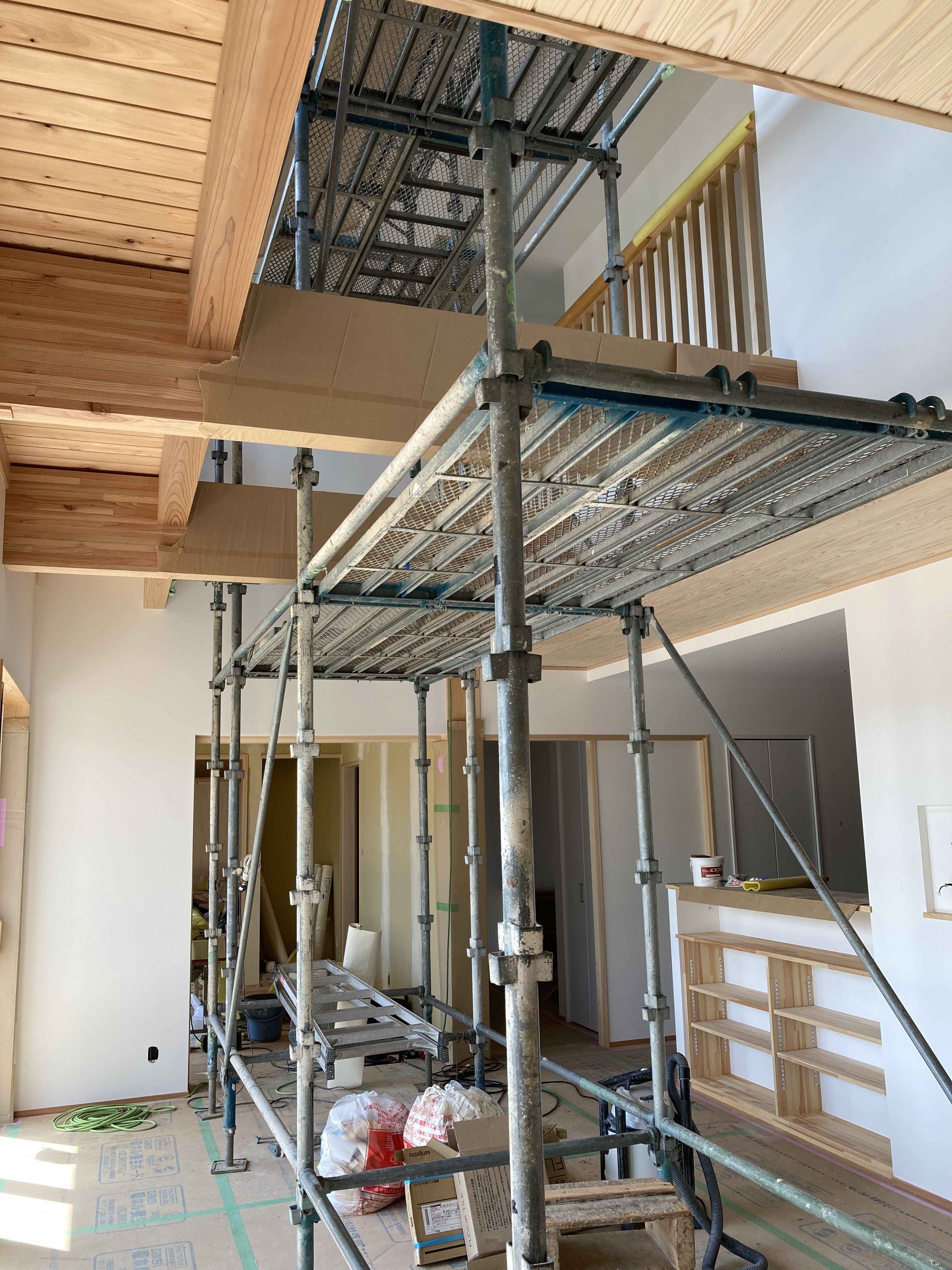 長~い壁ができる吹抜け空間は、脚立でクロスを貼るのは大変です💦なので、この様に足場が組まれています。クロス屋さんも基本一人で1件を仕上げるのですが、ここの部分は応援を呼んで貼るよとの事でした。今の時期はまだ残暑も厳しいので一気に張らないと糊が乾いてしまうのです。