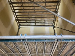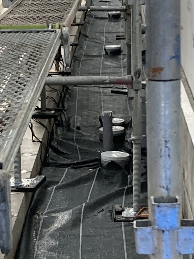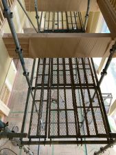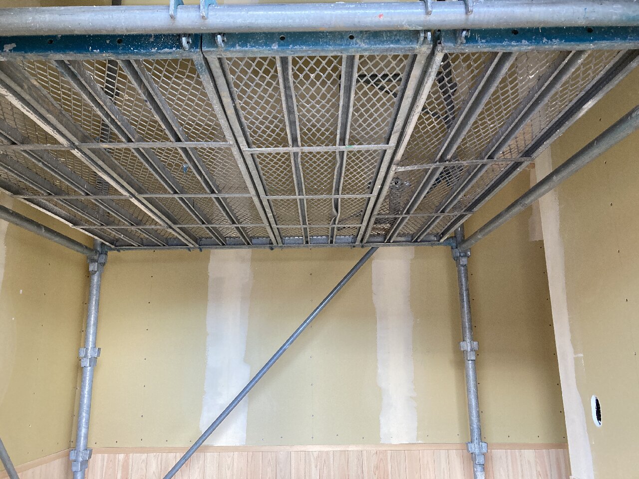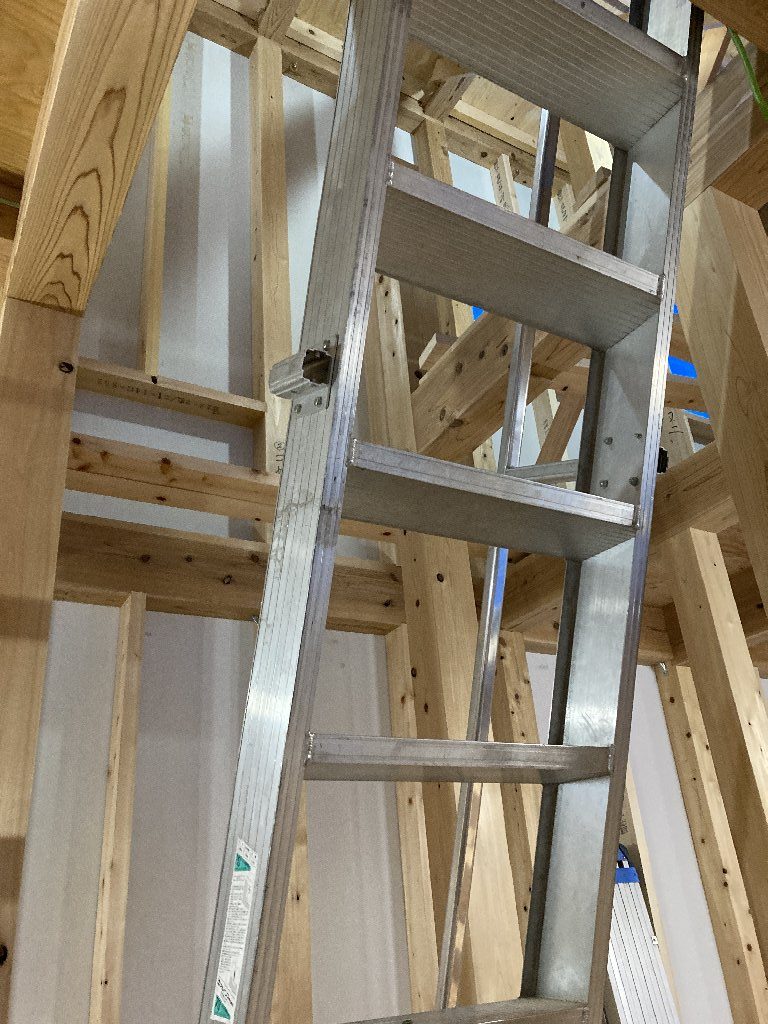 長~い壁ができる吹抜け空間は、脚立でクロスを貼るのは大変です💦なので、この様に足場が組まれています。クロス屋さんも基本一人で1件を仕上げるのですが、ここの部分は応援を呼んで貼るよとの事でした。今の時期はまだ残暑も厳しいので一気に張らないと糊が乾いてしまうのです。