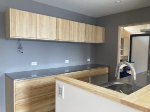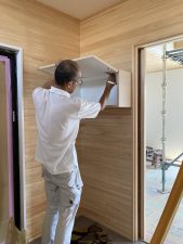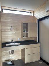 今日は、f木工さんが洗面化粧台を取付にやって来ました。製作家具+オーダーのカウンターは、最近皆さんの憧れですが、お値段も良いので悩まれるところです。そんな中、n様奮発されましたね👍洗面脱衣室は、壁も杉の羽目板を張られているので、奥様のお気に入りの空間になりそうですね。