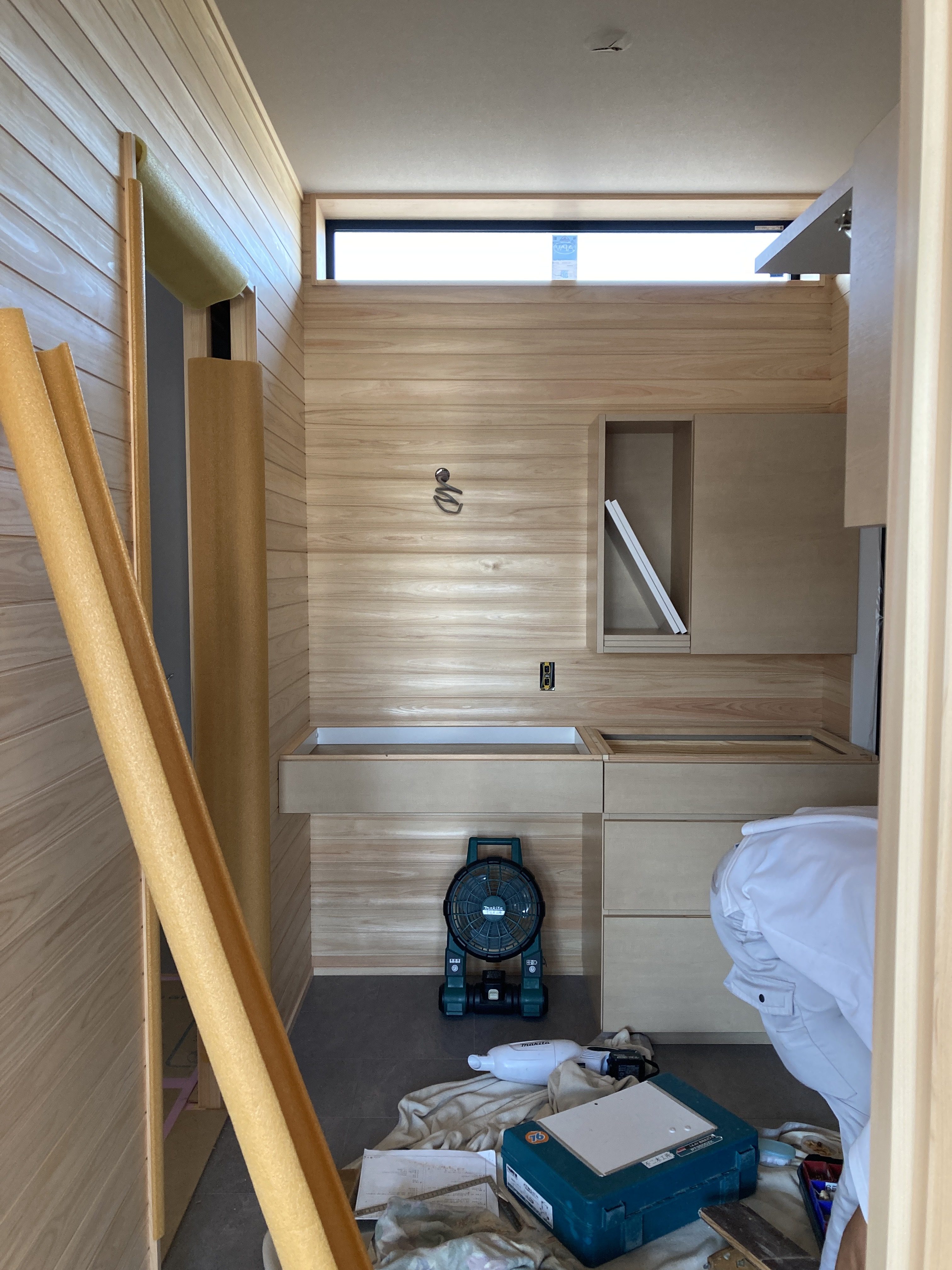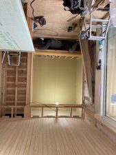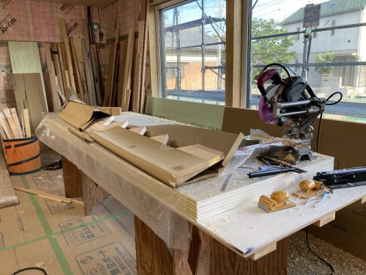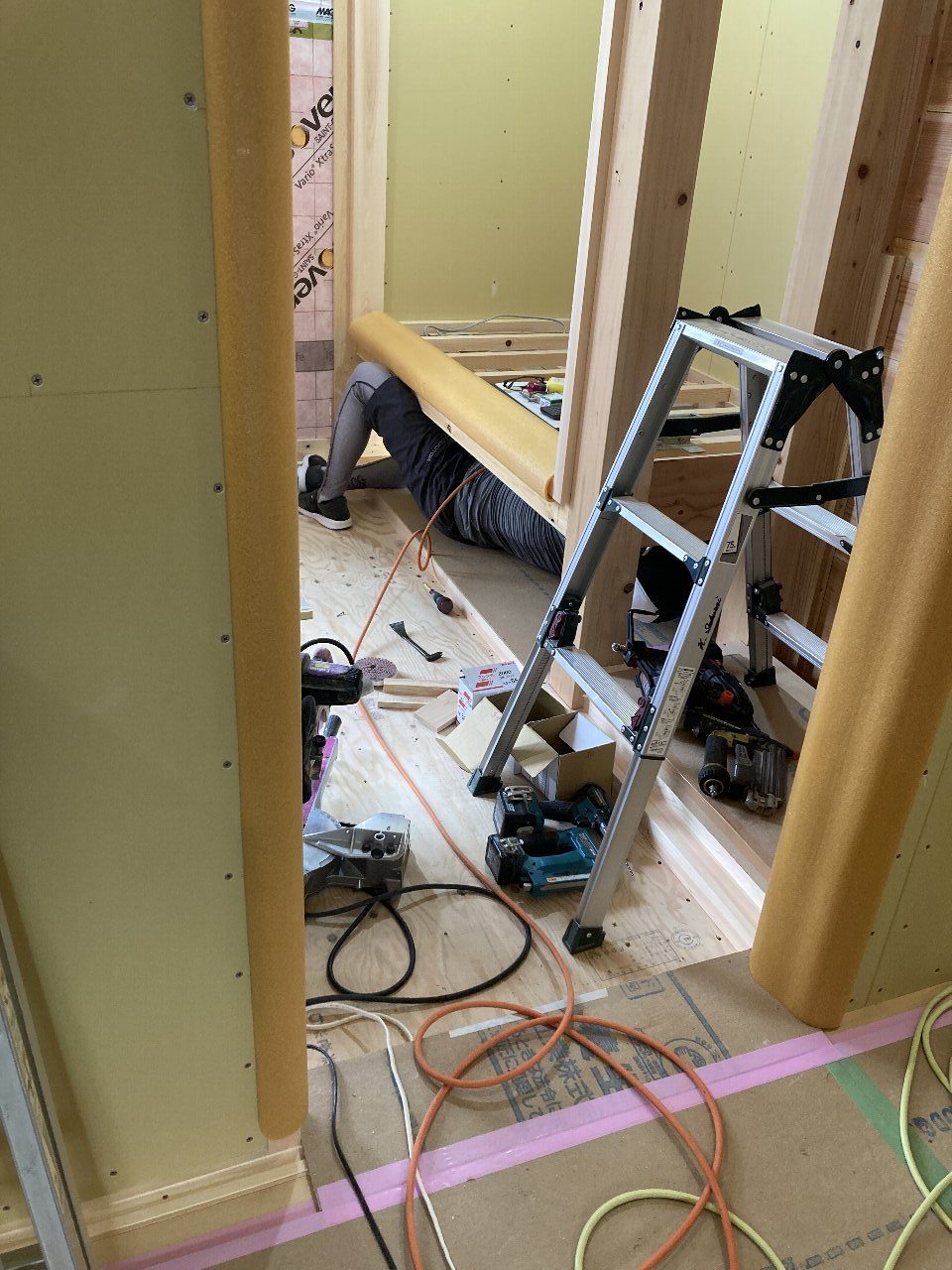 和室で恒例のマトリックスしています!は冗談です。吊り押入を造作中で、押し入れの下に潜り込んでいます👍s井棟梁が和室に取りかかっているので、木工事はあとひと踏ん張りと言ったところです。