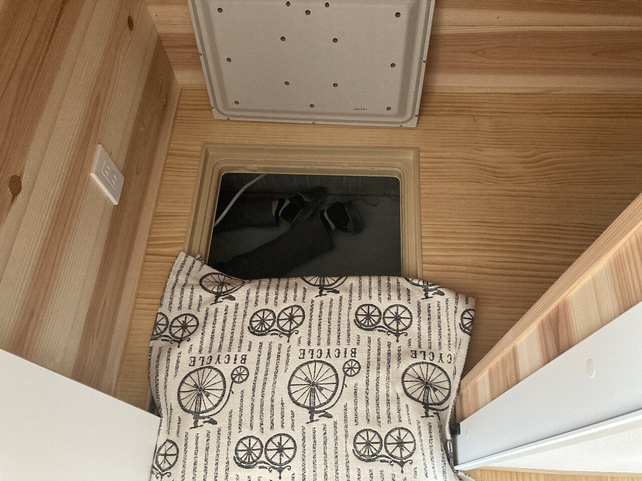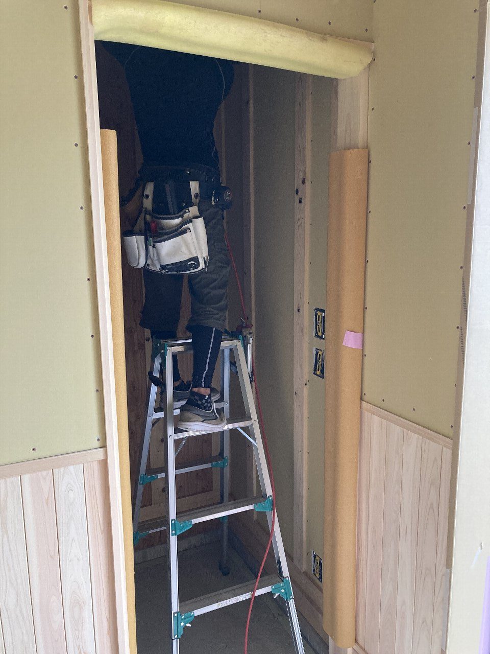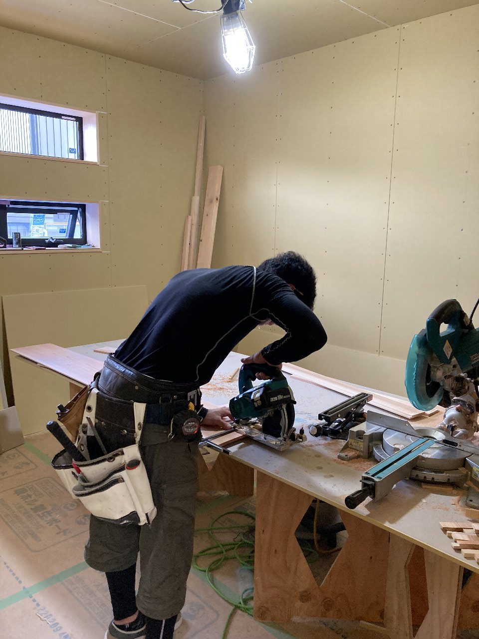 和室で恒例のマトリックスしています!は冗談です。吊り押入を造作中で、押し入れの下に潜り込んでいます👍s井棟梁が和室に取りかかっているので、木工事はあとひと踏ん張りと言ったところです。