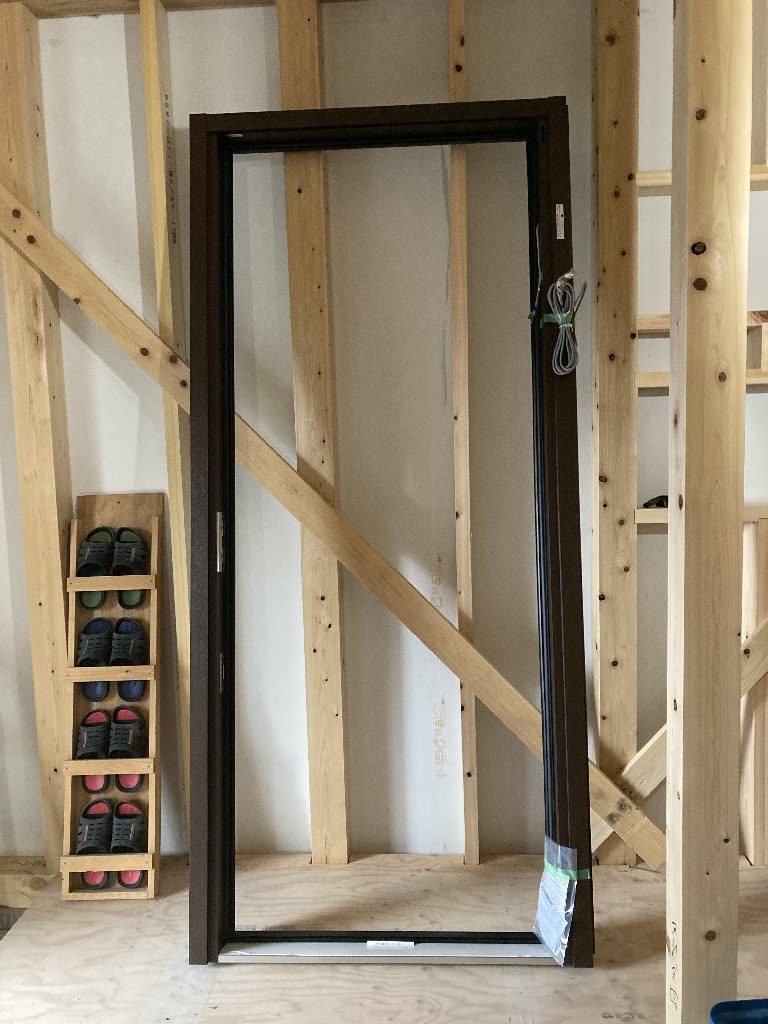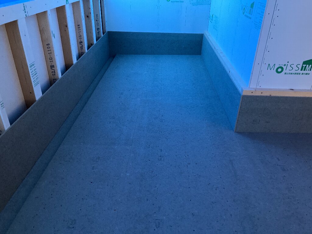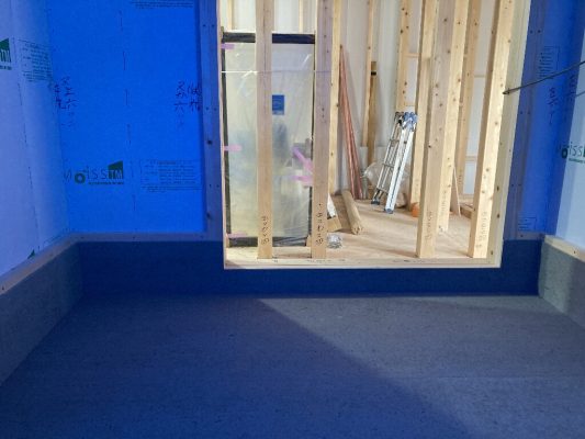 2階の広いインナーバルコニーの下地が出来上がりました。インナーバルコニーなので雨が当たりにくいのですが、サッシの下端は瑕疵保険の規定で所定の高さが必要ですので、サッシの取付高さも注意が必要になります。