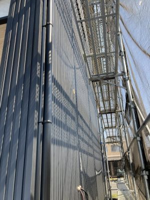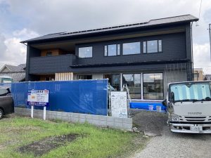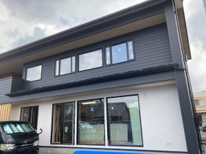 足場が外れ、建物全体が見えるようになりました。真っ黒ではない、黒に近いグレー色のガルバはなんとなく青くも見えたり。かっこよくなりましたね👍今日は、1階部分のジョリパッド塗りをy口技建さんが仕上げに来ています。
