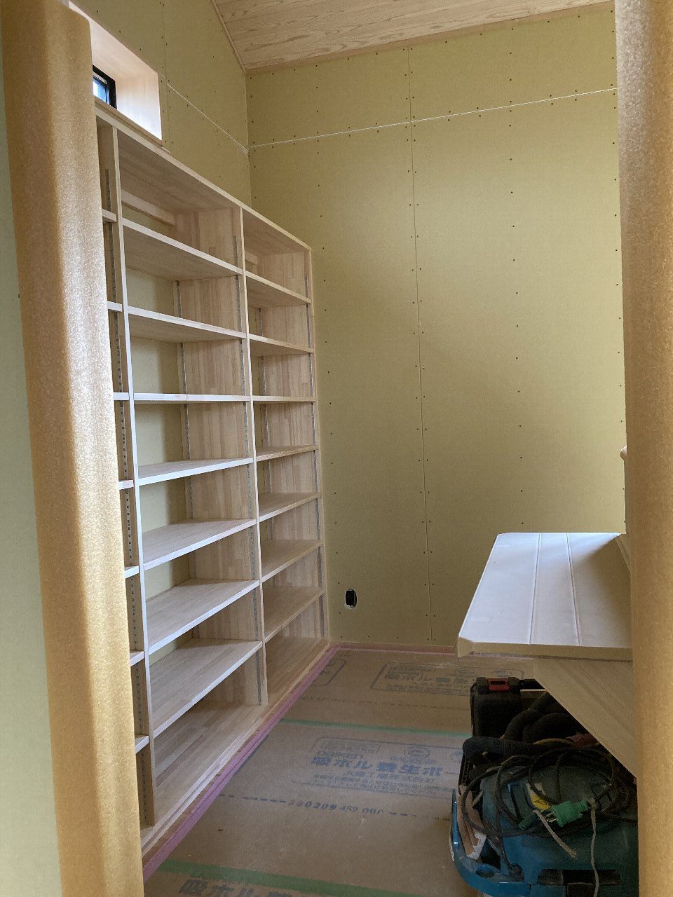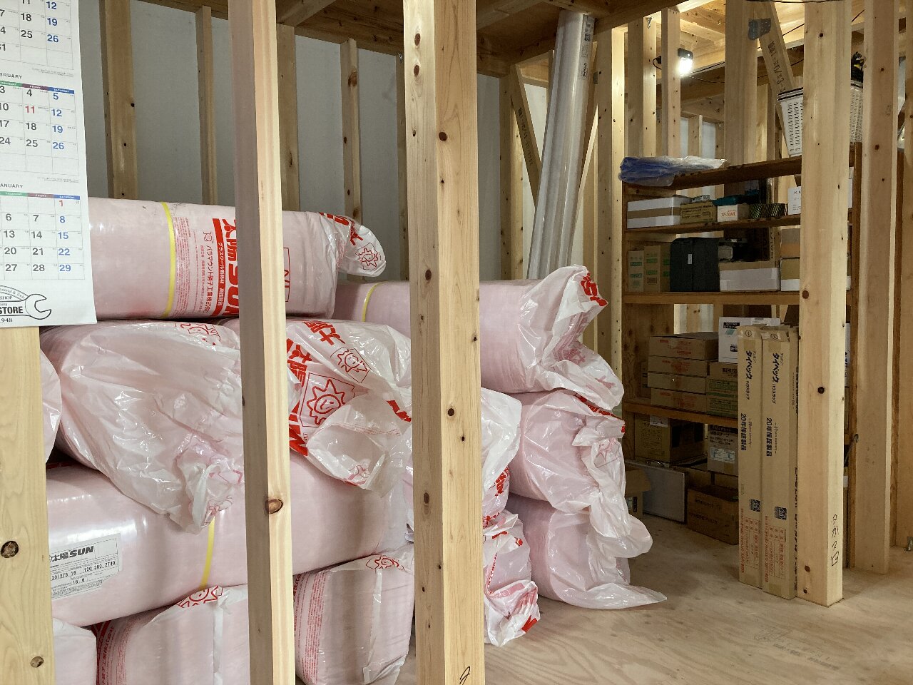 棟梁を追い込むかのように、充填断熱用のグラスウール120㎜が搬入されています。あら!噂の資材棚も完成しています。キレイ~👍