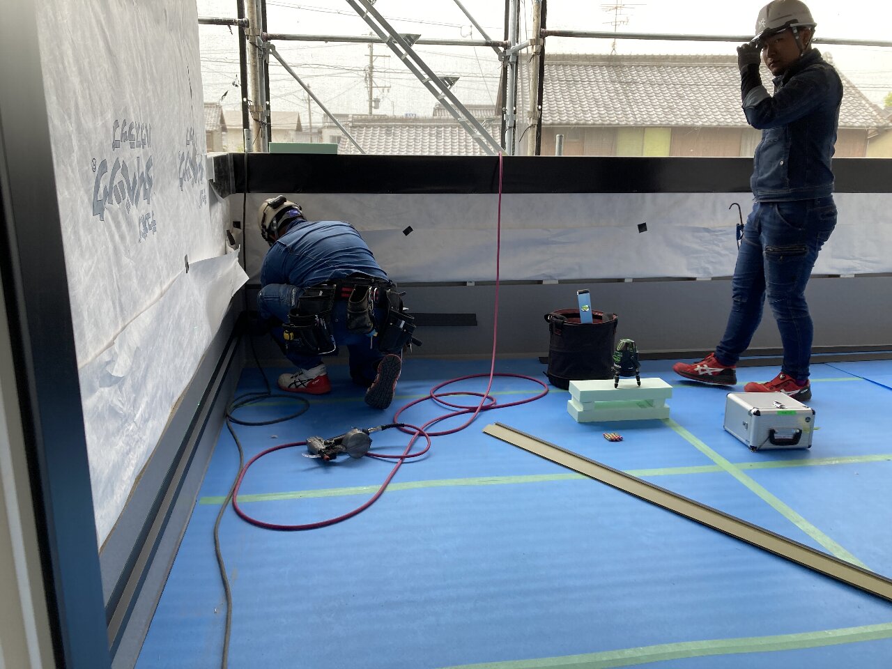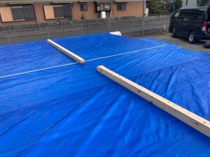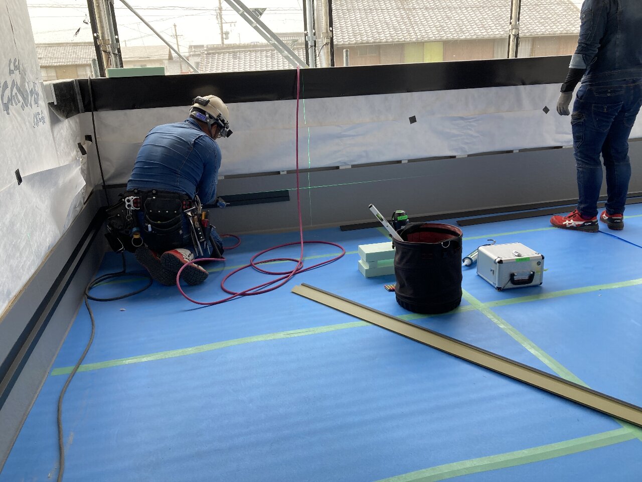 剛床を敷設後、養生テープを張り、1週間後に控えた上棟までブルーシートで守られます。