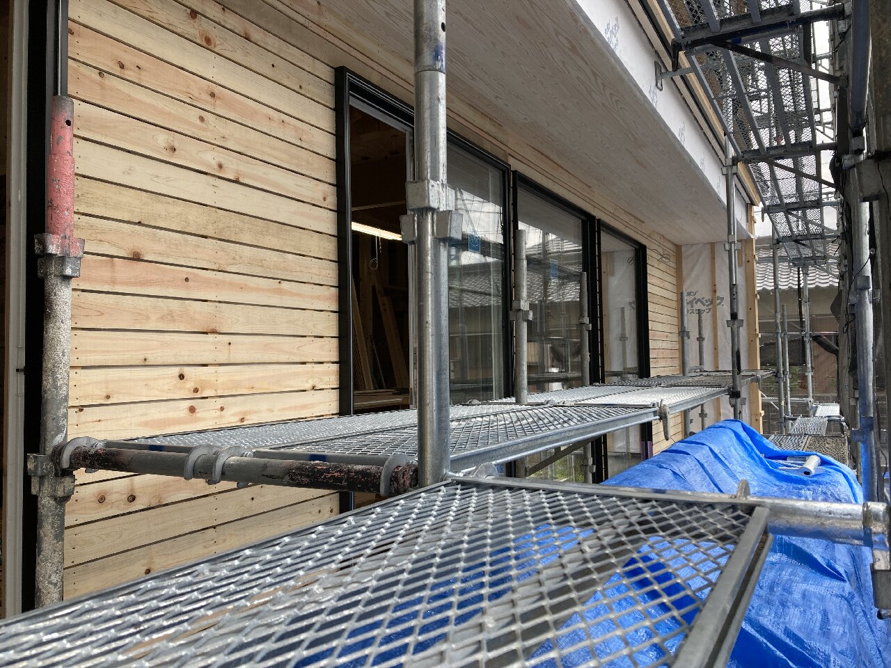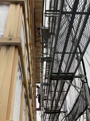 軒裏の羽目板、インナーバルコニーや玄関廻りの外壁の羽目板も張り終わっています。
