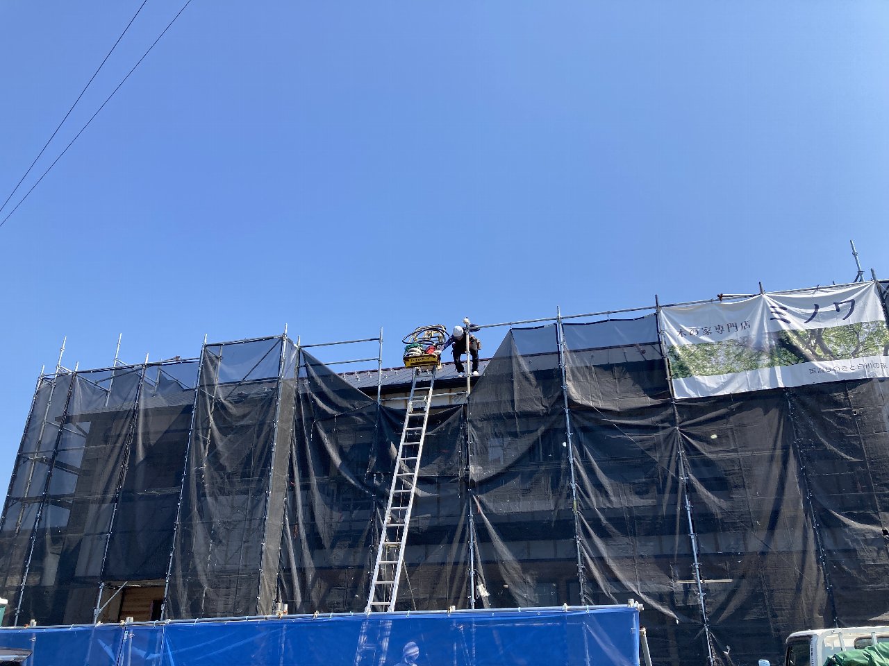 今週は雨が続く予報から一転、今日は急に晴れました👍この晴れの日を逃すまいと、y江板金さんがやってきました。今日は横張り部分を張っています。
