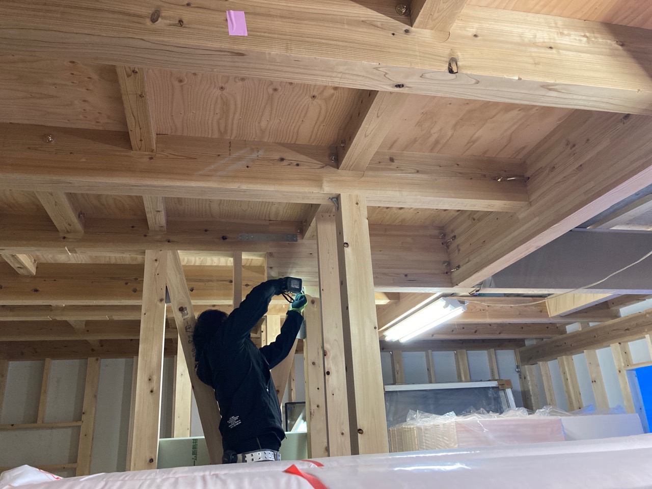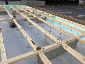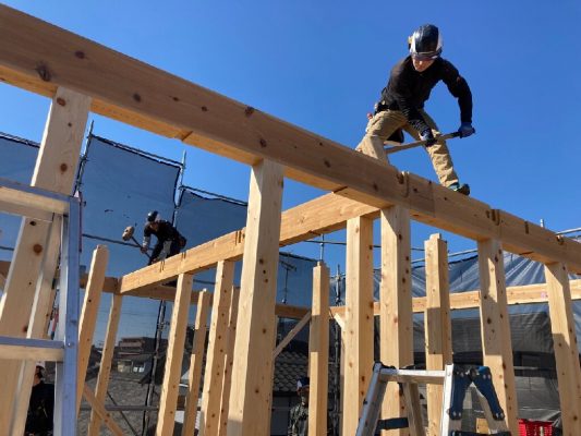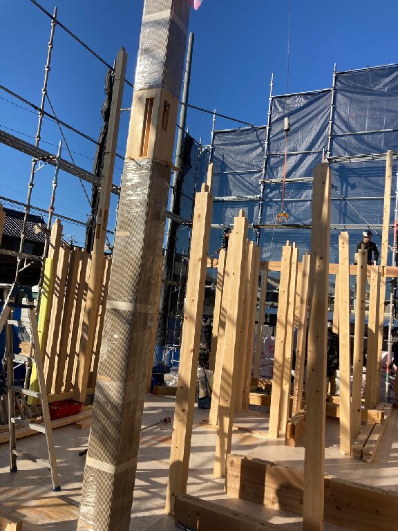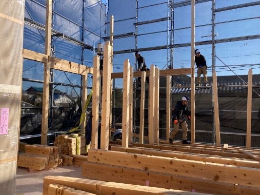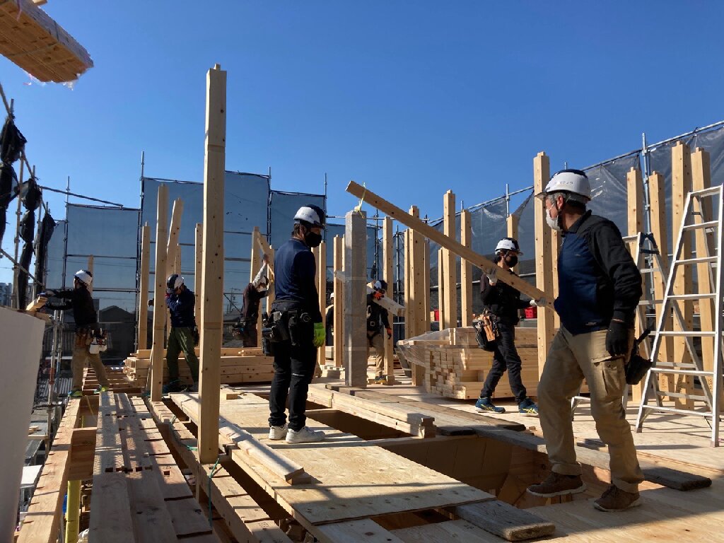 剛床が張り終わると、2階の柱を建てていきます。n様邸は、1階リビングダイニングが大きな吹抜け空間です。東西に長い建物なので、日当たりはバッチリですね👍