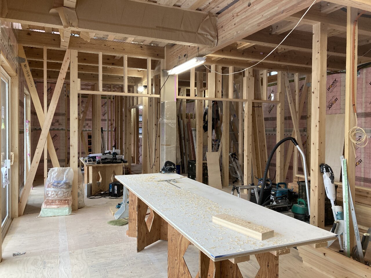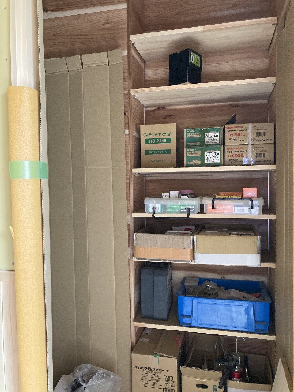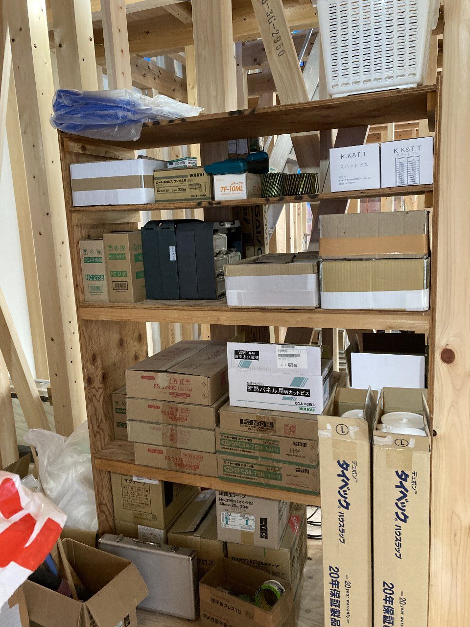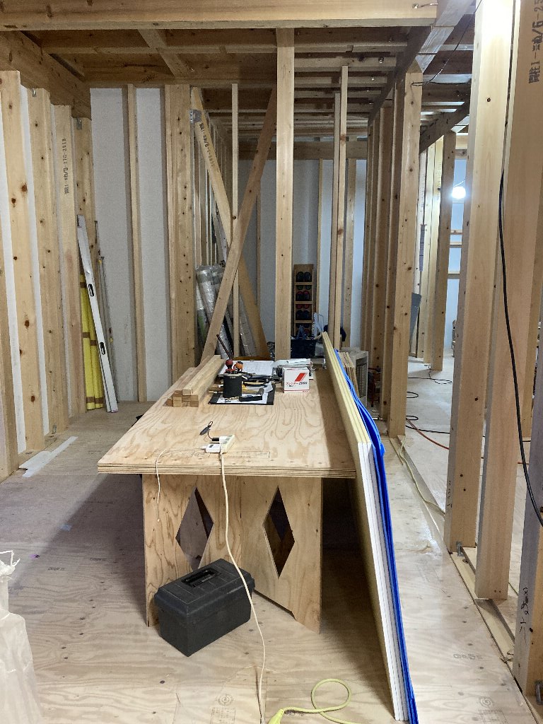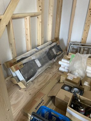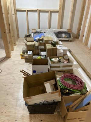 明日は、f井電気のh場さん、n様と現場で電気配線の打合せです。キレイ好きのs井棟梁、動き回りやすいように整理整頓をしています。「なんか、物が多いんだよね」と言いながら、棚こそありませんがきちんと物の住所を決めて、すっきり整頓完了です👍「きれいだと気持ちいいですね」と声をかけると、「うん」とにっこり。かわいいs井棟梁なのです。