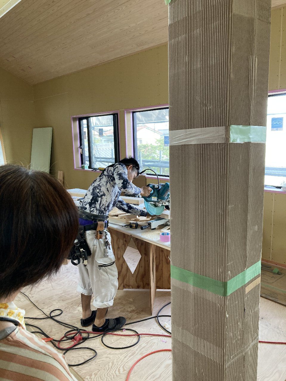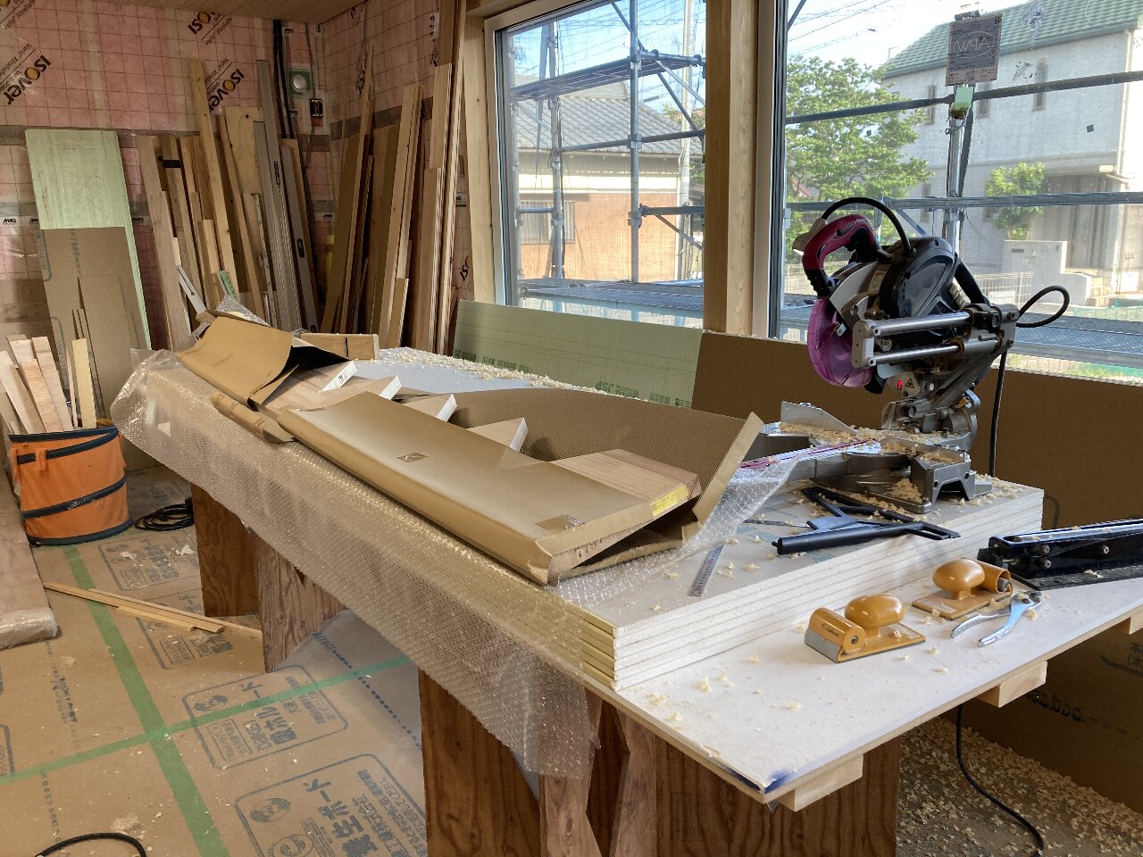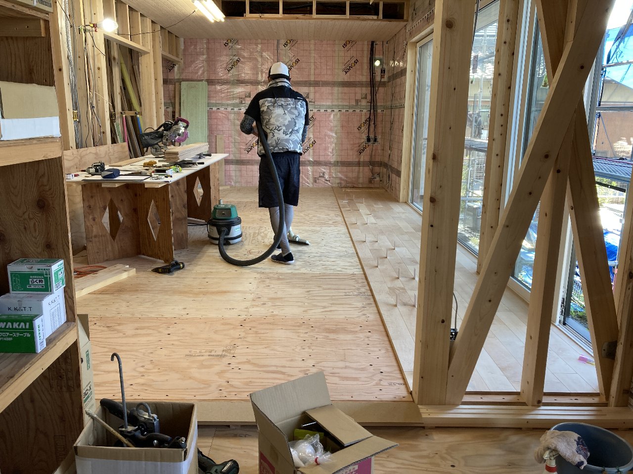 明日は、f井電気のh場さん、n様と現場で電気配線の打合せです。キレイ好きのs井棟梁、動き回りやすいように整理整頓をしています。「なんか、物が多いんだよね」と言いながら、棚こそありませんがきちんと物の住所を決めて、すっきり整頓完了です👍「きれいだと気持ちいいですね」と声をかけると、「うん」とにっこり。かわいいs井棟梁なのです。