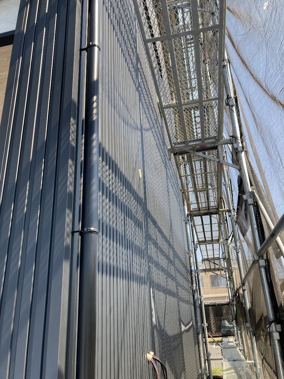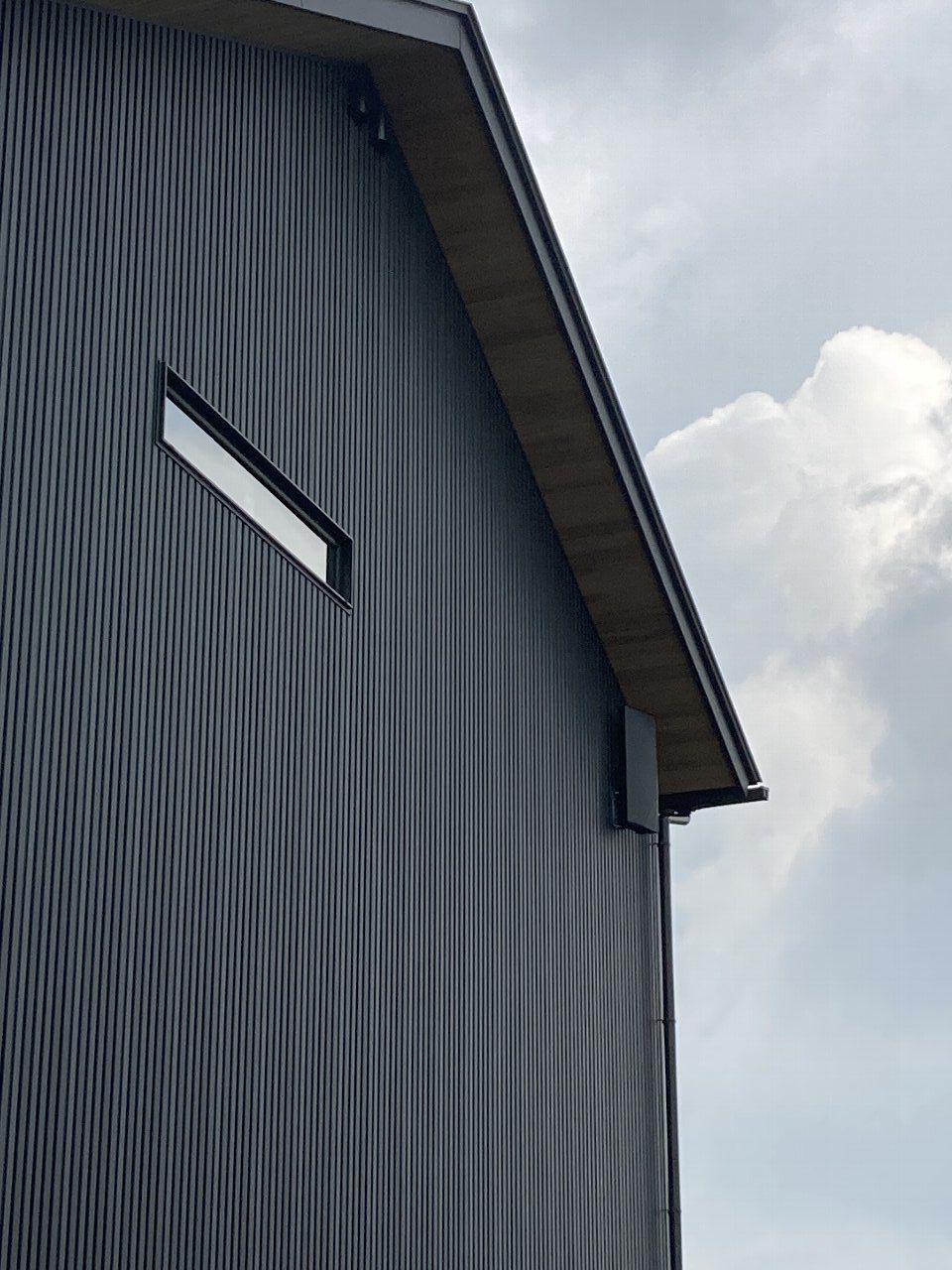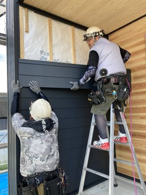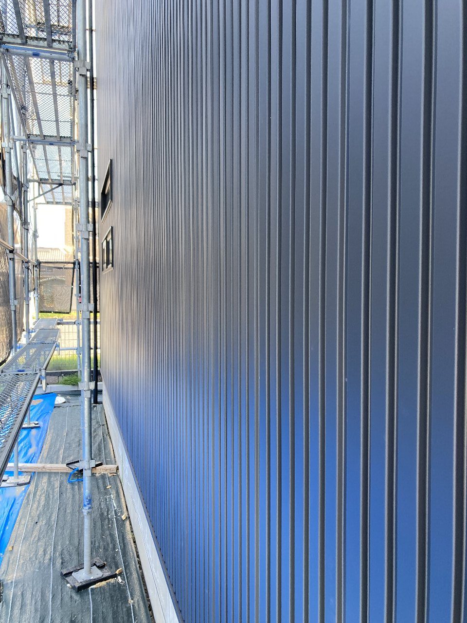 y江板金さんにより、外壁のガルバリウム鋼板は、張り終わりました👍横張りは折り目が大きいのでスッキリとした印象になります。