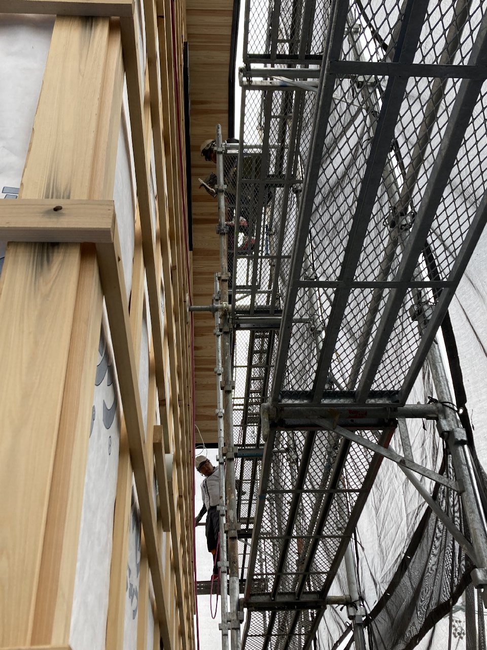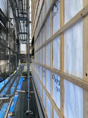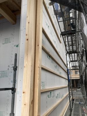 外壁下地がほぼ終了しています。n様邸は外壁は3種類。全体はガルバリウム鋼板をタテに張りしますが、通りから見える南面は、ジョリパッドや杉の羽目板張り、ガルバリウム鋼板横張りの為、下地も仕上げによってそれぞれ違ってきます。